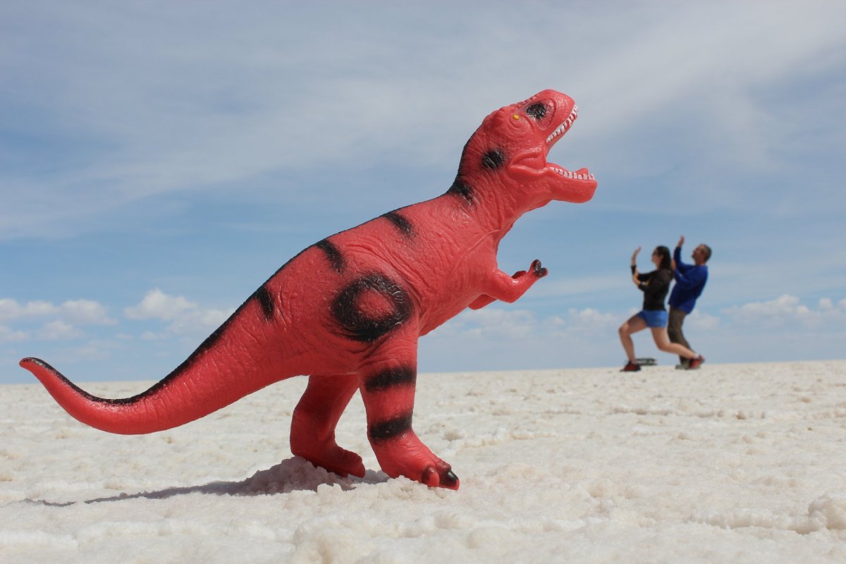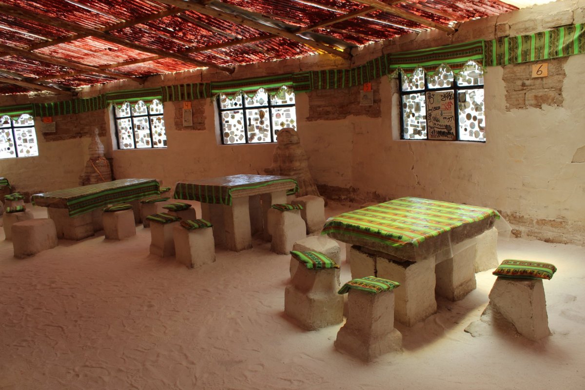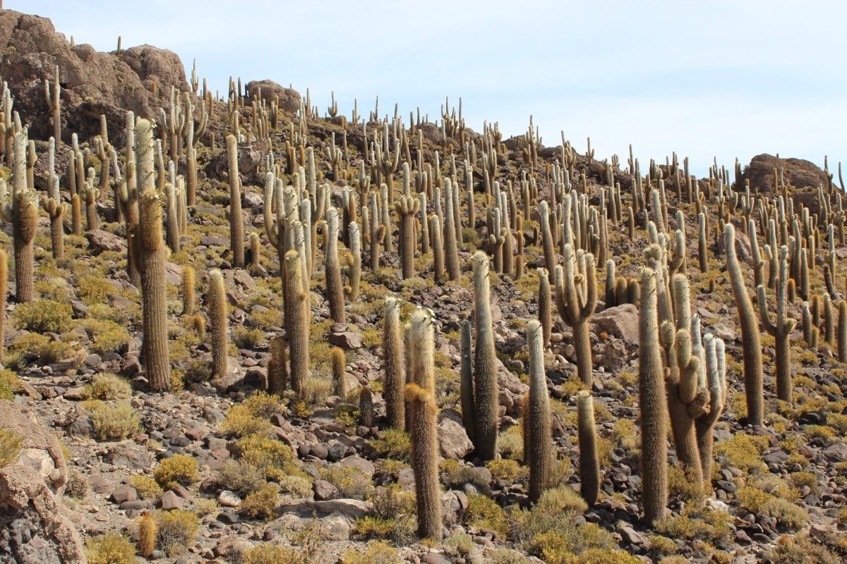 Je zde hromada vlajek, českou hledám marně, ale aspoň s tou slovenskou se fotím, no co, dřív jsme byli jeden národ. Poté dostaneme oběd – maso, rýže, zelenina, banán a k pití kola nebo voda. Hotel je postaven ze soli a na sklech jsou samolepky expedic. Marně hledám tu trabantí nebo Dominiku na cestě, ale najdu samolepku Kolem světa žigulíkem a ávií. Fotím si pokoje a přemýšlím, jaké všechny hotely už na světě jsou – ze soli, ledu, prosklený, v korunách stromů, pod vodou. Dalším stanoviště je uprostřed pláně, kde se můžeme pokochat krásou a udělat si kýčovité panoramatické fotky. Proč většina agentur fotí s dinosaurem, netuším. Ostrov kaktusů je kouzelné místo hned za „rohem“. Už u vstupu mě pobaví nápis „no ticket, no toillet“. Platíme v přepočtu 90 korun a můžeme si projít ostrov. Je zde i jeden pes a několik ptáků. Poslední zastávkou je západ slunce se skleničkou vína v ruce. No, já bych ocenila spíš něco k jídlu než alkohol. Po návratu se vydáváme zahnat hlad. Zatímco mě už hlad skoro přešel, Marka skolily chutě, a když zahlédne obrázek špízu, tak neodolá. Dostává tak velkou porci, že poprvé za celou dobu po jídle nechce žádné cocino, dezert po jídle. Doma se dozvídám, že naše jízdenka na další den ráno do La Paz byla zrušena. Goooglím a snažím se zjistit situaci v Bolívii a co budeme vlastně dělat. Hledám možnosti, jak to objet. Cítím se uvězněná a unavená, usoudím, že ráno moudřejší večera a jdu se na to vyspat.