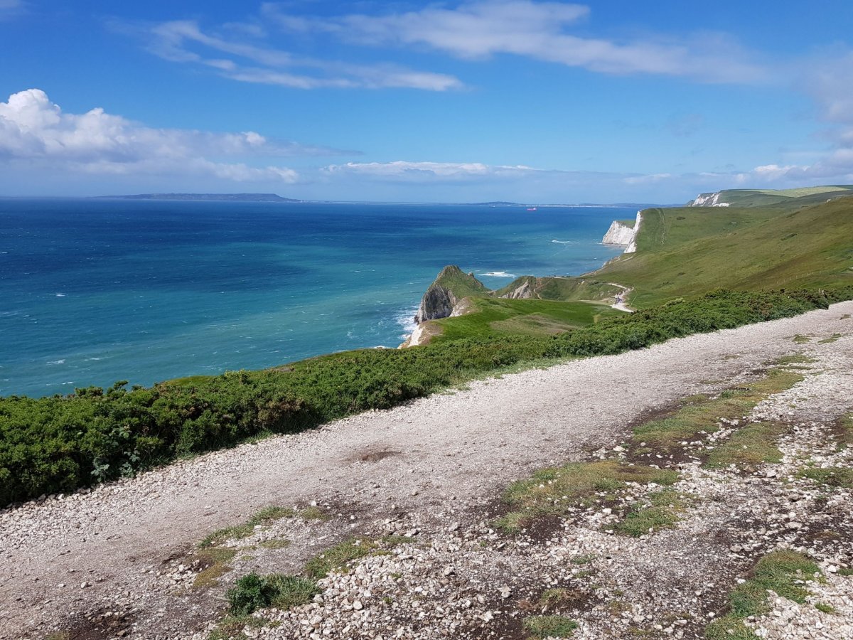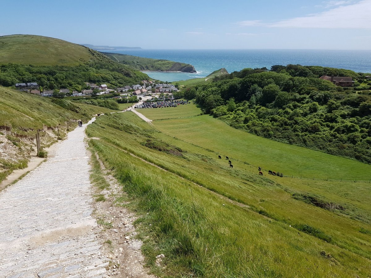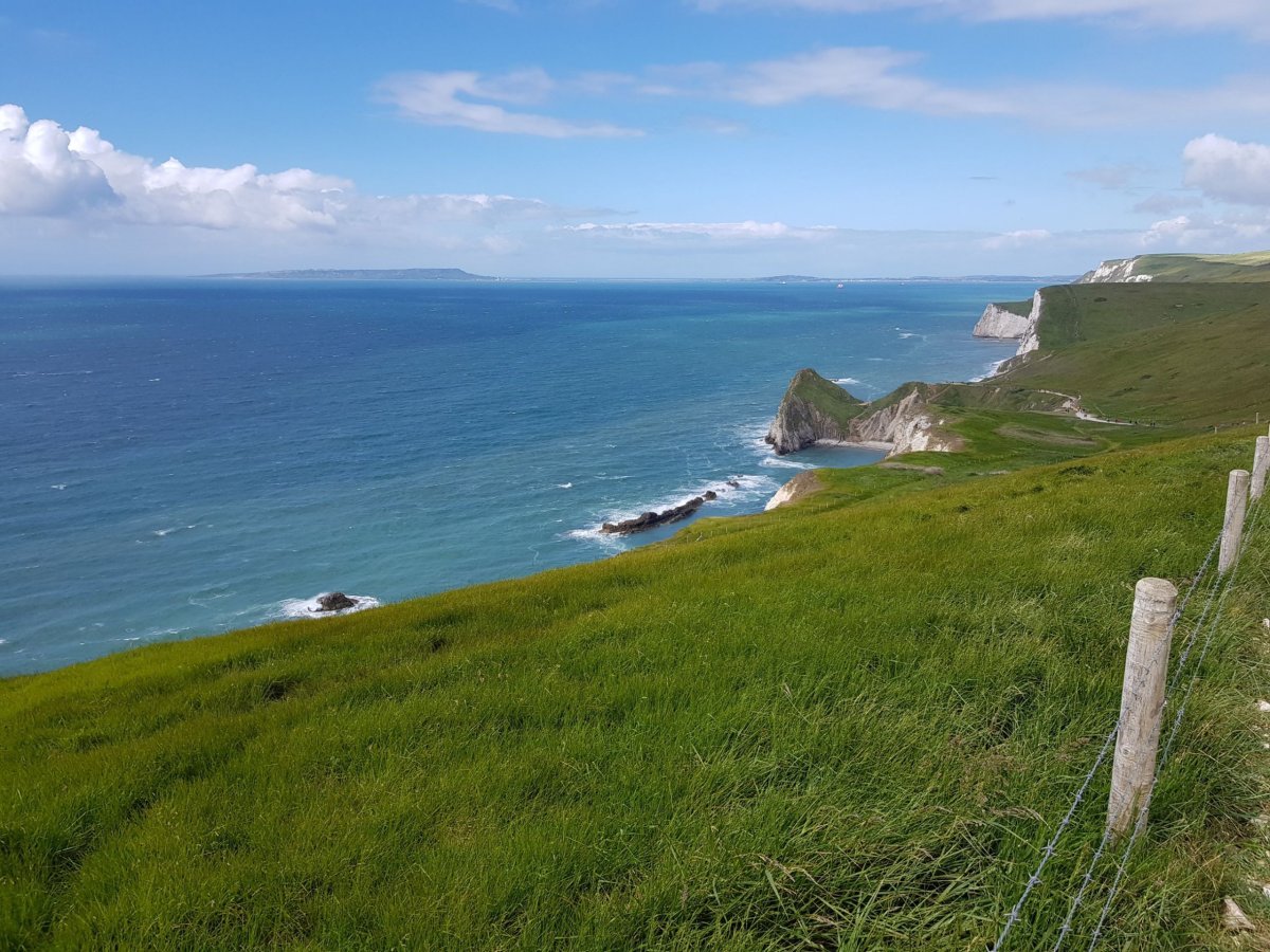 My začali od konce a vystoupili u visitors centra v Durdle door. Za vstup se nic neplatí a po zdolání pár kopečků se začnou rýsovat první výhledy.