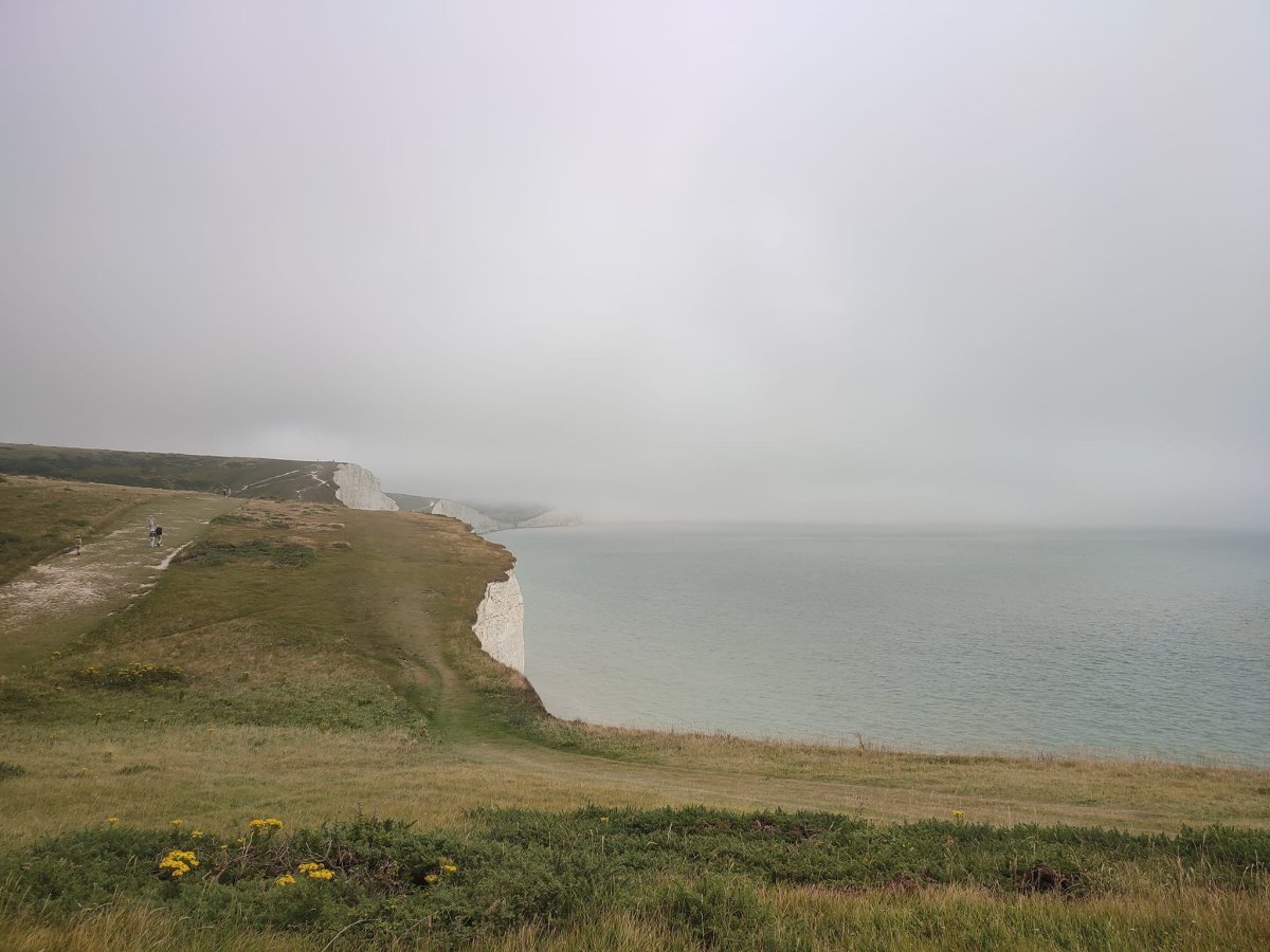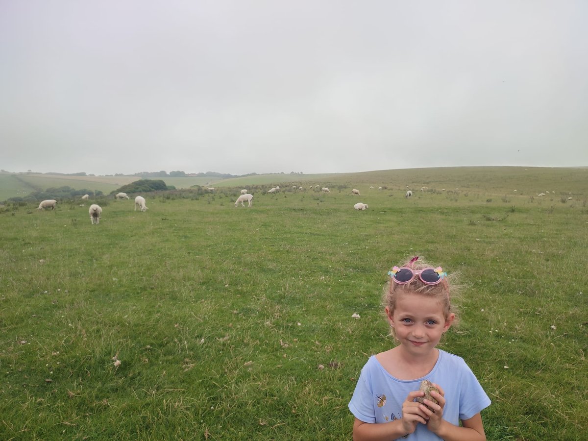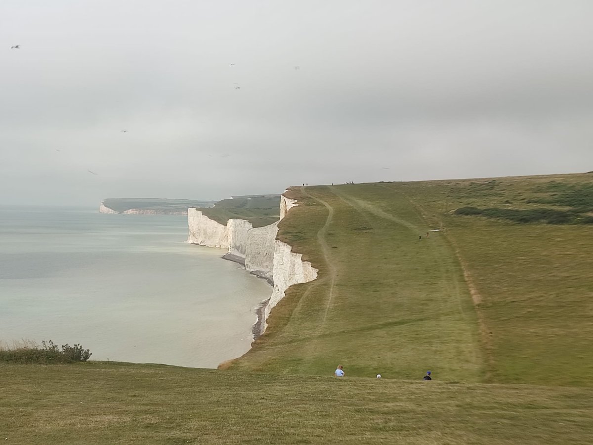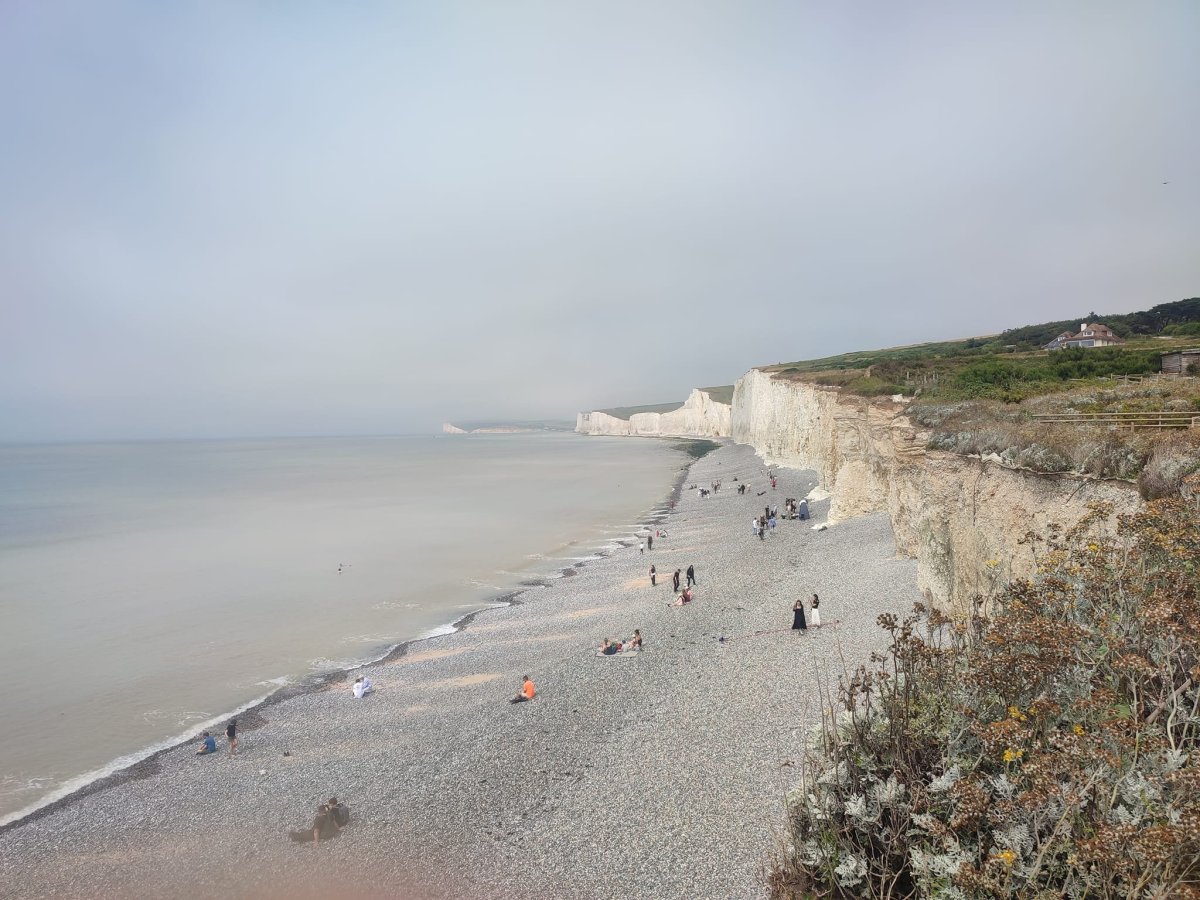 Tak jsme vyrazili na cestu. Většina lidí a turistů směřujících sem vystupovala právě na zastávce Seven sisters park center. Já bych to nedoporučovala, krom toho, že tam hned od začátku bylo hodně lidí, tak pokud se chcete projít po útesech na druhou stranu, tak vás sice čekají menší sestupy ale výstupy na celkem strmé kopce. Pokud vyrazíte z opačného směru, tak krom startu s méně lidmi, je stoupání a sestupování naopak. Stoupáte do mírných kopců, ale sestup by se dal sjet po zadku. My tedy vystoupili až na zastávce East Dean Garage a odtud se vydali k pobřeží. Dolu k moři se dá sejít po schodech, které tam jsou postaveny. Na místě je i parkoviště, menší obchůdek a zmrzlina. My si šli dát nejprve odpočinek na pláž a pak vyrazili na trasu přes útesy Seven sisters. Jelikož je mamka po operaci po otevřené zlomenině kotníku, bylo mi jasné, že trasu celou nezvládneme. To ale nevadí, v průběhu trasy je několik cest, kdy se můžete odklonit a dostanete se zpátky k hlavní silnici odkud jezdí pravidelný autobus a to byl i náš plán. Slezli jsme asi tři vrcholy a pak se otočili k moři zády a vyrazili zpátky na autobusovou zastávku. Je dost pravděpodobné, že budete muset otevřít branku ohrádky a procházet přes stáda pasoucích se oveček. Tudy ale ty turistické cesty vedou a tak to je. Po chvíli jsme dorazili na autobusovou zastávku Pond odkud nám jel autobus zpátky do Brightonu.