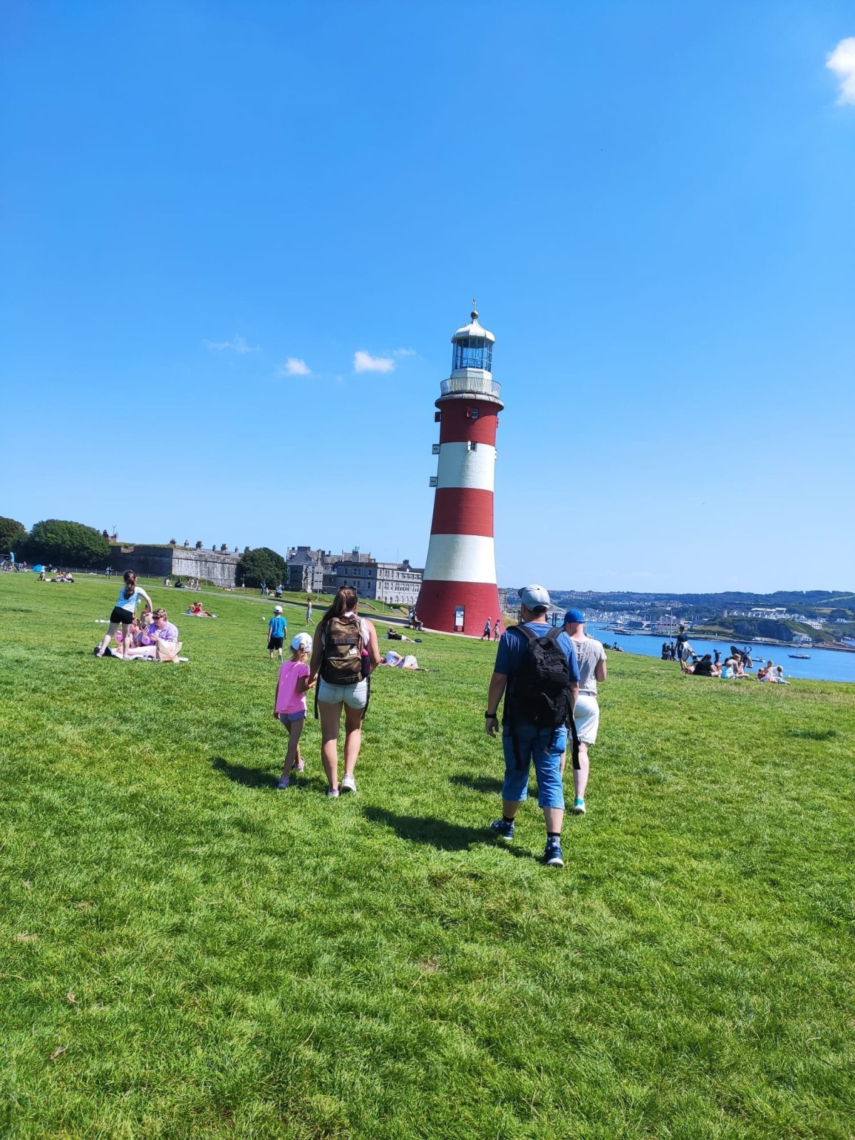 Ze Salisbury jsme vyráželi dopoledne a někdy po obědě už jsme vystupovali na nádraží v Plymouthu. Na ubytování jsme se pak museli dostat autobusem, protože bylo celkem daleko a navíc začala být horka a s kufry se nám nechtělo táhnout. Počasí na následující 2 dny hlásilo kolem 30 stupňů, tak jsem se rozhodli udělat spíše nenáročný plán. První den jsme prošli město, přístav (kde se děti trochu okoupaly), nesměla chybět návštěva majáku Smeaton´s tower a památníku Mayflower. Tady jsme pak narazili na výletní lodičky, které několikrát za den jezdili na asi 30 minut po moři vzdálenou pláž Cawsand beach. Jelikož celý další den mělo být kolem třicítky, rozhodli jsme se jeden den věnovat válení na pláži. Druhý den jsme tedy vyrazili do přístavu. Loď vyplouvala každou hodinu a půl, nebylo třeba dopředu rezervovat, jen se nastoupilo a po vyplutí vás obešel pán s terminálem s platbou 6 liber za dospělého a 3 libry za dítě za jednu cestu. Pláž byla ale dost narvaná k prasknutí. Nakonec jsme přeci jen nějaké místo ulovili a zbytek dne strávili odpočinkem a koupáním (i když oceán byl celkem studený, takže vždy jen na chvilku). Přímo na pláži byla restaurace a stánek se zmrzlinou.
