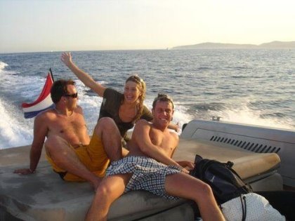 Třetí den ve Francii je slíbené flákání a jízda na jachtě. Dorazíme na nejhezčí pláž v Monaku s názvem La Maga, kde se koná svatba známých od Gabány otčíma. V plážové restauraci mají hostinu, které se mi s Richardem pochopitelně neúčastníme. Kupuju si zde Marlbora a vodu za 15,- eur a odcházím na pláž. Měl jsem to nechat napsat na účet, když se mi číšník ptal jestli "Aqua" je mé jméno :-D Během jejich hostiny poleháváme na pláži s občasným osvěžením v moři. "Attencion medůza" jsem nějak přeslechl a jedna mě žahla. Po dvou hodinách se kompletujeme a na pobřeží nasedáme do člunu. My a několik oslavenců ze svatby jede s námi extrarychlou lodí až do přístavu. Za tmy se vracíme na barák a finišujeme přípravy k odjezdu dál. Nějak se to ovšem komplikuje. tady nám dochází, že celá tahle předehra byl vlastně jen takový komplot jak zaplatit část cesty a dostat Evičku na prázdniny do Francie. Ani se nehádáme, spíš jen nevěřícně koukáme, když nám Gabána starší oznamuje, že její dcera zůstává a že nás ráno hodí na vlak. Auto si prý taky musí nechat. A jestli chceme stan, tak nám ho za zálohu 100,- Eur půjčí. Přišli jsme teda o auto, o společnici a já o 5 tisíc, které jsem za Gabánu do společného rozpočtu dal. Byla to půjčka, ale dodnes jsem samozřejmě peníze ani Gabány neviděl. Mladá podle všeho nyní žije v Miami a starší si nejspíš užívá luxusu nadále ve Francii. Umí si to holky dobře zařídit, jen co je pravda. Tomu se nejde teď než zasmát a smáli jsme se tomu vlastně už i tenkrát :-)