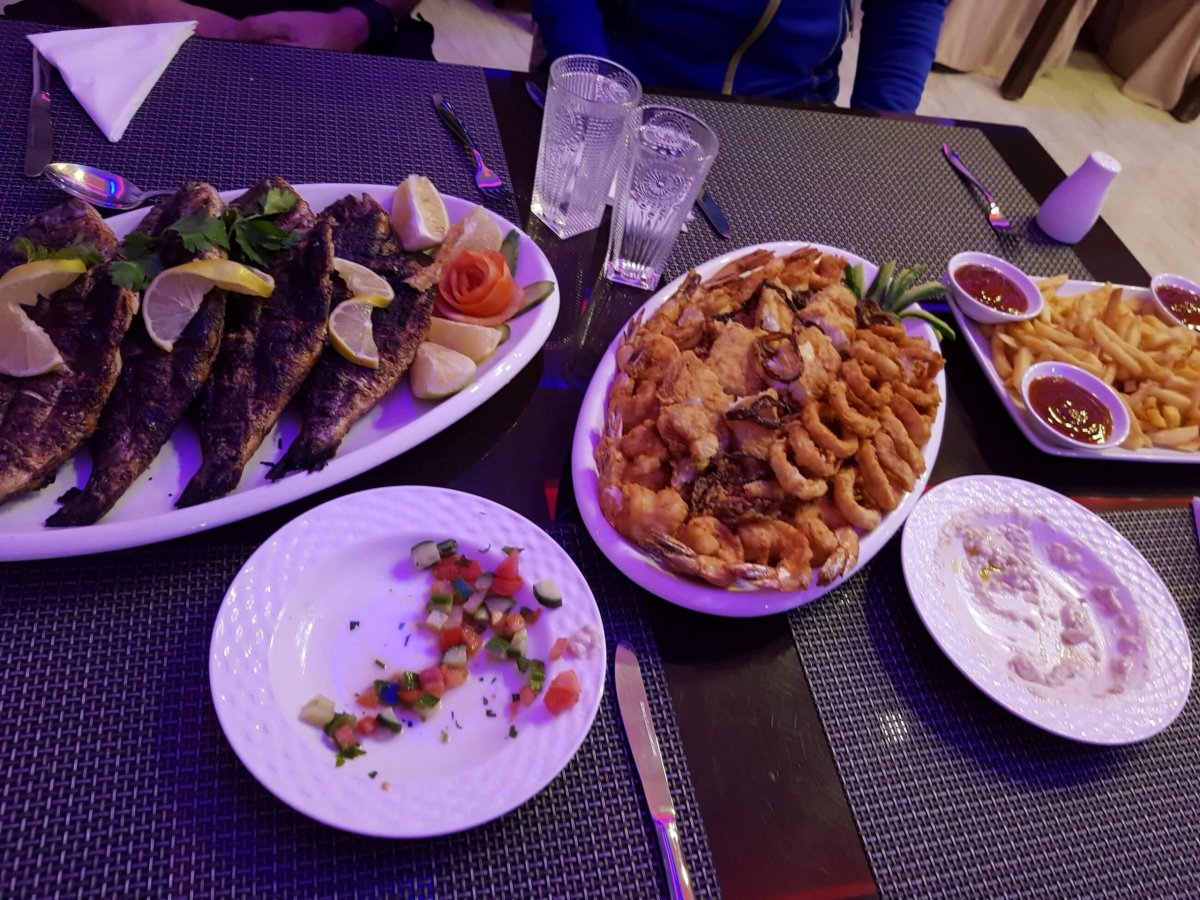 Večeře ve vesnici nedaleko Mrtvého moře: Salátový předkrm + voda + 4* čaj + 4*Pražma + hranolky + family menu (mraky rýže, smažené ryby, krevety, kalamáry) = 55 JOD