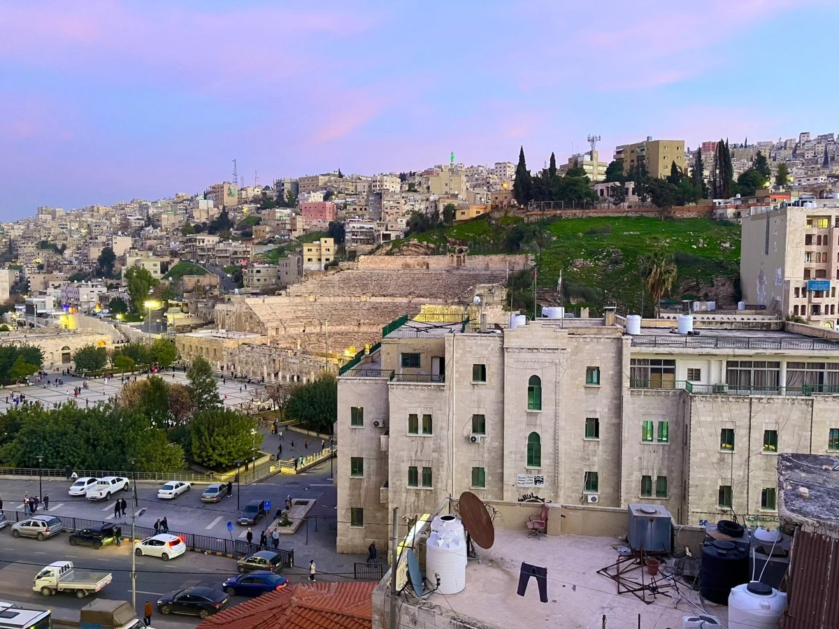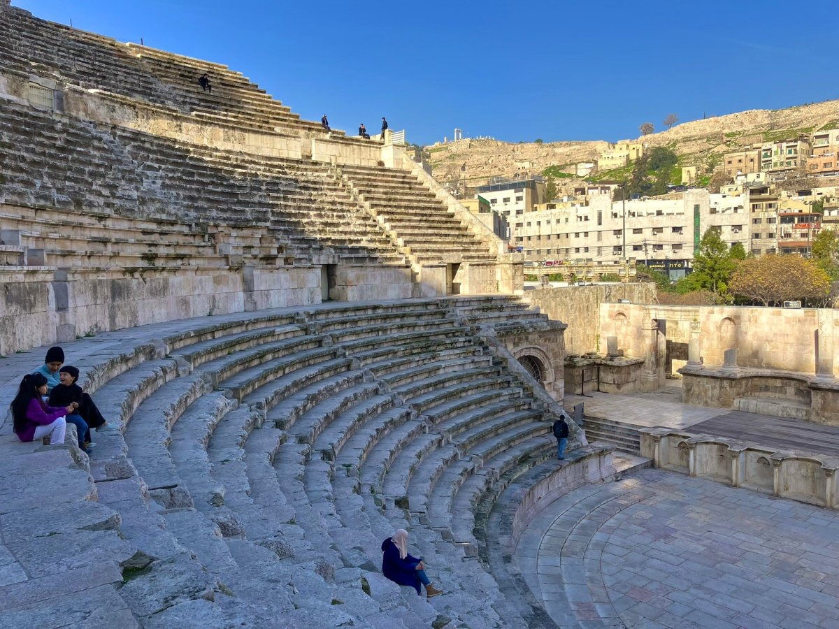 Před amfiteátrem se rozprostírá obří náměstí Hashemite Plaza, ze kterého se každý podvečer stává společenské centrum města. Nedaleko je i částečně dochované Nymphaeum, což je ozdobná kruhovitá stavba připomínající rotundu s antickými sloupy po stranách, do níž je vestavěná asi 3 m hluboká nádrž. V dávných dobách byla naplněná vodou a sloužila jako veřejné lázně. Přímo naproti našemu oknu je minaret osázený reproduktory, ze kterých se pětkrát denně rozhléhá azán – zpěv muezzina svolávajícího k modlitbě. Díky tomu máme každý den před úsvitem postaráno o budíček.