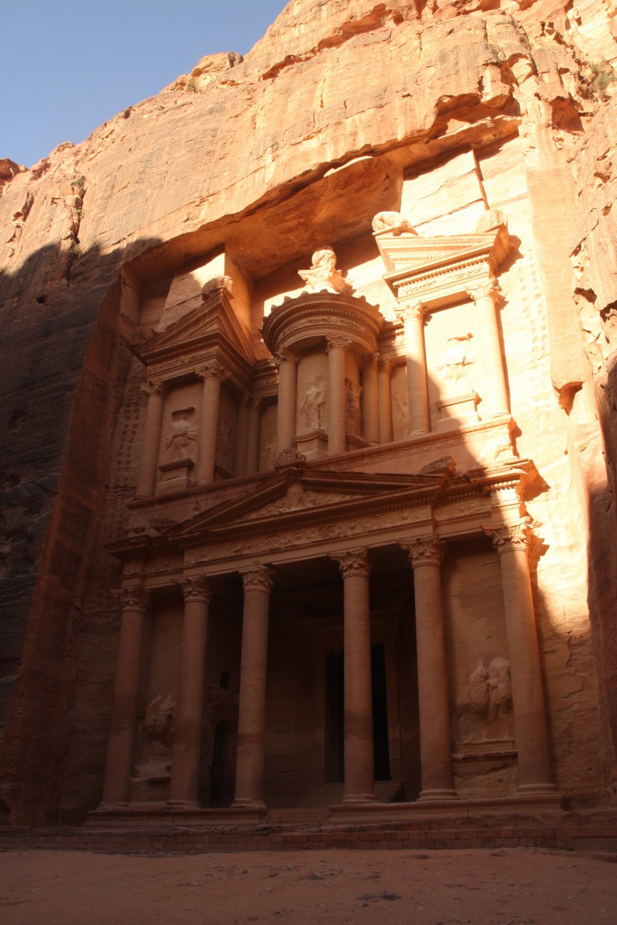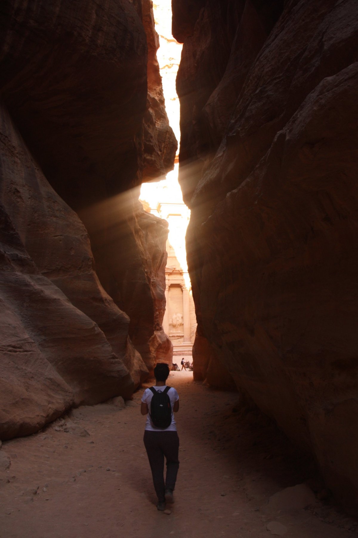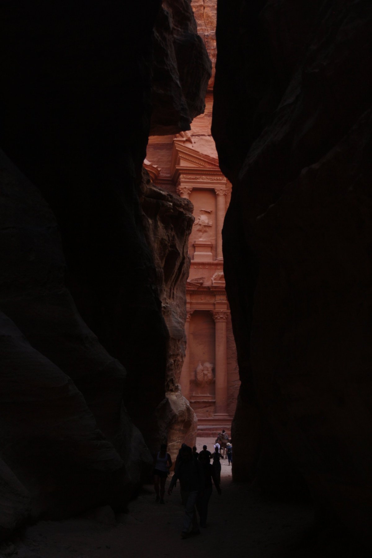 Těsně před koncem soutěsky nás doslova předbíhá další pár návštěvníků, ale to vůbec nevadí. Konečně na nás za poslední zákrutou vykukuje Pokladnice, zpočátku je úzkou průrvou vidět jenom kousek, ale po pár krocích se nám ikonická stavba odhaluje v celé své kráse. Dorazili jsme jako pátý a šestý návštěvník a kromě nás je tu jen pár beduínů. Jeden z nich se akorát pouští do hádky s turistou, který si dovolil bez úplaty pořídit fotku Pokladnice s jeho velbloudem (který je nastražený tak, že ho v záběru v podstatě nelze nemít). O samotě si místo vychutnáváme jen krátce, neboť po pár minutách doráží davy lidí. Máme radost, že se ranní vstávání a spěchání vyplatilo!