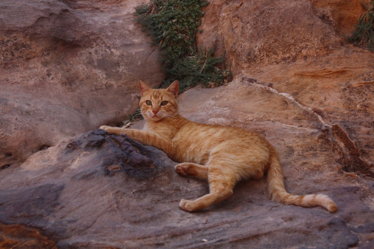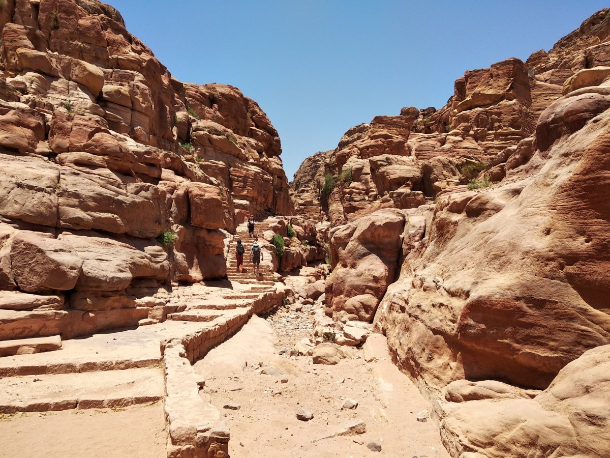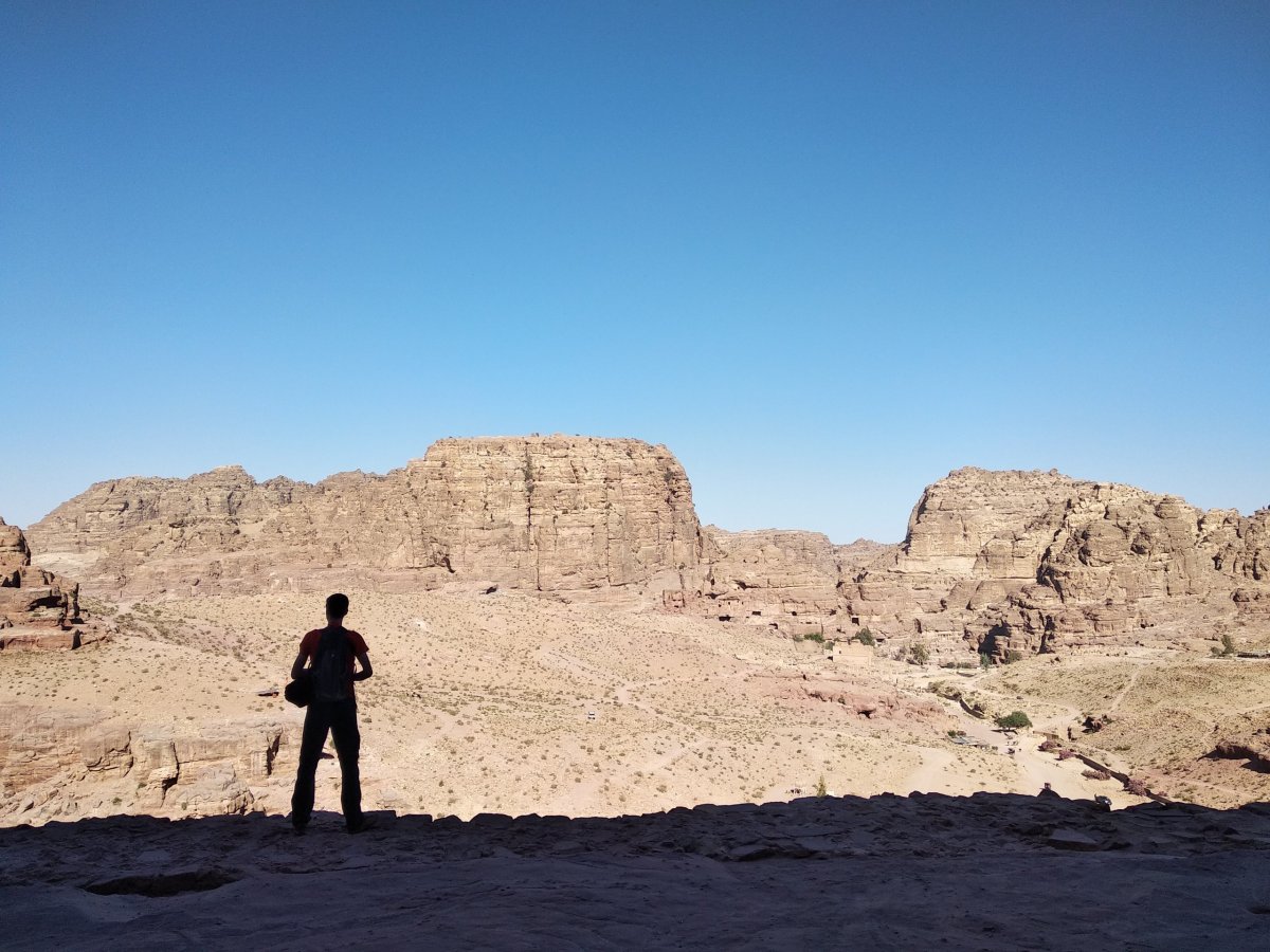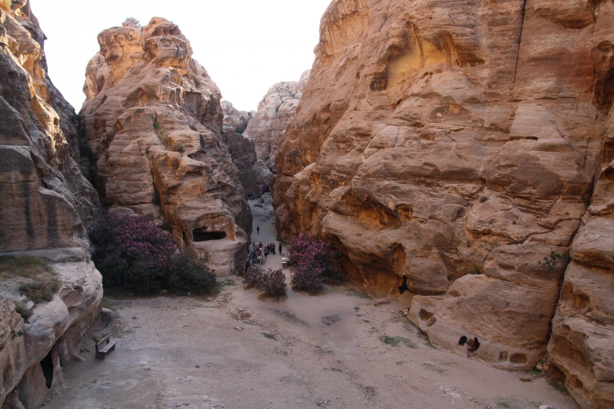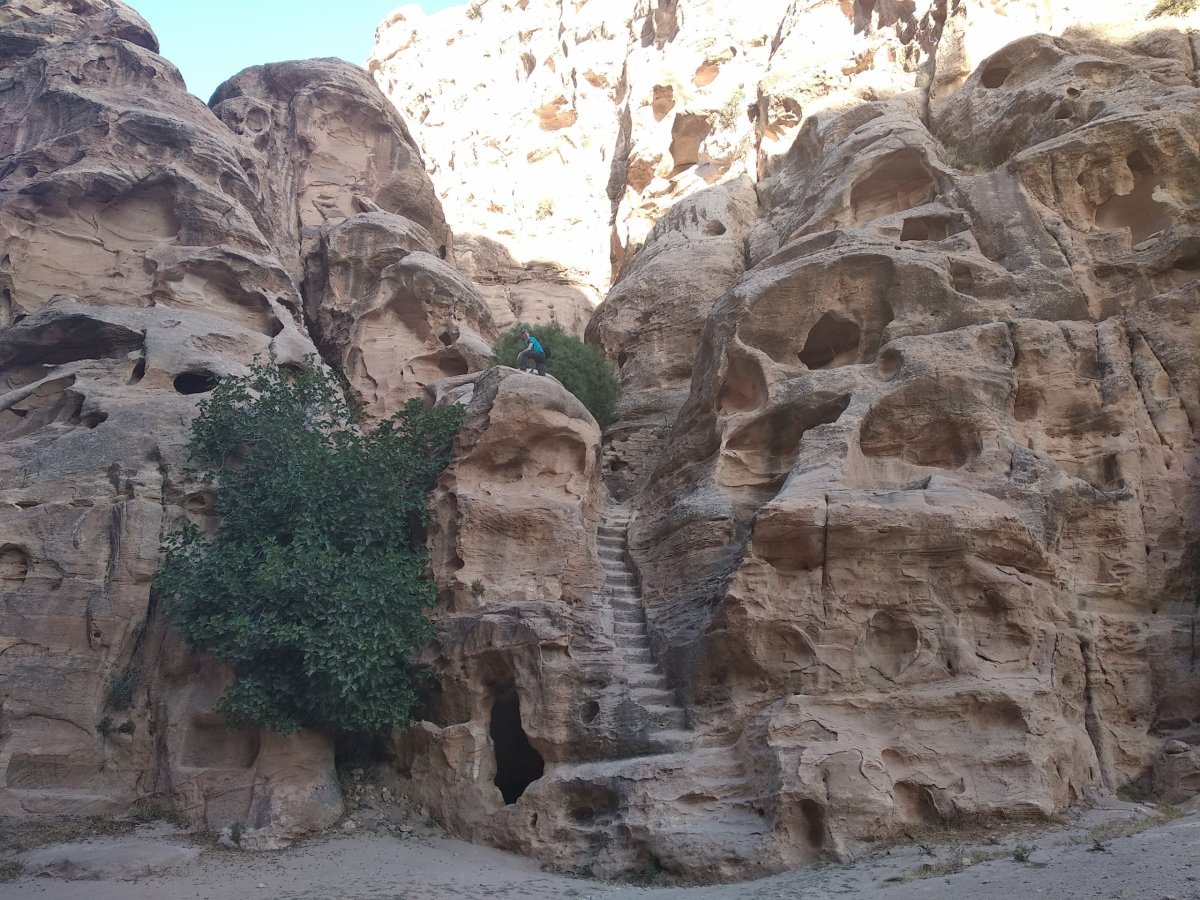 Těsně za bránou, která nás vítá v turistickém regionu Petra, zabočujeme doprava a dlouhými serpentinami s ohromujícími výhledy klesáme do údolí. Projíždíme také kolem kempu s kopulovitými bungalovy ve stylu vesmírných staveb z filmu Marťan. Dnešním posledním cílem a “předkrmem” na zítřejší výlet je soutěska Siq al-Barid známá spíše jako “Little Petra” (zdarma). Překlad arabského názvu je “studený kaňon”, a to doopravdy sedí - mezi skalami je příjemný chládek a my procházíme kolem několika místností vytesaných do skal. Na konci soutěsky se dá vyškrábat na místo, které je na ceduli inzerována jako “nejkrásnější výhled na světě”. Ve skutečnosti jsme se po této cestě dostali ke stánku se suvenýry. Kdybychom po této cestě pokračovali dále, po pár kilometrech bychom teoreticky měli dojít do údolí Petry. Samozřejmě pokud bychom nezabloudili ve skalním bludišti… Vracíme se radši zpět stejnou cestou a já si ještě ze sportu vybíhám na pár okolních skal. Po vytesaných schodech se dá vylézt snad až úplně na vrchol kaňonu, já se odvažuji tak do poloviny a výhledy jsou parádní.