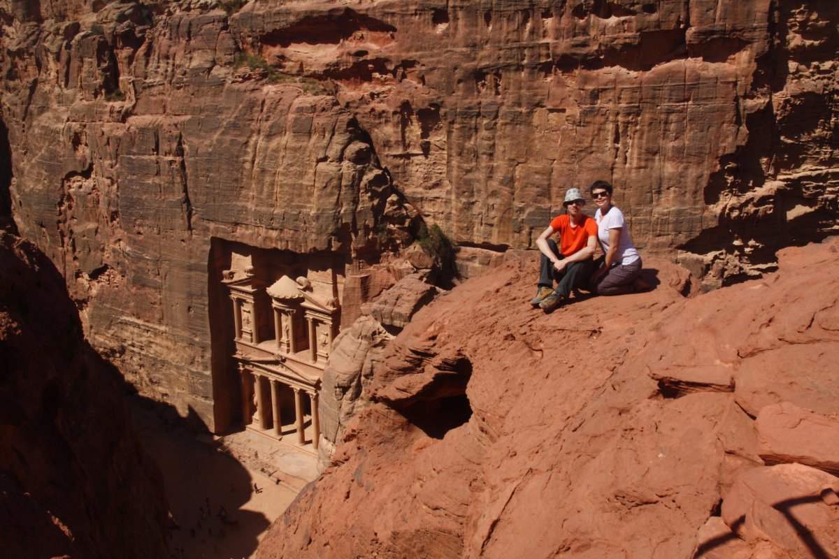 Pokračujeme po cestě lemované skalními místnostmi. Na zdejší poměry jsme tu asi celkem brzy, neboť většina stánků je ještě zavřená. Míjíme odbočku na Vysoké obětiště, po které bychom se odpoledne měli vrátit zpět, a divadlo - údajně jediné na světě vytesané do skály. Z hlavní trasy odbočujeme doprava a kolem čtveřice mohutných královských hrobek stoupáme po kamenných schodech. Rychle nabíráme metry a odměnou nám je dechberoucí panoramatický pohled na údolí. Nechybí tu ani stánek s občerstvením, u kterého bychom se obsluhy dovolávali marně - provozovatel má totiž půlnoc a tvrdě dříme na koberci. Trasa nás za 40 minut dovádí na kraj útesu přímo naproti Pokladnici. Zdejší obligátní stánek (prozíravě postavený na místě s nejlepším výhledem) má dokonce otevřeno, leč služeb nevyužíváme.