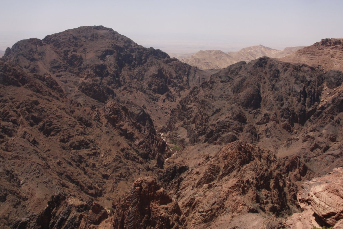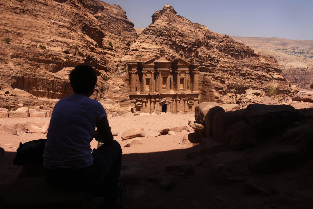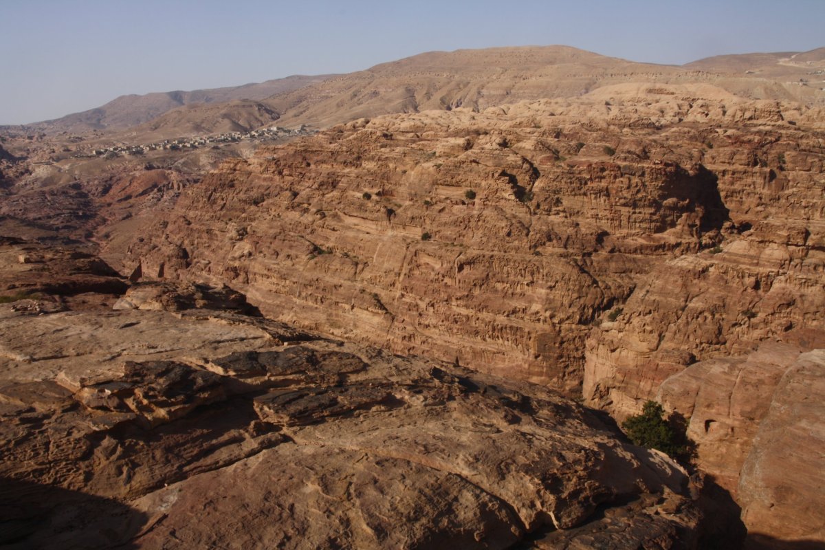 Po 50 minutách a nějakých 800 schodech dosahujeme Kláštera. Většina lidí se svalí do blízké restaurace, ale my nemáme dost a přecházíme k další cedulemi inzerující “nejlepší vyhlídku na světě”, ze které jsou vidět široké masivy černých skal a začátek (nebo konec?) 80 km dlouhého "holčičího" treku z Dany do Petry. Výhled je not great, not terrible. Ale zase je tu stánek :-) Ne zcela uspokojeni se škrábeme ještě na skálu protilehlou Kláštěru, ze které máme parádní výhled. Sice tu není stánek, ale zato stín!