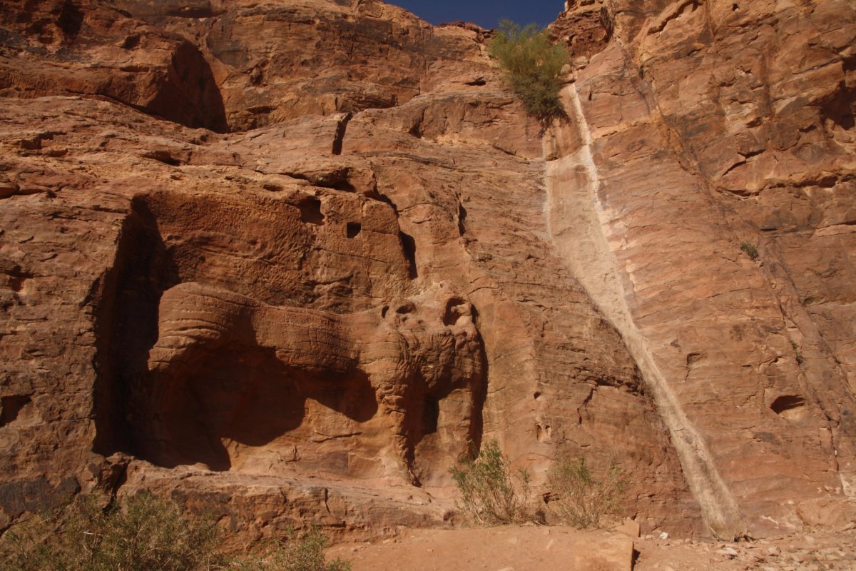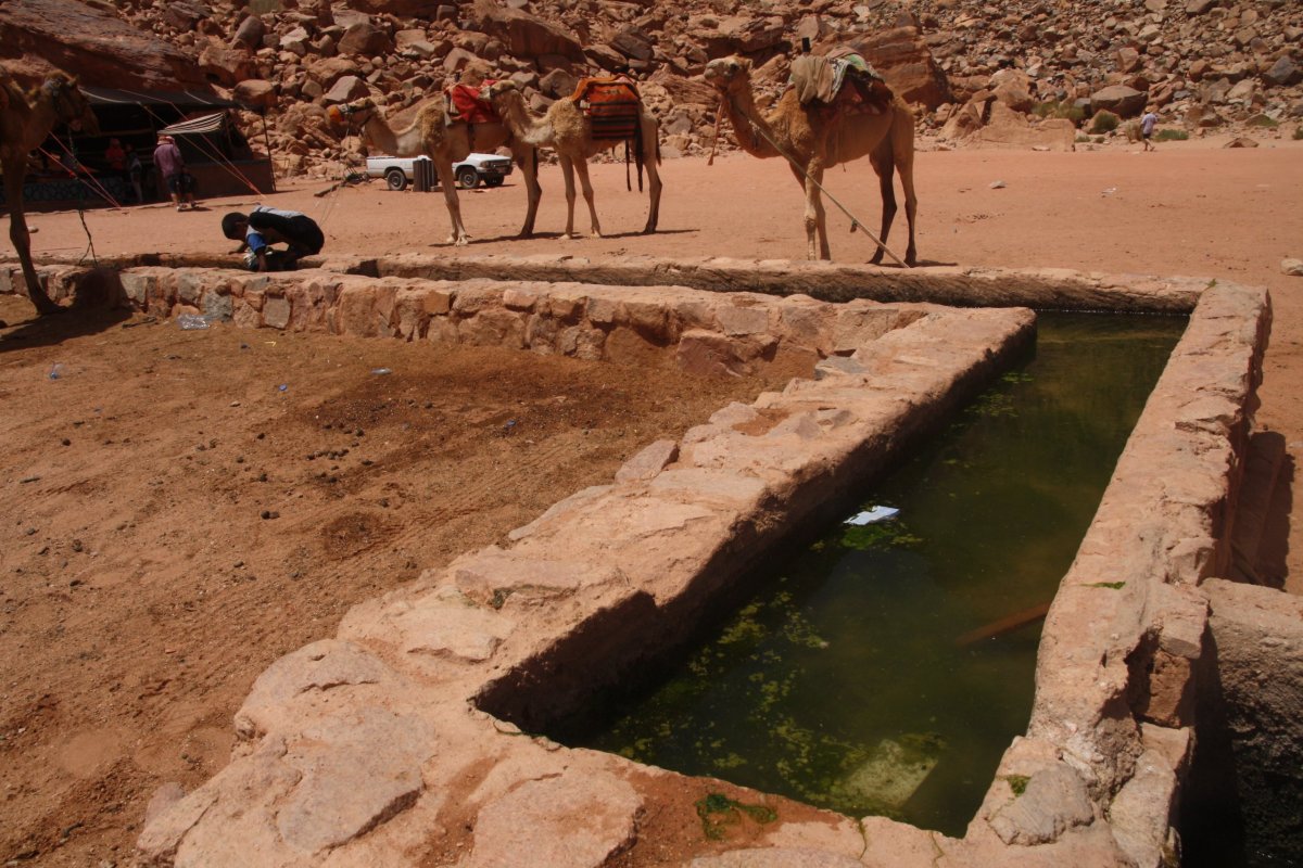 První zastávkou je Lawrencův pramen. Soliman nám ukazuje, ze které skály voda pramení, dále je zde k vidění kámen se zaručeně pravými nabateánskými rytinami. Pití pramenité vody z kamenného žlabu bych nedoporučoval. Že z toho pijí i velbloudi bych asi přežil, ale voda je plná odpadků a žabince.