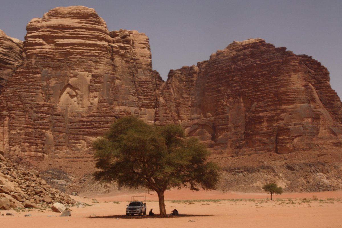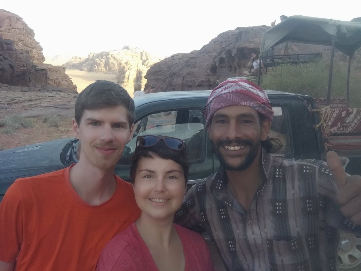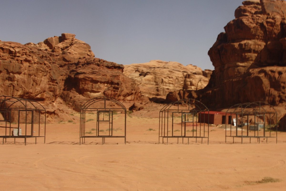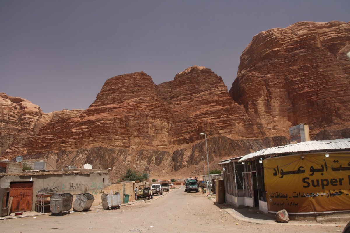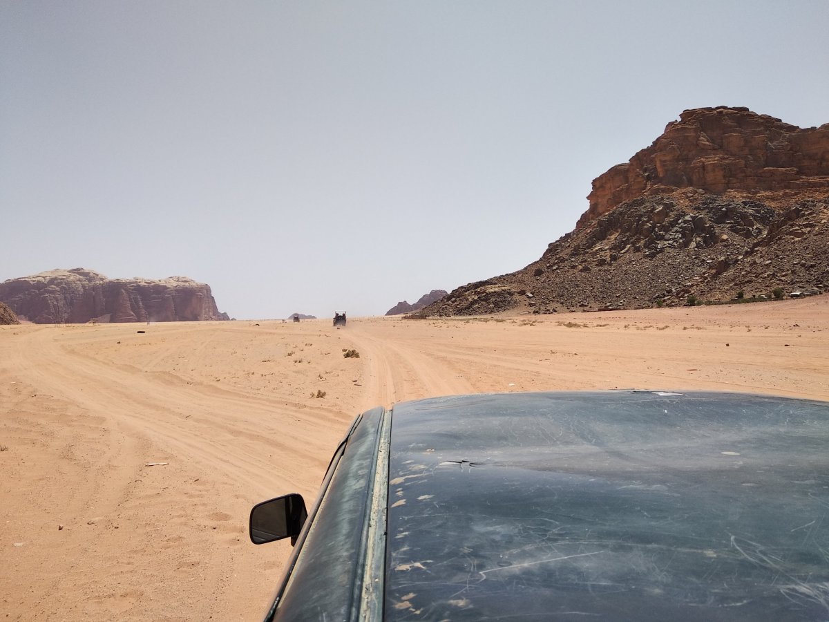 Ze silnice se jen zřídkakdy dá někam odbočit, takže směrovku lakonicky označenou pouze slovem “Rum” bezpečně nacházíme. Na konci cesty nás skutečně čeká tuzemák (tj. Jordánec), který chce vidět naše pasy. Jsme vpuštěni do vesničky Wadi Rum skládající se převážně z malých domků v rozličných stádiích rozestavení / rozpadu. Potkáváme se se Solimanem a v jeho “kanceláři”, kterou sdílí s několika jinými cestovkami, čekáme s dalšími turisty, co bude dál. Nakonec se dohodneme, že na odpolední jeep tour se spojíme s polským párem, smlouváme cenu (ach jo) a naloďujeme se na korbu ikonické Toyoty Hillux (oficiálního vozu Islámského státu).