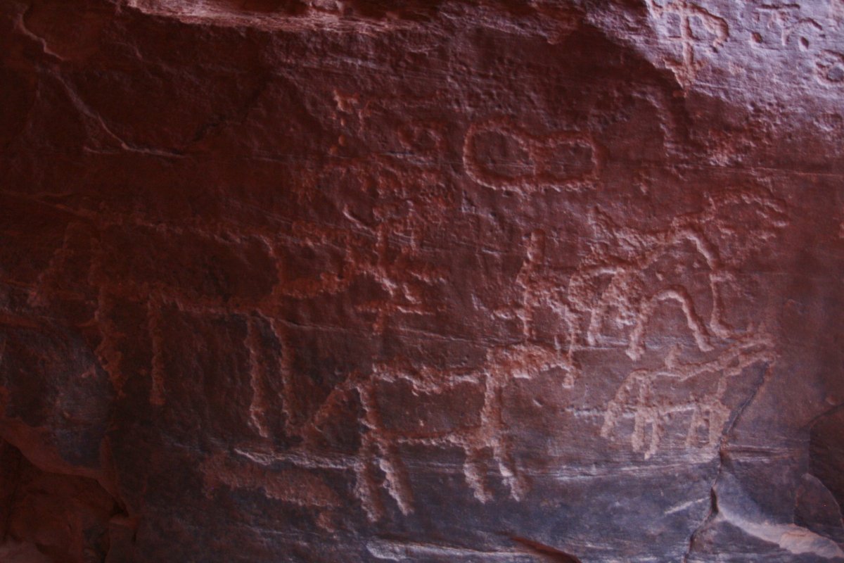 Na druhé zastávce se jdeme projít do průrvy, kde je jednak příjemný chládek a už méně příjemný smrad, ale hlavně další tisíce let staré rytiny postaviček, zvířat, pořekadel, pranostik a kdo ví čeho. Nezbývá než hádat, zda jsou opravdu originální, nebo je tam každý rok po sezóně beduíni vyrývají kamenem. Po pár minutách úzký kaňon antiklimaticky končí jezírkem plným mrtvých černých brouků a my se stejnou cestou vracíme zpět.