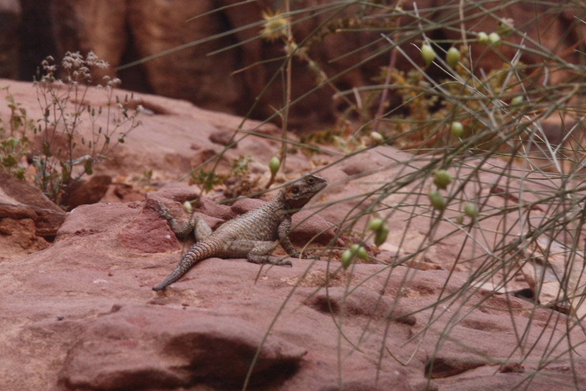 Následně nás čeká výstup na písečnou dunu, která se nahromadila u jednoho z osamocených skalnatých útvarů. Jako jediní vylézáme až úplně nahoru a užíváme si soukromé výhledy na všechny strany. Cestou dolů to nějak dokloužeme, vysypáváme pár kilo písku z bot a s kratičkou fotící zastávkou u malého kamenného mostu míříme ke kaňonu. Se slovy povzbuzení “See you tommorow” nás Soliman vysílá na pěší procházku mezi skály. Během příjemné půlhodinové procházky ve stínu útesů potkáváme pár zaběhnutých turistů a sem tam pouštní ještěrku. Nakonec se šťastně shledáváme s autem i jeho dobře naladěným řidičem na druhé straně kaňonu.