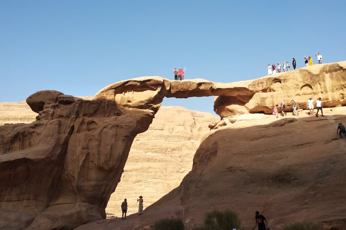 Předposlední zastávkou je skalní most Umm Fruth, u kterého to vypadá jak na parkovišti. Na fotku na mostě se tu dokonce čeká fronta, což nás teda trochu odradilo, ale Soliman nás nakonec ukecává, ať tam vylezeme, že nás zezdola vyfotí.