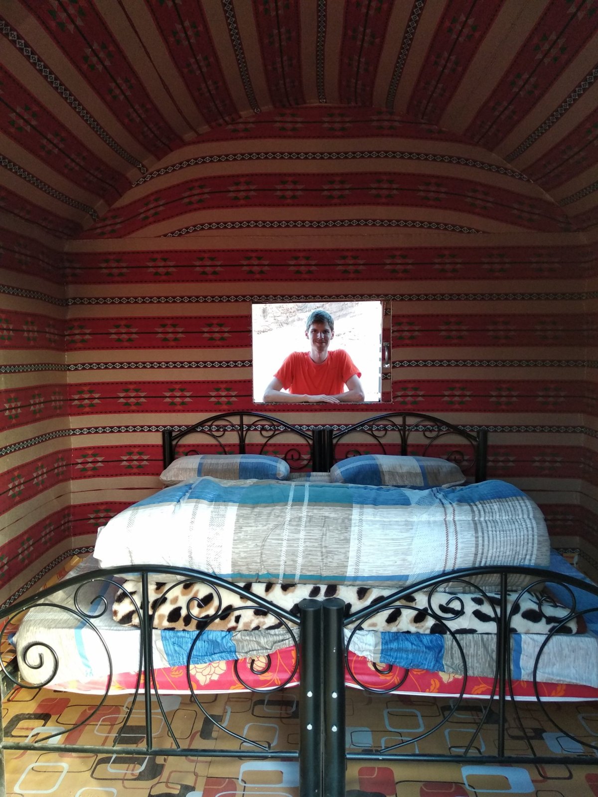 Ráno v poklidu balíme a snídáme (jak jinak než placky s hummusem). Alláh ví, co nás dnes večer čeká na talíři. Odpoledne, večer i celou noc totiž strávíme uprostřed nehostinné pouště Wadi Rum v péči tamních beduínů. Loučíme se se sympatickým majitelem penzionu a v našem rudém oři stoupáme na silnici 15. Po cestě míjíme desítky větrných elektráren, tu a tam divoké velbloudy sledující nás lhostejnými pohledy, projíždíme stádem ovcí... Nejzajímavější spatřenou atrakcí se stává malý fotbalový stadion (včetně tribun a “lízátek”), jehož trávník se zelená uprostřed vyprahlé pustiny. Zdálky nelze poznat, zda je tráva umělá nebo opravdová. I když ta umělá by se tu na přímém slunci nejspíš roztekla. Cestu využívám ke zkontaktování Solimana, beduína z našeho kempu, a přes WhatsApp domlouváme detaily našeho příjezdu a pobytu.