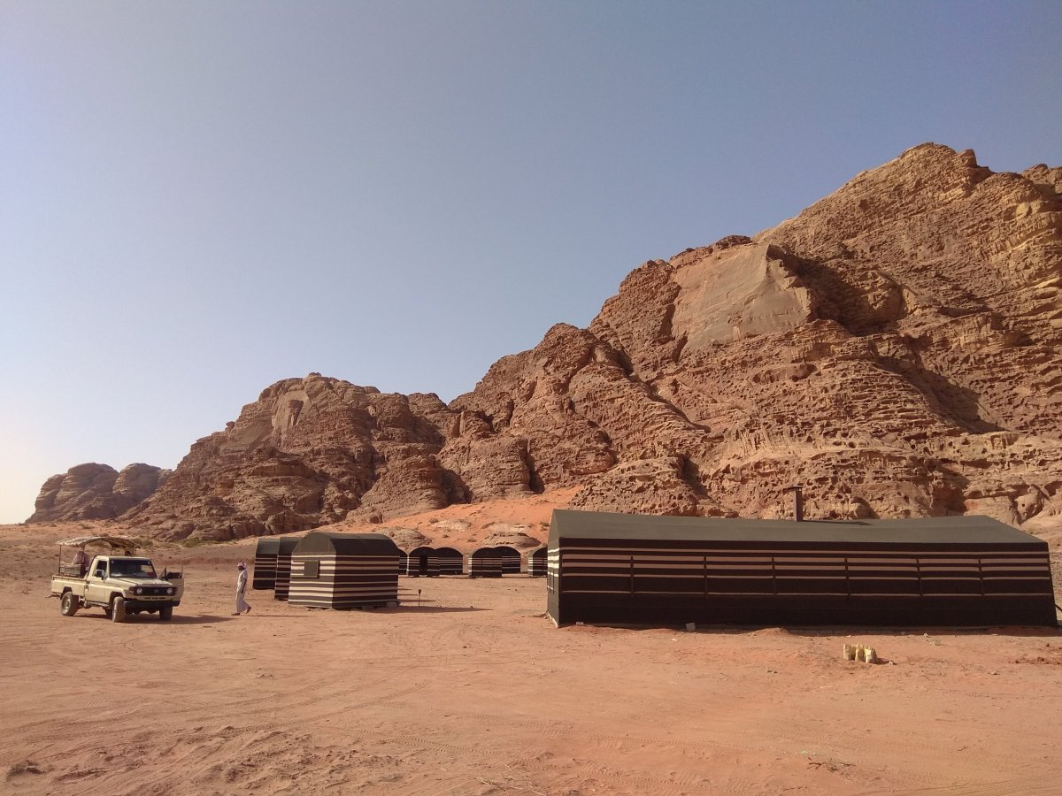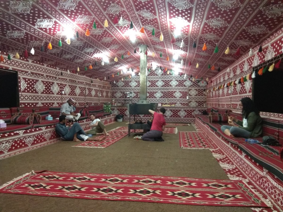 Když přijíždíme do tábořiště už se smráká. Zařízení je luxusní - velký společenský stan, zděné sociálky se sprchami a WC západního typu a samozřejmě náš soukromý elektrifikovaný stan (nebo spíš chatka) s kovovou konstrukcí, dřevěnou podlážkou a oknem. Téměř totožných kempů jsou v okolí desítky a na jeden dokonce narážíme hned na druhé straně skály, když hledáme vhodné místo na pozorování západu slunce. Naši beduíni se mezitím vrhli na přípravu večeře. Bude tradiční grilovačka zvaná “Zarb”, kdy se do díry se žhavým uhlím vloží speciální rošt s masem a zeleninou a všechno se to zahrabe pískem. Trochu to připomíná nám dobře známý Setonův hrnec, akorát se do díry nelije voda.