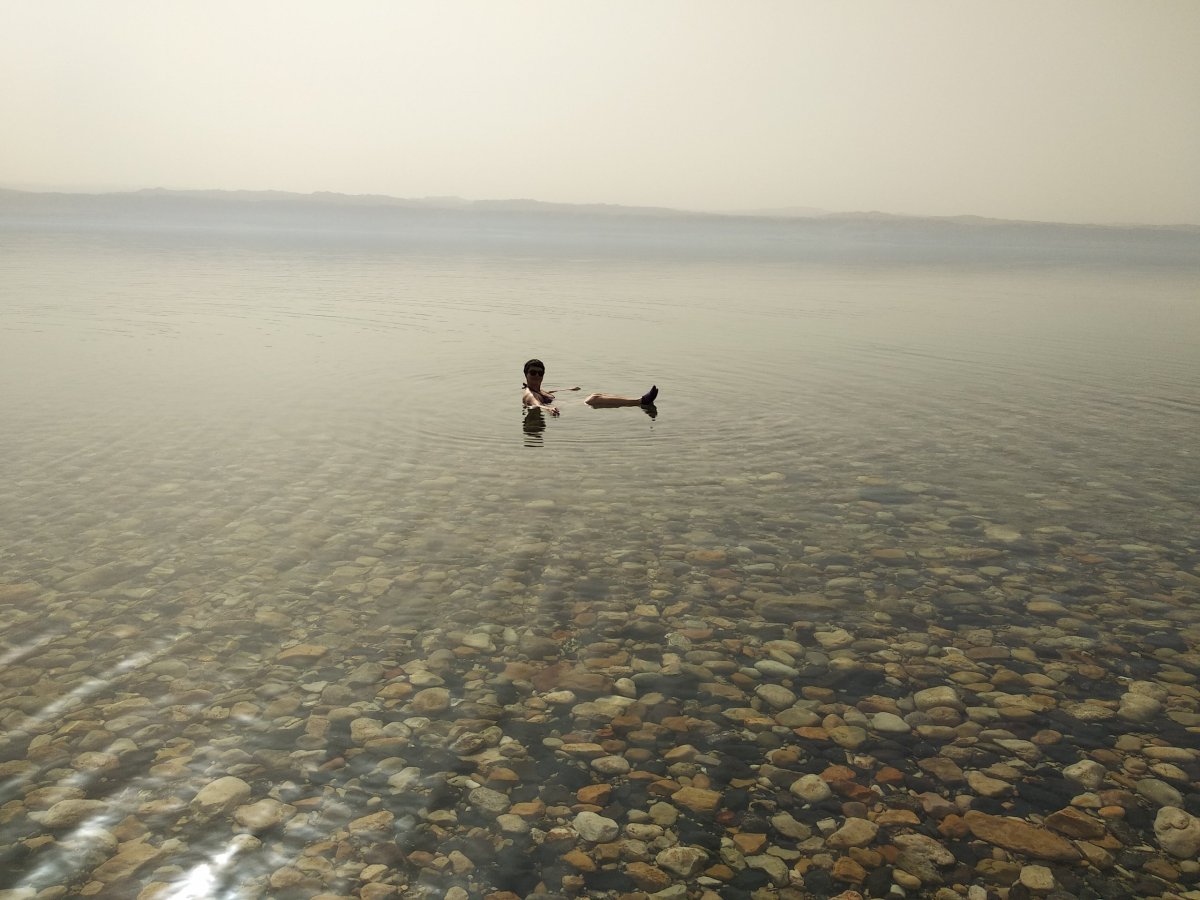 Následuje v podstatě povinný zážitek při první návštěvě Jordánska či Izraele - koupání v Mrtvém moři. Nebo aspoň v tom, co z něj zbývá. Vody rok od roku ubývá, a to jak vlivem klimatu, tak člověka. Parkujeme hned u silnice poblíž Zara Hot Springs a sešplháváme k veřejné pláži zdarma (přesná poloha je vyznačena na maps.me). Cesta je strmá a v pantoflích je to docela výzva. Na plážičce je sice sem tam nějaké smetí, ale voda je krásně čistá. A co je ještě lepší, kromě jedné jordánské rodinky tu jsme sami. Svlékáme se do plavek, což Jordánskou maminu s děckem natolik vyhecuje, že si dokonce odhrnuje nikáb. A hurá do vody! První dojem je: “Juu, to je tak mastný!”. Vznášíme se a k dokonalosti už nám chybí jenom ty noviny :-) Od horkých pramenů na plážičku přitéká sladkovodní potůček, na kterém nějaká dobrá duše postavila praktickou hrázku. Pokud vám toto malé jezírko na opláchnutí nestačí, vylezte o pár desítek metrů po proudu k vodopádku. Během koupání přichází dvojice místních mladíků, kteří pokoutně obhlížejí Káju v plavkách. Nakonec se mi s nimi daří rozbít ledy a vrcholí to tím, že speciálně pro mě vyhrabou blahodárné bahno a dokonce mi jím namažou záda. Jejich zájem se ale záhy přesouvá k nově příchozí trojici turistek v bikinách, které jim mají zjevně víc co nabídnout. Nám se tak dostává dostatek prostoru umýt se (resp. vymáchat se v mělkém jezírku pramenité vody) a převléci se v improvizované převlékárně (v křoví).