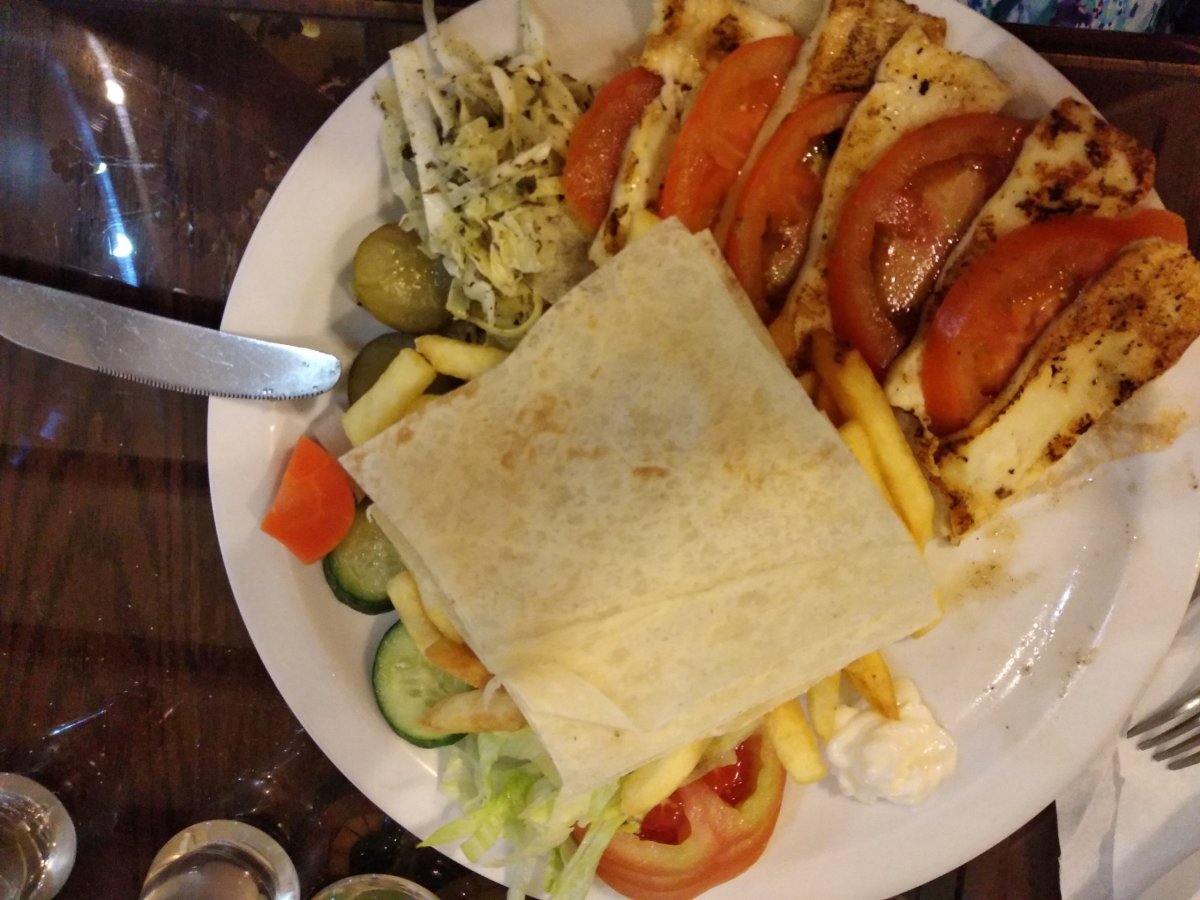 Naše dnešní místo spočinutí městečko Wadi Musa je odsud co by kamenem dohodil a v našem španělsky znějícím hotýlku Esperanza Petra jsme za čtvrt hodinky. Po zvážení našich možností nakonec vyrážíme na večeři autem do rušnější části města na vedlejším kopci. V restauraci Beit Al-Barakah si dáváme shawarmu (malý kebap) a jehněčí koleno s rýží. Jídlo a místo nebylo nic moc, ale na druhou stranu nás potěšil kousek baklavy jako pozornost podniku.