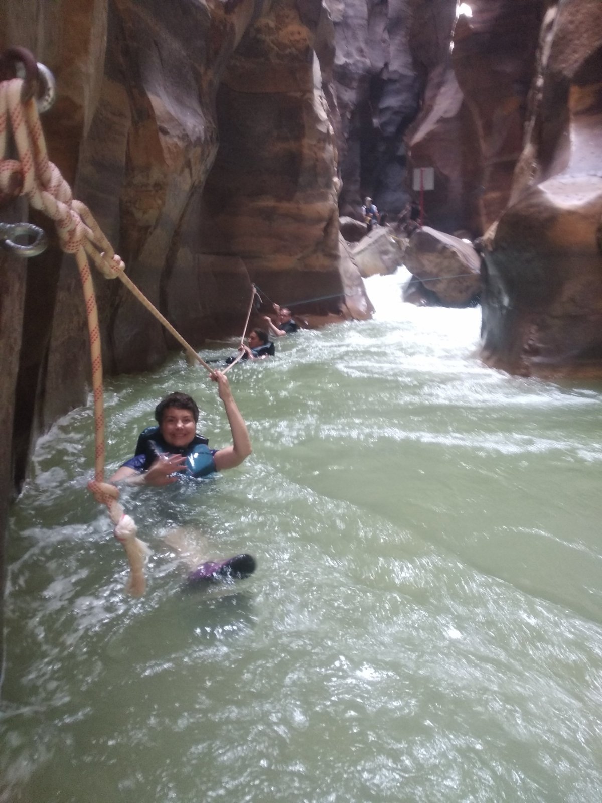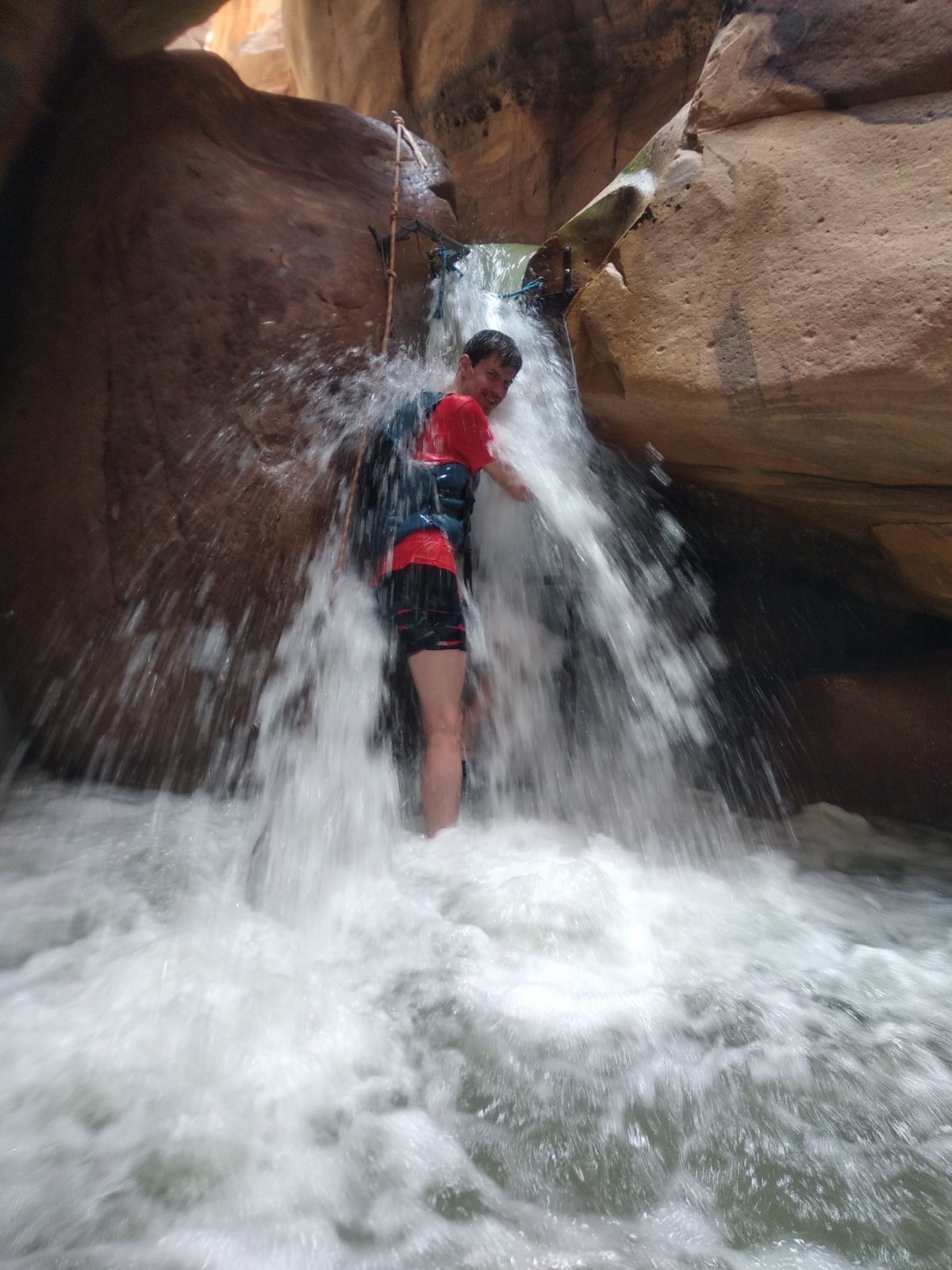 Vracíme se Mrtvému moři, ke vstupu do kaňonu, který jsme včera míjeli. Parkoviště je skoro plné. Na recepci zakupujeme za poměrně vysokou cenu (21 JOD za os.) vstupenky. Z důvodu sucha (nebo možná ramadánu, dostalo se nám obou těchto zdůvodnění) je možné projít pouze nejkratší základní trasu k vodopádu a zpět. V moderní vstupní hale jsou k dispozici záchody s převlékárnou, skříňky na věci a v ceně je zapůjčení vest (nikoli však helem). Po žebříku slézáme dolů a proti proudu se brodíme do nitra soutěsky. Vody pomalu přibývá a při postupu proti přes peřeje, skály a vodopády se neobejdeme bez lan a žebříků. Jde o náš první canyoning, takže si to užíváme o to víc. Všechna nebezpečná místa jsou tu dobře označená a zajištěná. Asi po půldruhé hodince došploucháme k vodopádu, který je možné ještě podplavat. Zpátky je to neméně zajímavé, vezeme se v proudu, sjíždíme jednu malou a jednu větší přírodní klouzačku. Akorát té vody mohlo být trochu víc - zejména ke konci je to o prodření plavek na zadku. V jednom místě ještě pomáhám vyprostit dívčinu zaseklou uprostřed peřejí. Z kaňonu vylézáme po 3 hodinách, přičemž jsem rozhodně nespěchali, ba naopak na některých místech blbli delší dobu. Rychle prolézt by se to dalo určitě za poloviční dobu. Na sluníčku a zejména v autě nás málem složí teplotní šok. Voda v petkách, co jsme tu nechali, pomalu vře :-) Honem ujíždíme pryč někam do chládku.