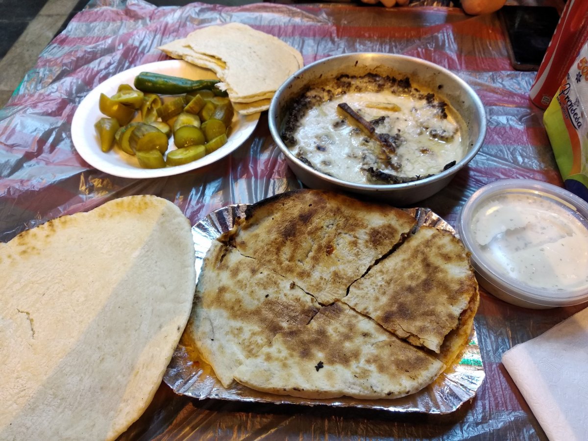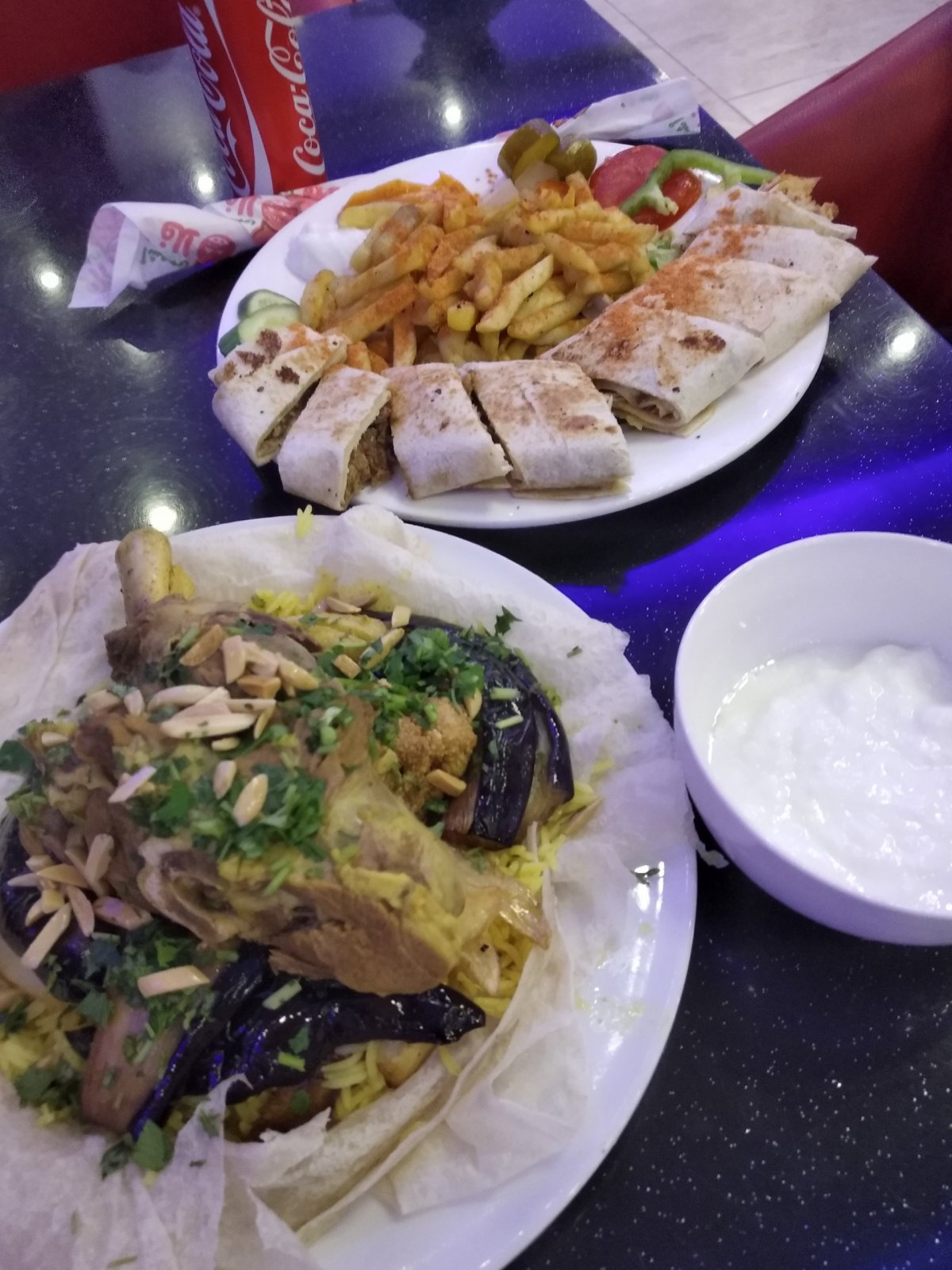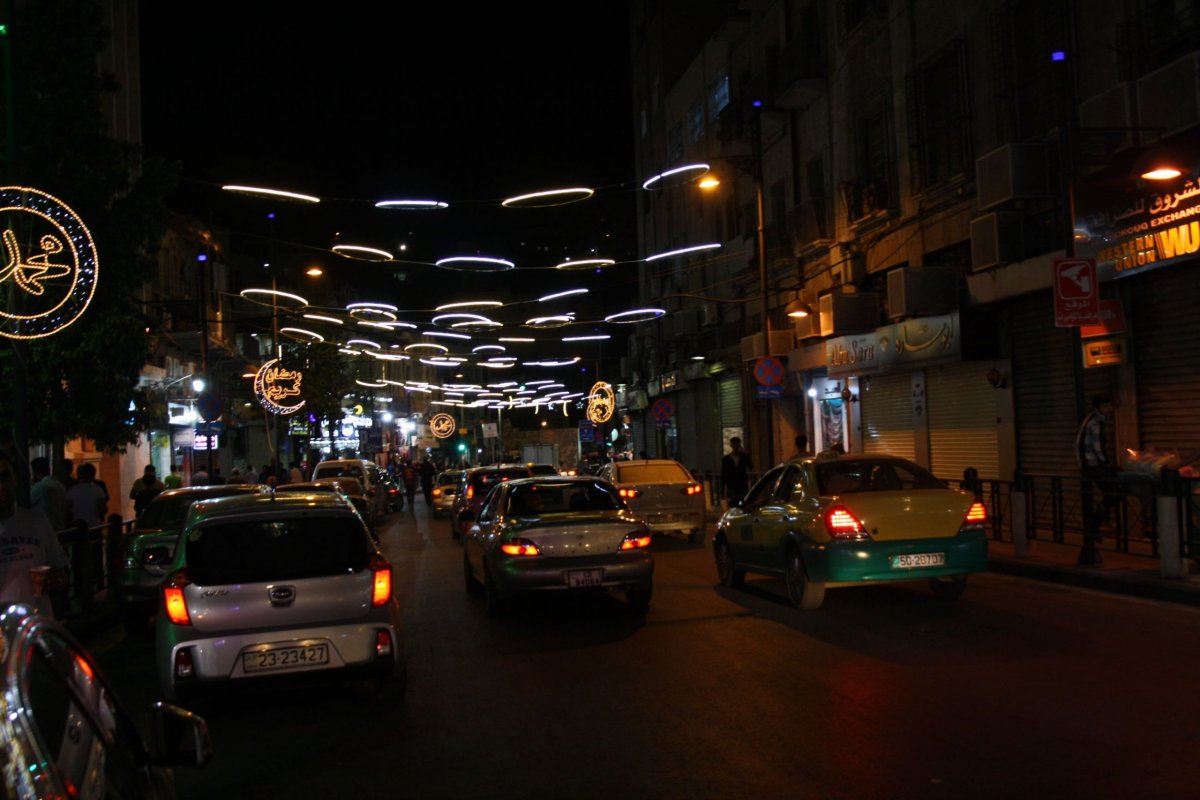 Cestou domů sjíždíme ucpanými úzkými uličkami. Fascinuje nás, jak Jordánci v klidu zastaví auto před pekárnou (a zablokují tím dopravu), jdou si nakoupit čerstvé placky a ještě stihnou prohodit pár slov se známými. Za úplatu parkujeme ve dvoře u hotelu a po večerní modlitbě vyrážíme do ulic. Jelikož je teď všude plno, jdeme ještě omrknout nádherně nasvícené divadlo a neméně impozantní mešitu. O půl deváté jsou už místní podniky mnohem prázdnější a my kotvíme v jídelně Shahrazad v pasáži. Za 5 JOD si pochutnáváme na specialitách arayes (placky plněné masovou směsí) a tahini (mleté maso v krémové citrusové omáčce), samozřejmě doplněných plackami a pitím. V nedaleké vyhlášené cukrárně Habibah okusujeme sýrový dezert kunafeh (malý kousek za necelý dinár).