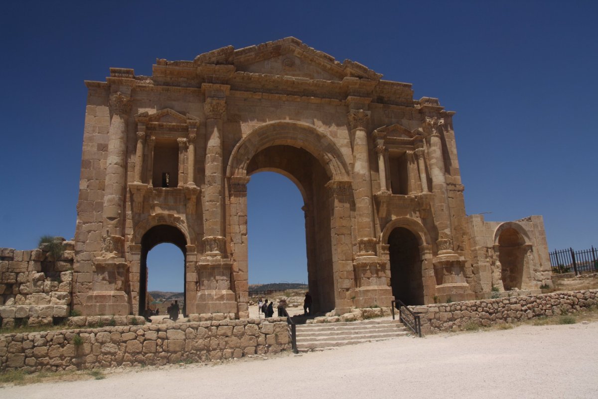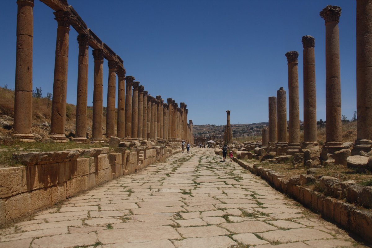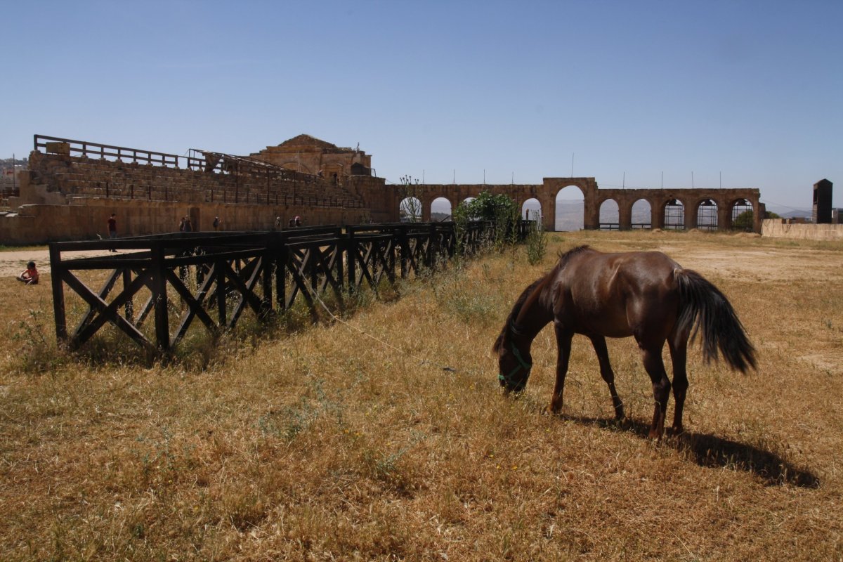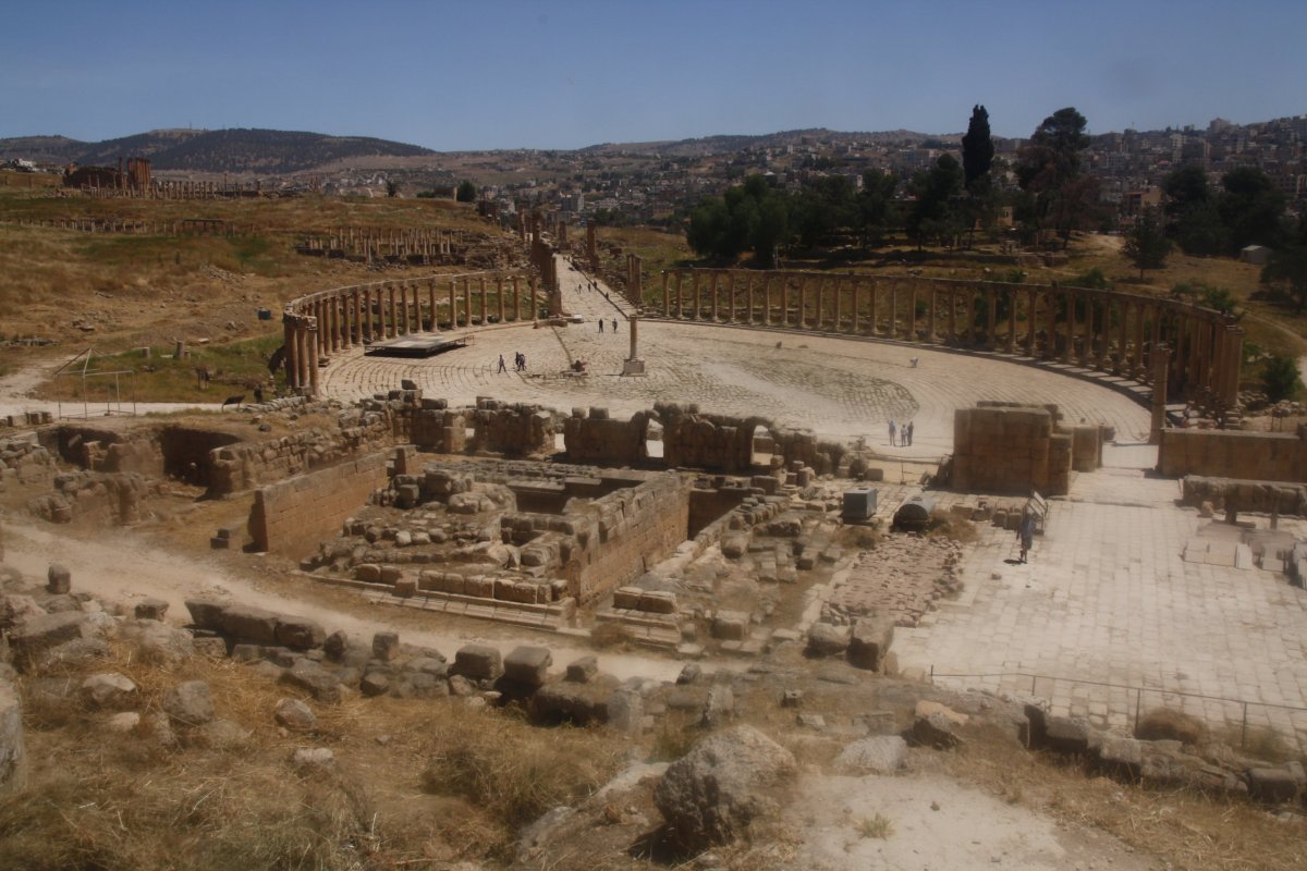 O hodinu později parkujeme ve městě Jerash, kde se nacházejí nejzachovalejší ruiny antického města mimo Itálii a druhá nejnavštěvovanější památka v Jordánsku. U vstupu po nás nikdo nechce vidět vstupenky a na Jordan Pass se ptají až u okénka u Jižní brány uprostřed komplexu. Po desáté už je tady celkem dost lidí a další přijíždějí. Pokud si chcete místo užít sami (a v menším vedru), doporučuji dorazit hned na otevíračku v 8:00.