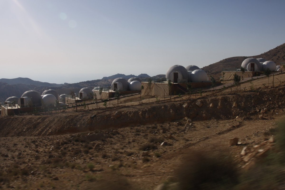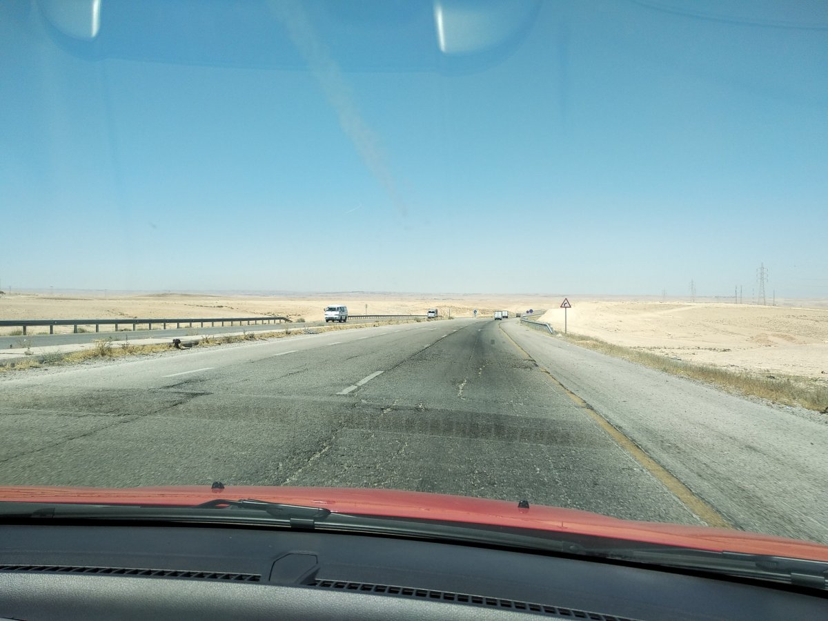 Ve městě kvůli ramadánu marně hledáme otevřenou restauraci či obchod a k obědu nakonec musíme vzít zavděk pouze tyčinkou z domova. Dále na jih pokračujeme po King’s Highway, avšak hned po pár kilometrech nás uzávěrka směřuje zpátky na dálnici. Míříme k ní po “okresce” protínající poušť a vychutnáváme si úseky, kdy nejsou ani v jednom směru vidět jakékoli známky civilizace. Před nájezdem na dálnici potkáváme jen pár aut a ovčích stád.