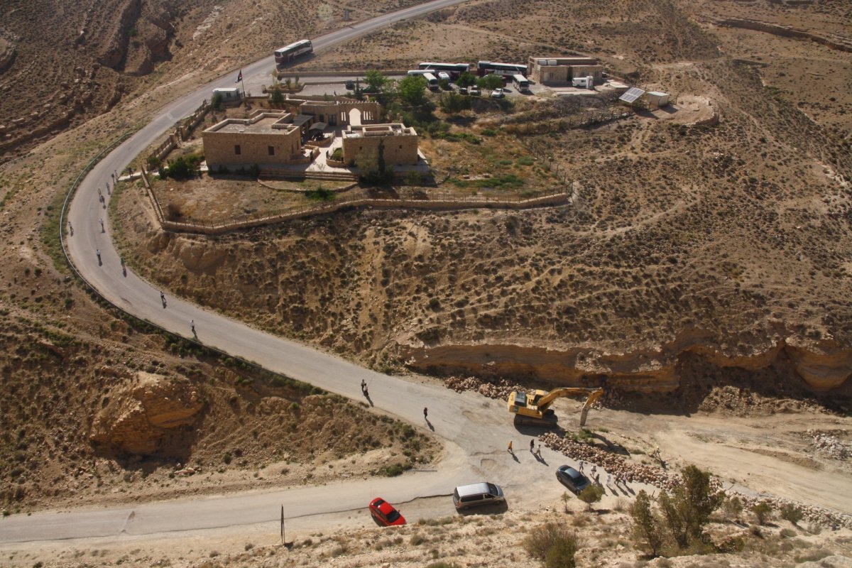 Od moře vyjíždíme pitoreskní kopcovitou krajinou. Do Madaby musíme nastoupat cca 1200 výškových metrů, většinu z toho za prvních pár kilometrů. Náš červený drak (a hlavně jeho řidička) si s četnými zatáčkami hravě poradí. Za hodinku parkujeme před hotýlkem Tell Madaba a s chladným nápojem v ruce nás vřele vítá majitelka. Přibližně polovinu obyvatel Madaby tvoří křesťani, a to včetně rodiny naší hostitelky. Ta nám doporučuje restauraci a na naši otázku, jestli bude otevřeno i před večerní modlitbou se zřetelnou povýšenosti v hlase opáčí něco ve smyslu, že jde o “slušný křesťanský podnik”. Bereme to jako “ano”. Nakonec večer trávíme v restauraci s příjemným posezením na střešní verandě a mnohem větší zážitek než jídlo (do kterého se pořád nemůžeme vjíst) nám poskytuje výhled na osvětlenou mešitu a kostelní věž.