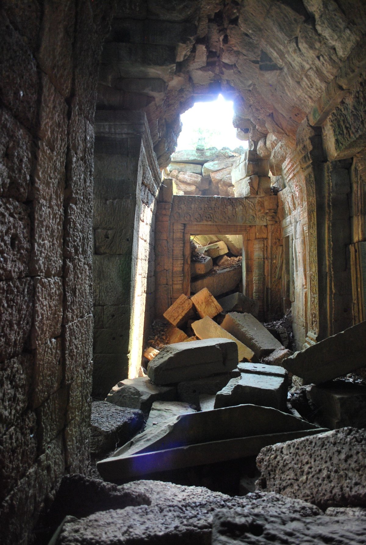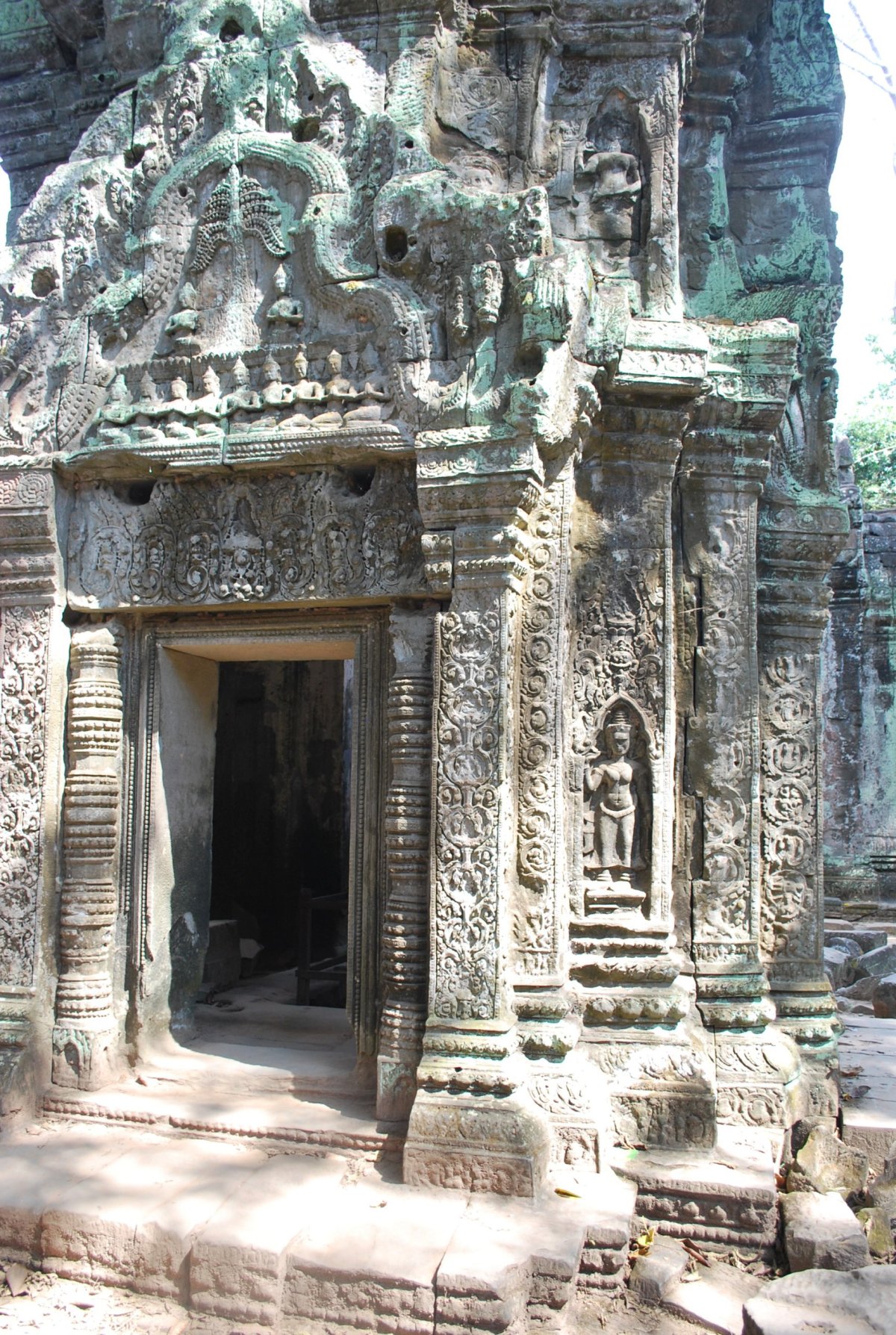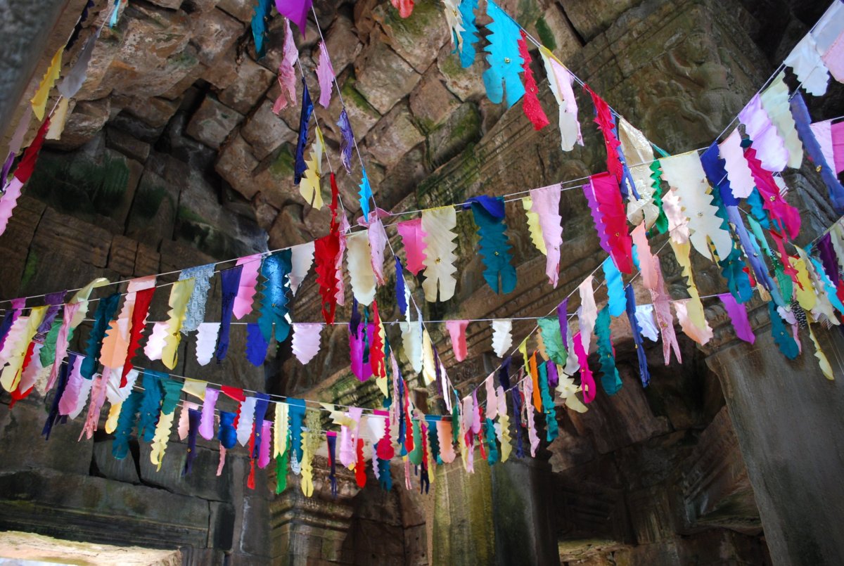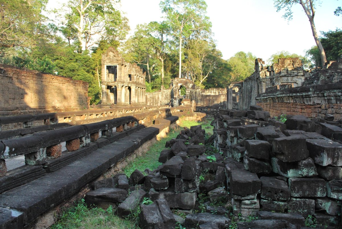 Po snídani si bereme kola a jedem na další chrámy. Po cestě opět koupíme banány a vodu, už umím docela pěkně smlouvat a nenechám se od místních prodejců zase tak natáhnout. 1 dolar přepočítavají na 4000 rielů. 1,5 litrová voda stojí 1000 rielů, tedy asi 6,5 koruny, trs malých sladkých banánů také 1000 rielů. Pivo stojí 2000 rielů nebo 0,5 dolaru (točené, 0,4l). Dnes navštívíme postupně tyto chrámy: Prasat Kravan - jeho novodobé jméno znamená doslova "Kardamomový chrám" - podle stromu, který zde rostl. Zde od místní prodavačky kupuji za 3 dolary 10 pohledů v takové knížečce, jejíž obálku tvoří další 3 pohledy. Po asi 3 dnech zjišťuji, že se to dá koupit za 1 dolar...no pěkně mě natáhla...ale co, aspoň udělala kšeft. Pohledy ještě ten večer hážeme v hotelu do schránky, ale ani po 1 měsíci ještě nepřišly...Dále jedem ke chrámu Banteay Kdei (Pevnost cel). Dále jsme přejeli ke chrámu Ta Prohm, který je po Angkor Wat zřejmě nejfotografovanější a nejpopulárnější chrám z celého historického parku - díky tomu, že byl kdysi záměrně ponechán v původním stavu s obrovskými stromy a kořenovými systémy "stékajícími" po zdech. V průvodci bylo hlavně zmíněno, že se zde točil film Lara Croft – Tomb Raider. A také zde bylo vcelku dost turistů, což se o prvních chrámech říct nedalo. Štěpán záměrně vybral trasu po chrámech v protisměru hlavního proudu turistů. Další chrám byl Pre Rup , který nechal ho postavit král Rajendravarman II. po skončení období zmatků a navrácení hlavního města zpět z Koh Ker. Vyšplhat se sem dá po strmých pískovcových schodech. Protože bylo už kolem 14 hodiny a vedro bylo dost úmorné, zastavili jsme na oběd. Já jsem si dala výbornou rýži s pečeným ananasem a rajčaty, Štěpa klasicky nudle s masem. Trochu jsme si odpočinuli, před cestou k posledním dnešním chrámům. Jako další chrám jsme navštívili Neak Pean, což v doslovném překladu znamená „obtočený had". Z posledního chrámu jsme odjížděli kolem 17:30, kdy už se začalo stmívat. Projeli jsme městem Ankor Thom, přes bránu vítězství Angkor Thomu, okolo chrámu Bayon, přes jižní bránu ven, a okolo Angkor Watu zpět do Siem Reap. V celém chrámovém komplexu bylo už jenom pár turistů a místních lidí, takže tam byla úžasná atmosféra. Později jsem zjistila, proč tam nikdo nebyl...schylovalo se totiž k pořádnému slejváku, který nás zastihl na cestě zpět do hotelu. Měli jsme naštěstí ponča, takže jsme zas tolik nezmokli, hlavně foťák aby byl v suchu. V hotelu jsme se dali trochu do kupy po té venkovní sprše a šli na večeři do hotelové restaurace.