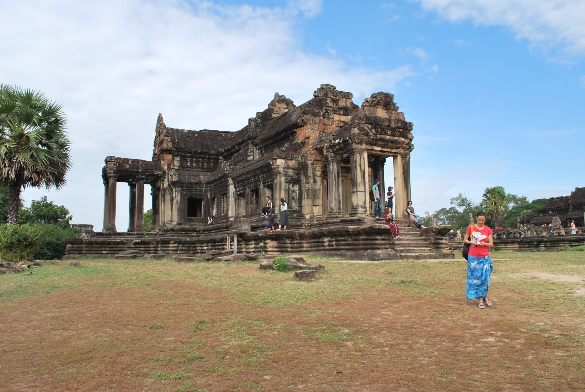 Asi kolem 8 hodiny nás vzbudily nějaké rány, pravděpodobně ze „stavby“ hned vedle hotelu. Něco tam bourali a bourali to jenom ráno...Takže jsme se vypravili na snídani, která tedy nebyla úplně super, mohli jsme si vybrat jedno jídlo a kafe nebo čaj. Žádné ovoce, nebo tak...to bylo bráno jako další jídlo za 1,5 dolaru. Ale tak jsme si to dali i tak. Pak jsme se vrátili zpět na pokoj a Štěpa začal podle průvodce plánovat kam vyrazíme a které chrámy navštívíme. Já jsem šla na recepci zajistit zapůjčení kol, které bylo v rámci pobytu zdarma. Paní mi dala zámek na kolo a klíček a řekla, že si máme z venku stojících kol vybrat, které chceme. Byla tam dvě horská kola, tak jsem je okukovala, za chvíli přišel i Štěpa a také vybíral. Ale jedno z těch kol bylo píchlé a druhé mělo rozbitou přehazovačku. A ve finále přišla paní z recepce a řekla, že zrovna tyhle dvě kola stojí 3 dolary na den, takže jsme vybrali z těch ostatních městských kol, takové dva verky, ty nejlepší, co tam byly. Zamkli jsem je k sobě a šli se plácnout k bazénu u hotelu. Vedle bazénu byla i vířivka. Po 13té hodině jsme na kolech vyrazili na prohlídku chrámů. Bylo vcelku teplo, kolem 34 stupňů, ale na těch kolech to docela šlo, jenom musel člověk jet a nezastavovat. Podle mapy v průvodci po Angkor watu jsme dojeli k vjezdu do jednoho komplexu, ale tam po nás chtěli lístky. My jsme však dneska chtěli navštívit chrámy, které měly mít vstupné zdarma a třídenní vstupenku použít až na další tři dny. Tak jsme jeli zpět k centru, kde prodávali lístky do celého komplexu chrámu v okolí Siem Reap. Bylo to obrovské centrum, se spoustou pokladen, ale zcela nepochopitelně se tam nedalo platit kartou. Za 2x 40 dolarů jsme zakoupili třídenní vstupenku, na kterou nás vyfotili a vytiskli. Vstupenka platí na jakékoliv tři dny v průběhu následujících 6ti dnů, a jednotlivé dny nám vždy u vstupu do prvního objektu procvakli. Z lístkového centra jsme vyrazili k nejstaršímu chrámu v oblasti Ak Yum. Po cestě jsme nakoupili banány a vodu, vše jsem si uložila do košíčku vepředu na řídítkách. S koly to byla docela sranda, zaprvé provoz po městě byl docela hustý, člověk musel dávat pozor, aby ho něco (hlavně motorky) nesrazilo. A Štěpán zjistil, že mu to kolo zas až tak nebrzdí...Dál nás cesta k nejstaršímu chrámu vyvedla ven z města, okolo letiště (asi 10 km) na západ. Chrám Ak Yum se nacházel u Západní Baraje – nádrže. Celá cesta byla po vedlejších komunikacích, kolem baraje, ve stínu – no paráda. Chrámek Ak Yum byl malinký a téměř celý rozpadlý a zarostlý v džungli. Vstup byl zdarma. Pokračovali jsme ještě kousek po „hrázi“ Západní Baraje, která dlouhá zhruba 8 km a široká 2,1 km. Byla vybudována v 11. století, a do dnešních dnů zůstala z větší části zaplněna vodou. Na umělém ostrově uprostřed nádrže se zachoval hinduistický chrám zvaný Západní Mebon. Nádrž slouží k zavlažování polí. Za celou dobu jsme potkali dva místní na motorkách a jedno auto. Vraceli jsme se kousek stejnou cestou a pak projížděli takovými malinkými cestičkami, okolo domků a chatrčí místních. Okolo 18 hodiny jsme projížděli kolem hlavního vstupu do chrámu Angkor, kam jsme chtěli nakouknout, ale už nás tam nepustili, protože už bylo zavřeno. Udělali jsme tedy pár fotek chrámu v západu slunce, téměř bez turistů. Pak jsme jeli zpět na hotel, dali si oraz a sprchu a pak vyrazili do města na večeři. A po večeři spinkat. Druhý den jsme měli naplánovaný okruh po dalších chrámech.