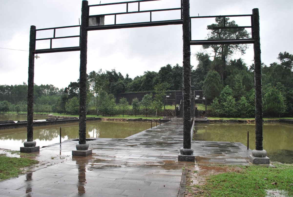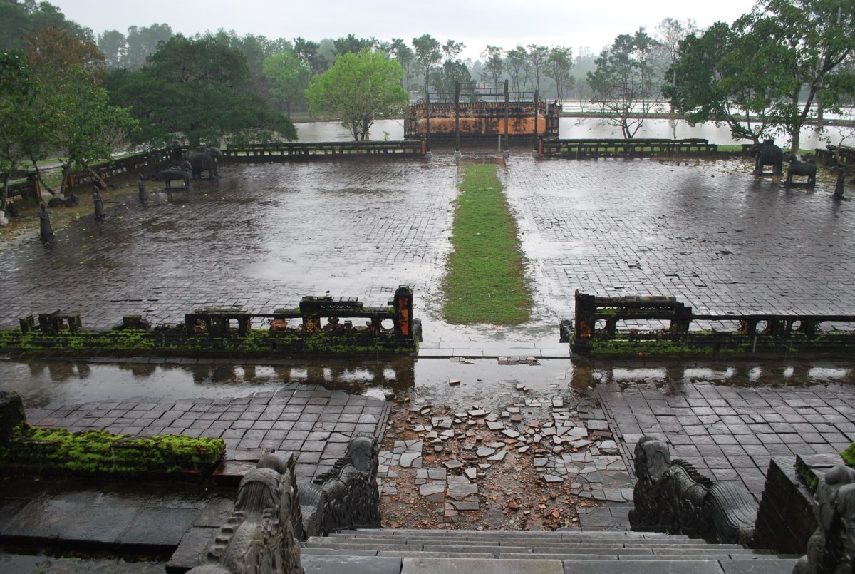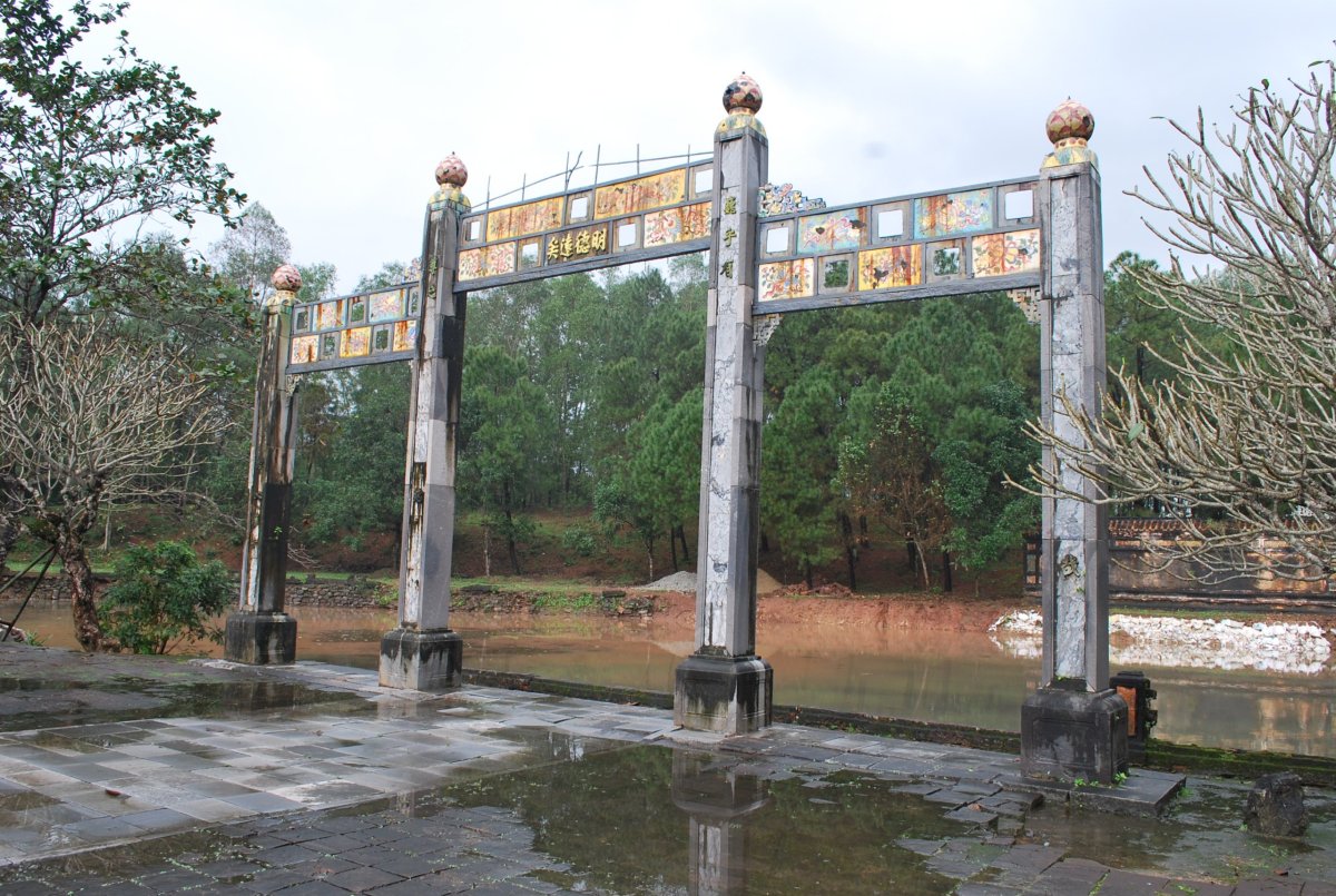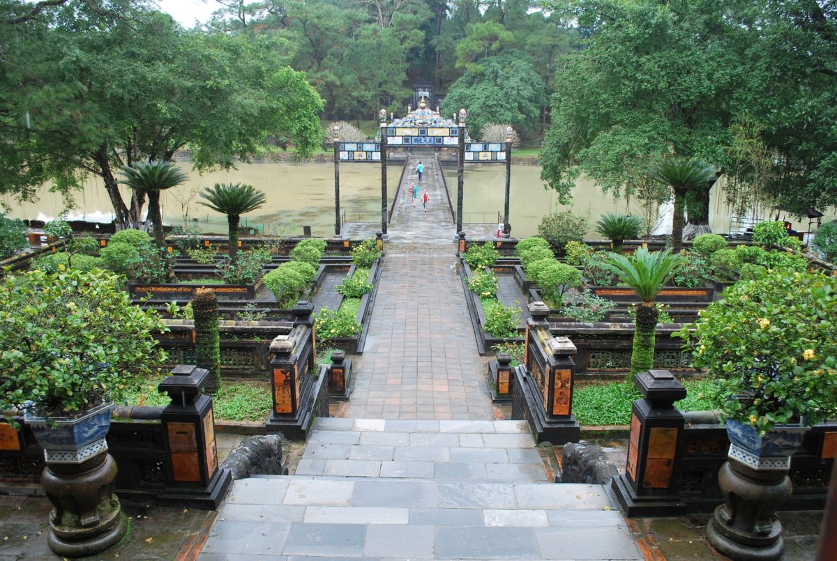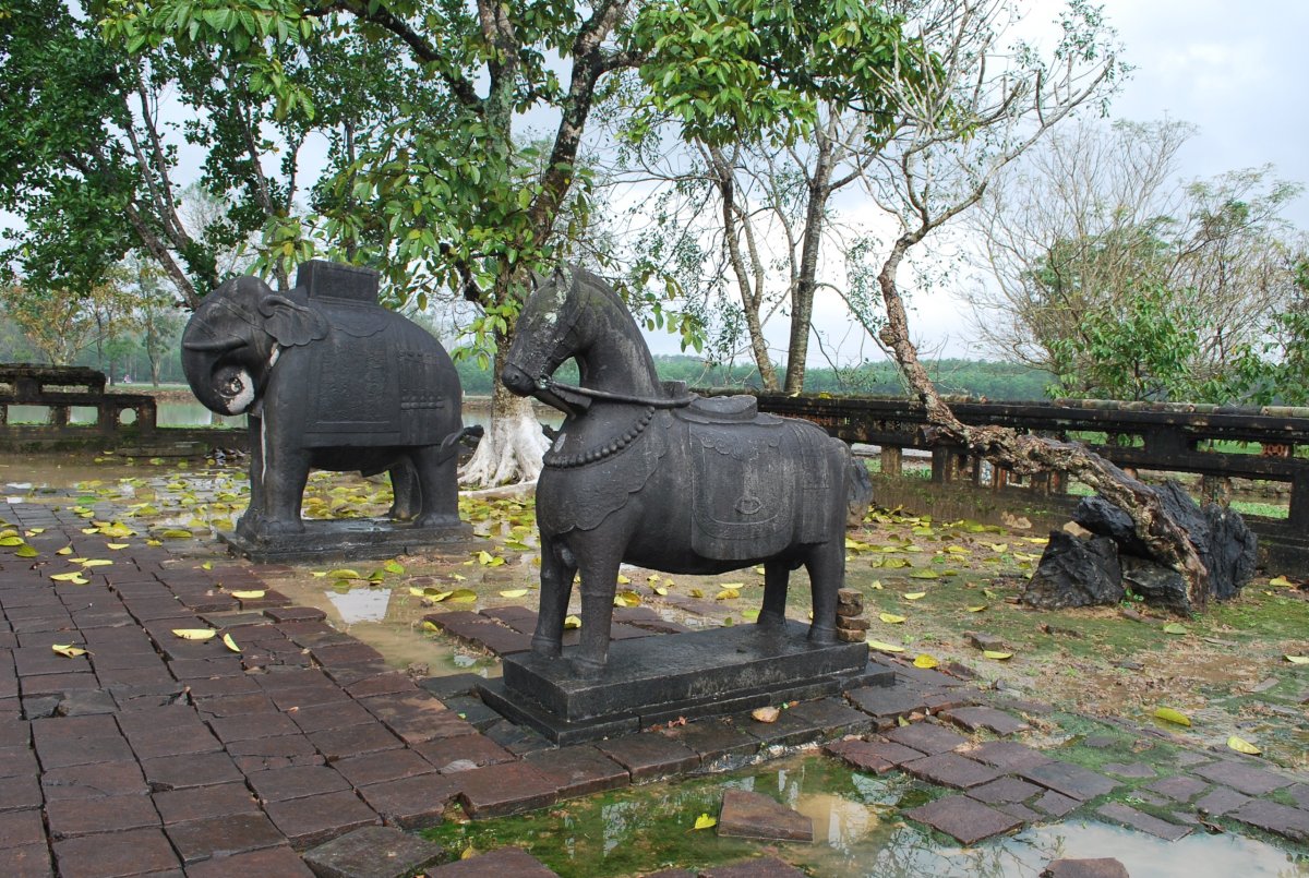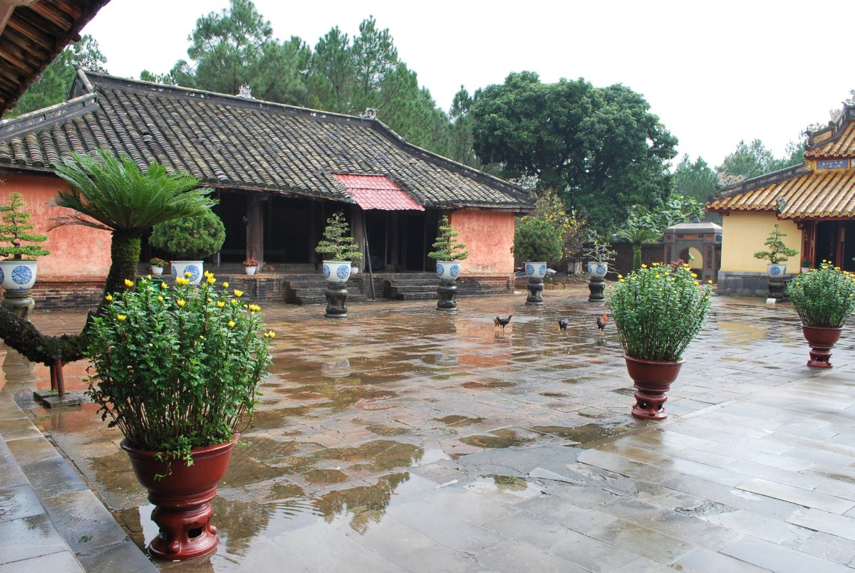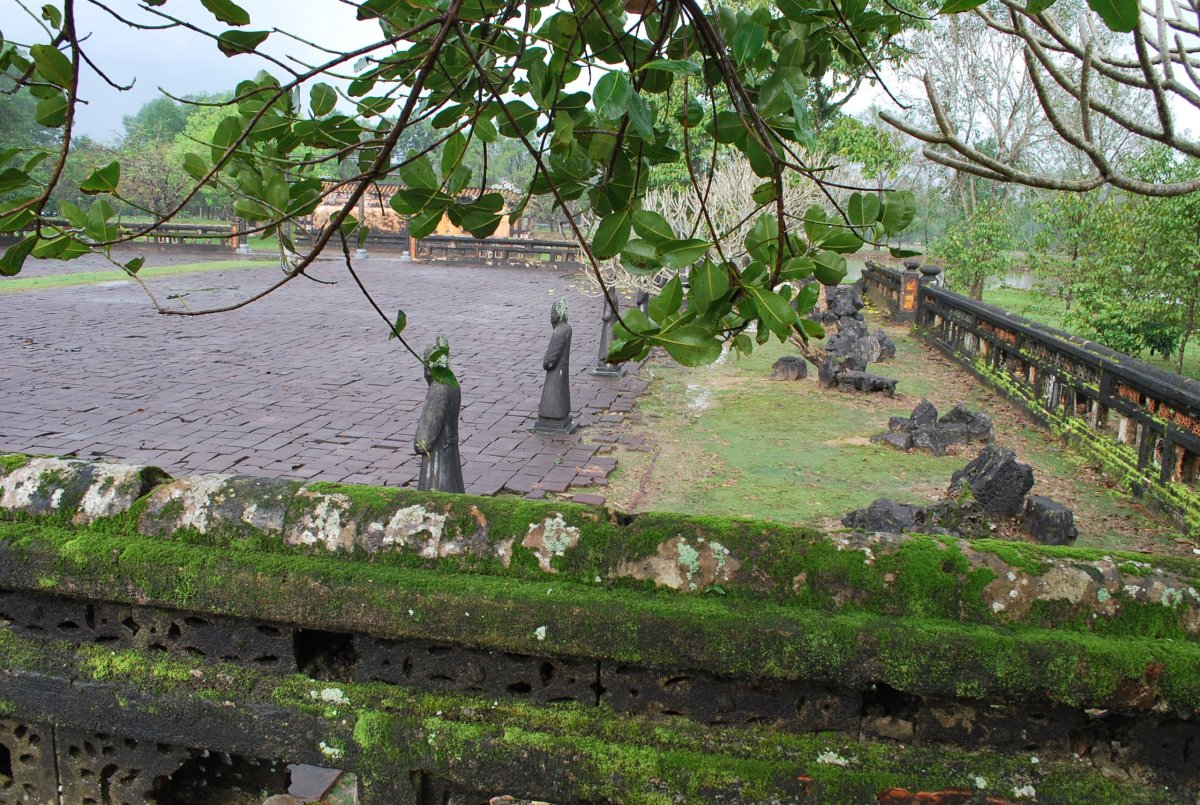 Po výborné snídani (personál v hotelu je opravdu moc milý) si za 7 dolarů půjčujeme motorku a jedeme si prohlédnout císařské hrobky v okolí Hué. Všechny hrobky mají dvě části – první je určena pro pohřební účely, druhá pro samotnou hrobku. V každém komplexu jsou hradby, trojitá brána, dvůr pozdravů, stély, pavilony, chrámy, zahrady, jezírka a samotná hrobka. První, kterou navštívíme je nejhezčí, a ačkoliv čekáme nejdřív asi 5 minut u benzínky a pak asi 15 minut u pokladny až přestane pršet, rozhodně to stojí za to. Za 2x 40 000 VND si úplně sami prohlédneme celý areál. Hrobka císaře Minh Mang (1820-1840) byla postavena během let 1840-1843. Je považována za nejvíce majestátní ze všech, tvoří ji 40 různě velkých staveb, které jsou umístěny uvnitř oválné hradby, jež má obvod 2 km. Stavby jsou harmonicky zasazeny do okolní přírody, důraz je kladen na symetrii. Bylo zapotřebí 10 tisíc vojáků a umělců, aby byl celý areál hrobky dokončen. Musíme být opatrní, protože chodníky, náměstí a cestičky v areálu jsou vydlážděné keramickou dlažbou, která ukrutně klouže, protože na ní roste nějaký mech, nebo řasa. Je to trochu jako na kluzišti, tak radši chodím po okraji, po trávě. Boty už máme stejně mokré, takže je to jedno. Po prohlídce zase čekáme asi 15 minut u pokladny, až přestane ten největší slejvák. Pak se přesuneme k další hrobce, kde zaplatíme opět za 2x40 000 VND za vstup. Hrobku císaře Tu Duc (1848 – 1883) tvoří 50 staveb harmonicky uspořádaných za 1500 metrů dlouhou osmiúhelníkovou hradbou. Zde je už pár turistů, ale obecně lze říct, že je tu mnohem méně lidí než v Kambodže. Nevím, jestli je to počasím, nebo tím, že jsme v této části Vietnamu. U jednoho z jezírek v areálu hrobky si za 5 000 VND koupím granule na krmení ryb, a v jezírku s nimi nakrmím Koi kapry, kterých je tam spousta a jsou na krmení od turistů zvyklí. Po prohlídce této hrobky si z motorky prohlédneme ještě jednu hrobku, jenom tak ze silnice, vyhneme se stádu krav na cestě a zastavíme u stánku s vonnými tyčinkami. Tady nám paní ukáže, jak se tyčinky vyrábí, chce, abych si to taky zkusila, ale nechce se mi patlat v té hmotě, co dávají na bambusové tyčky. Koupíme si tyčinky s vůní citrónové trávy. A pak jedeme zpět do Hué, abychom si prohlédli císařský palác. Ten zavírá v 17 hodin, tak abychom to stihli. Císařské město leží uvnitř Citadely, a stálo tam 150 paláců. Dovnitř se vstupovalo čtyřmi branami, nejznámější je Polední brána (Ngo Mon) z roku 1833. Brána je dvoupatrová a v přízemí má pět vchodů. V prvním patře se nalézá Pavilon pěti Fénixů, kde pobýval při důležitých příležitostech císař. Střecha je pokryta zlacenými taškami. Za 2 x150 000 VND si koupíme u této brány vstupenky a pak jsme speciálním vchodem pro cizince vpuštěni do císařského města. Vstupenky platí i do muzea, které je hned vedle císařského města. Císařský palác je obrovský, vyzdobený na oslavu svátku TET, takže všude jsou prapory, květiny, stromy clementinek v květináčích. V areálu je možné jezdit elektrickými vozíky s průvodcem. Kolem půl páté odcházíme ze „Zakázaného Purpurového města“ tedy z císařského paláce a na motorce jedeme zpět do hotelu. Do muzea, kde je vystavena vojenská technika už nejdeme. Na hotelu si trochu odpočineme a na večeři dojdeme asi 100 metrů od hotelu do další restaurace doporučené v Tripadvisoru.