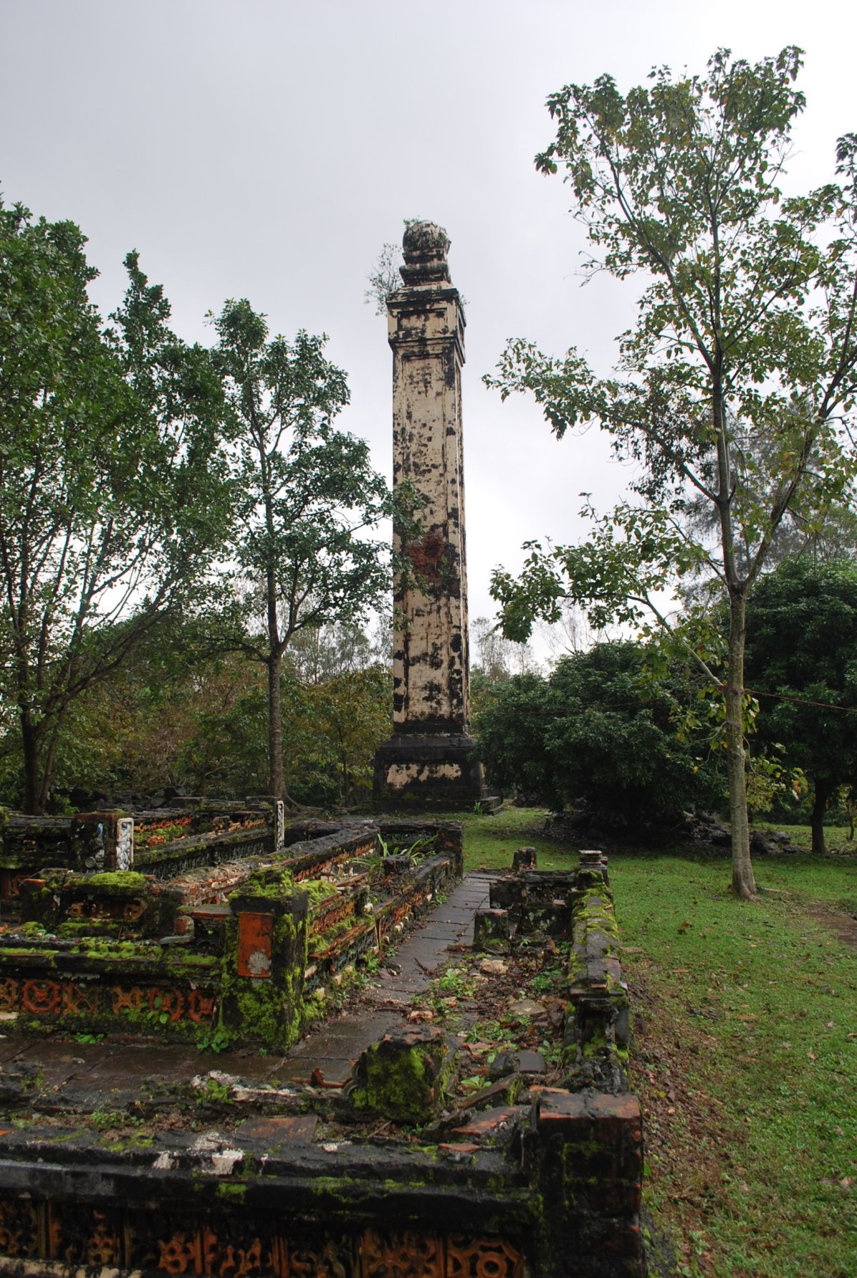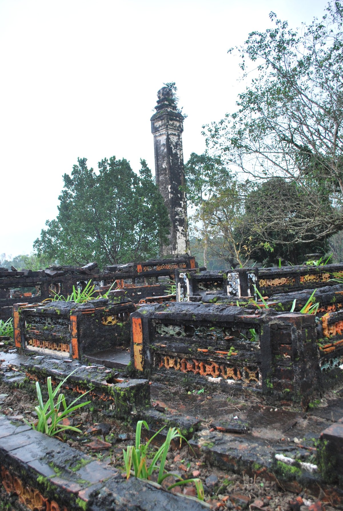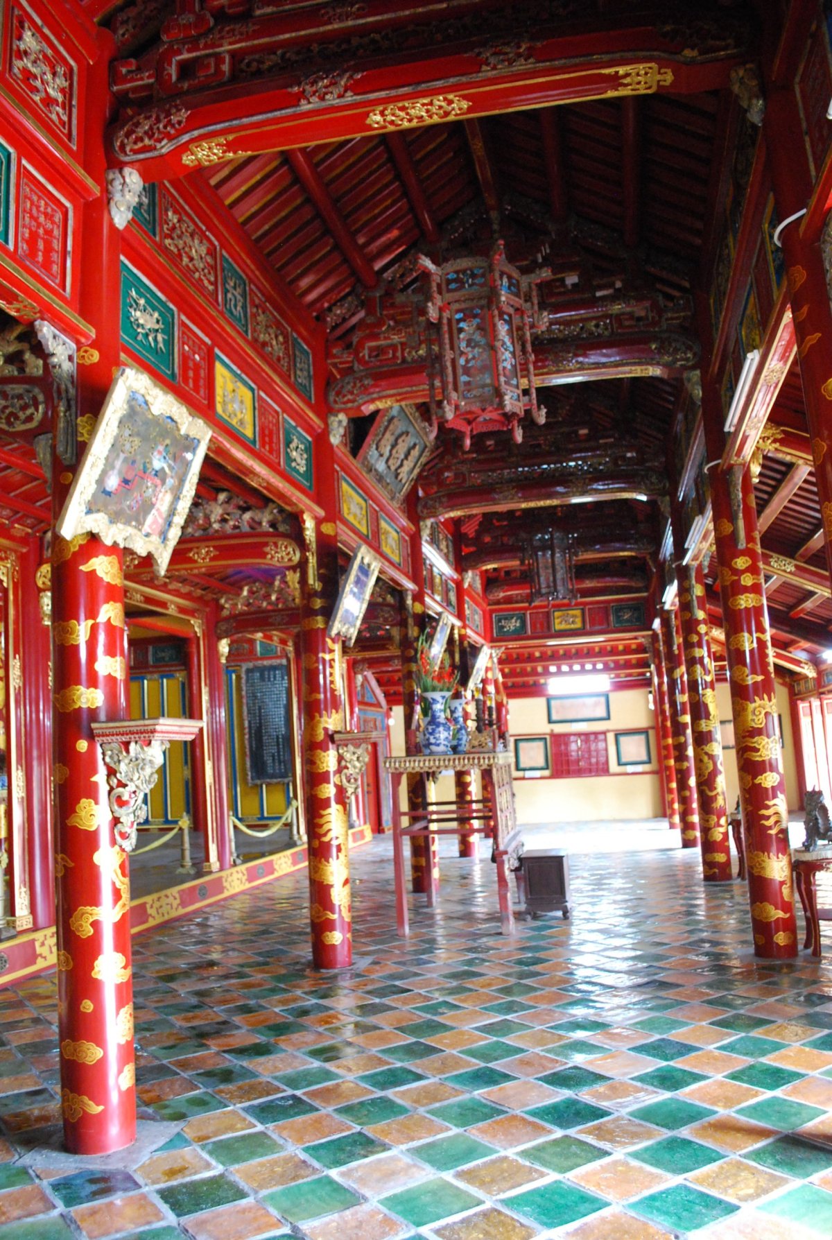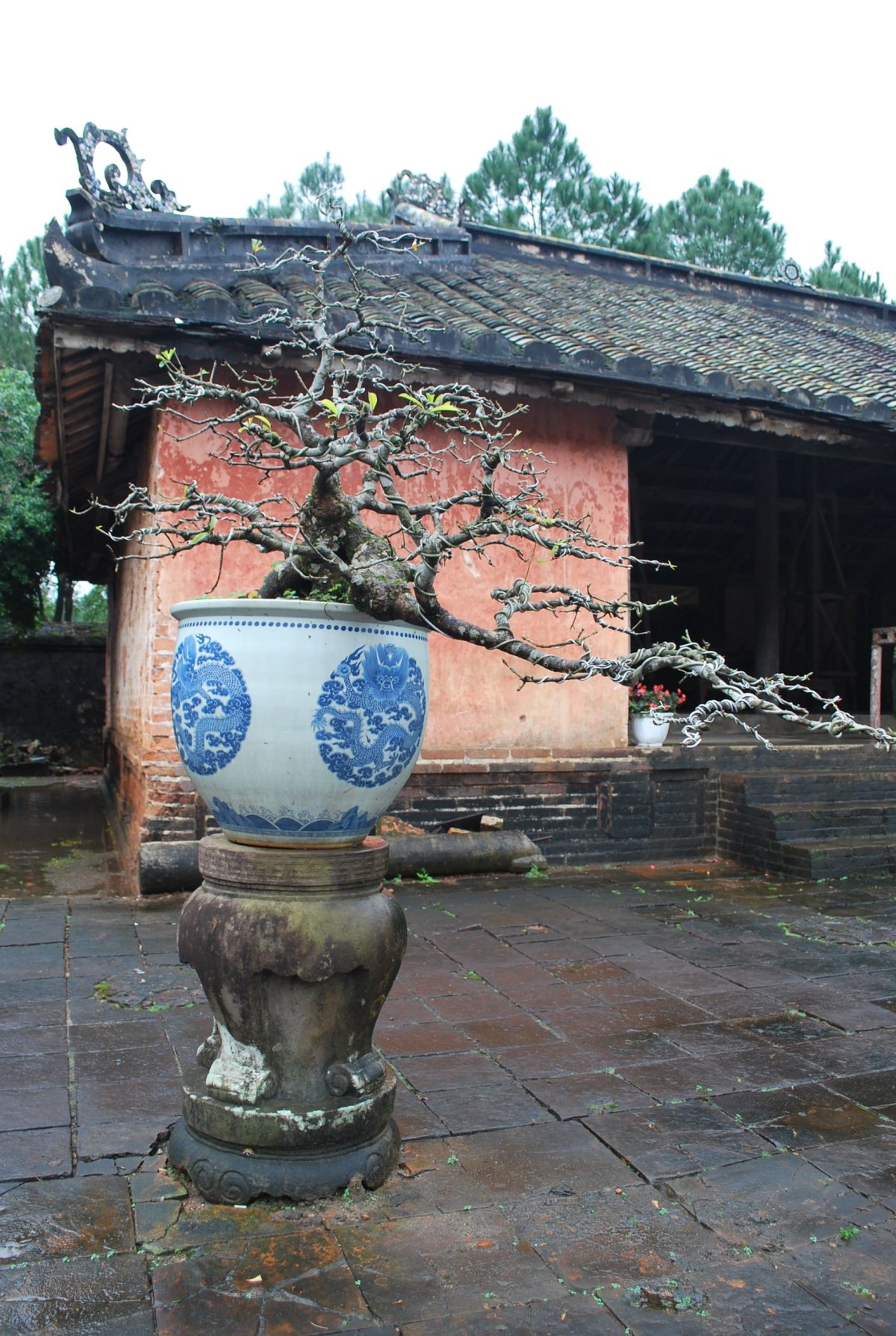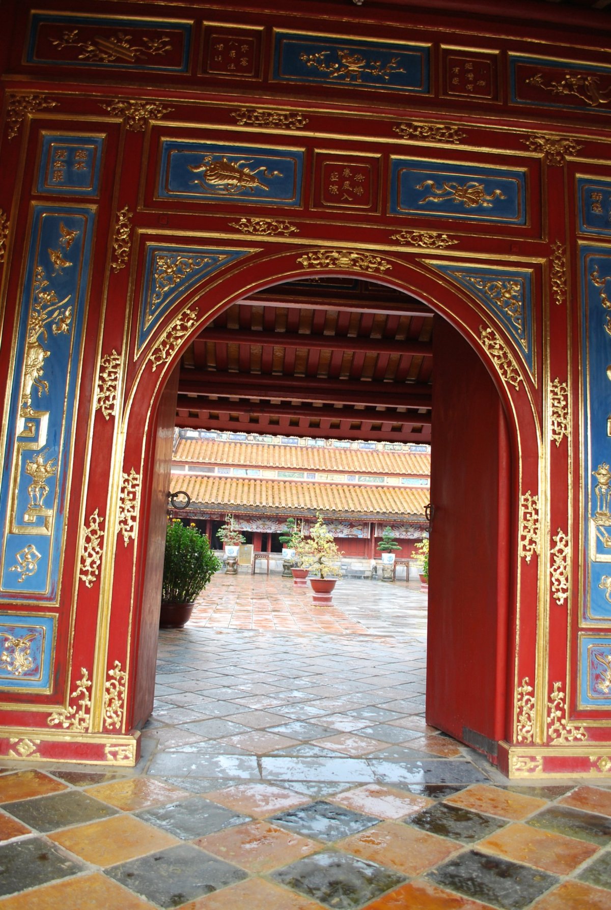 Po výborné snídani (personál v hotelu je opravdu moc milý) si za 7 dolarů půjčujeme motorku a jedeme si prohlédnout císařské hrobky v okolí Hué. Všechny hrobky mají dvě části – první je určena pro pohřební účely, druhá pro samotnou hrobku. V každém komplexu jsou hradby, trojitá brána, dvůr pozdravů, stély, pavilony, chrámy, zahrady, jezírka a samotná hrobka. První, kterou navštívíme je nejhezčí, a ačkoliv čekáme nejdřív asi 5 minut u benzínky a pak asi 15 minut u pokladny až přestane pršet, rozhodně to stojí za to. Za 2x 40 000 VND si úplně sami prohlédneme celý areál. Hrobka císaře Minh Mang (1820-1840) byla postavena během let 1840-1843. Je považována za nejvíce majestátní ze všech, tvoří ji 40 různě velkých staveb, které jsou umístěny uvnitř oválné hradby, jež má obvod 2 km. Stavby jsou harmonicky zasazeny do okolní přírody, důraz je kladen na symetrii. Bylo zapotřebí 10 tisíc vojáků a umělců, aby byl celý areál hrobky dokončen. Musíme být opatrní, protože chodníky, náměstí a cestičky v areálu jsou vydlážděné keramickou dlažbou, která ukrutně klouže, protože na ní roste nějaký mech, nebo řasa. Je to trochu jako na kluzišti, tak radši chodím po okraji, po trávě. Boty už máme stejně mokré, takže je to jedno. Po prohlídce zase čekáme asi 15 minut u pokladny, až přestane ten největší slejvák. Pak se přesuneme k další hrobce, kde zaplatíme opět za 2x40 000 VND za vstup. Hrobku císaře Tu Duc (1848 – 1883) tvoří 50 staveb harmonicky uspořádaných za 1500 metrů dlouhou osmiúhelníkovou hradbou. Zde je už pár turistů, ale obecně lze říct, že je tu mnohem méně lidí než v Kambodže. Nevím, jestli je to počasím, nebo tím, že jsme v této části Vietnamu. U jednoho z jezírek v areálu hrobky si za 5 000 VND koupím granule na krmení ryb, a v jezírku s nimi nakrmím Koi kapry, kterých je tam spousta a jsou na krmení od turistů zvyklí. Po prohlídce této hrobky si z motorky prohlédneme ještě jednu hrobku, jenom tak ze silnice, vyhneme se stádu krav na cestě a zastavíme u stánku s vonnými tyčinkami. Tady nám paní ukáže, jak se tyčinky vyrábí, chce, abych si to taky zkusila, ale nechce se mi patlat v té hmotě, co dávají na bambusové tyčky. Koupíme si tyčinky s vůní citrónové trávy. A pak jedeme zpět do Hué, abychom si prohlédli císařský palác. Ten zavírá v 17 hodin, tak abychom to stihli. Císařské město leží uvnitř Citadely, a stálo tam 150 paláců. Dovnitř se vstupovalo čtyřmi branami, nejznámější je Polední brána (Ngo Mon) z roku 1833. Brána je dvoupatrová a v přízemí má pět vchodů. V prvním patře se nalézá Pavilon pěti Fénixů, kde pobýval při důležitých příležitostech císař. Střecha je pokryta zlacenými taškami. Za 2 x150 000 VND si koupíme u této brány vstupenky a pak jsme speciálním vchodem pro cizince vpuštěni do císařského města. Vstupenky platí i do muzea, které je hned vedle císařského města. Císařský palác je obrovský, vyzdobený na oslavu svátku TET, takže všude jsou prapory, květiny, stromy clementinek v květináčích. V areálu je možné jezdit elektrickými vozíky s průvodcem. Kolem půl páté odcházíme ze „Zakázaného Purpurového města“ tedy z císařského paláce a na motorce jedeme zpět do hotelu. Do muzea, kde je vystavena vojenská technika už nejdeme. Na hotelu si trochu odpočineme a na večeři dojdeme asi 100 metrů od hotelu do další restaurace doporučené v Tripadvisoru.