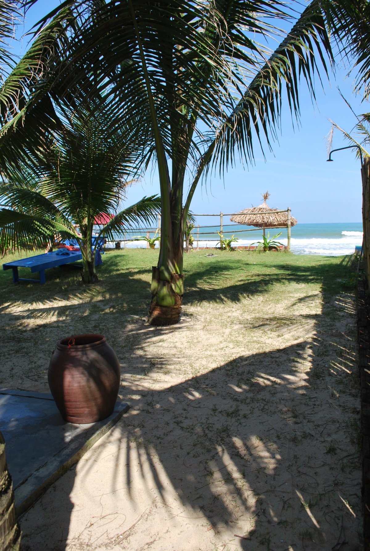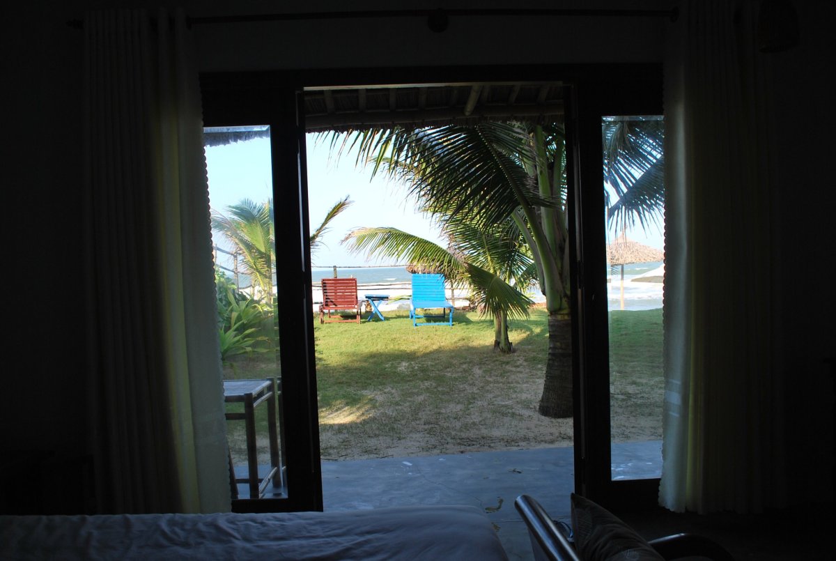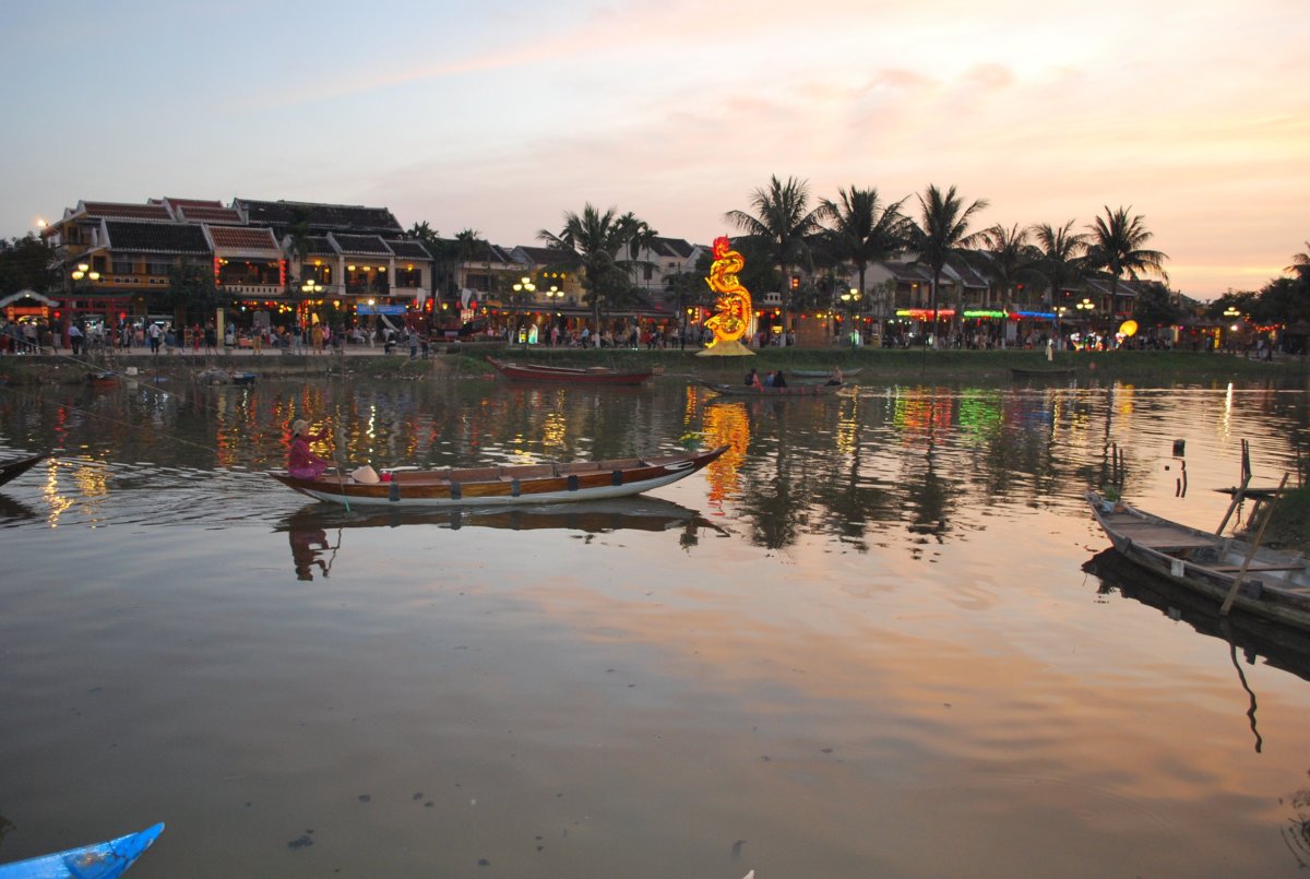 Po snídani se odhlašujeme z hotelu a taxíkem jedeme na vlakové nádraží. Asi 45 minut čekáme na vlak, který má 10 minut zpoždění. A pak už klimatizovaným vagónem frčíme zpět do Da nangu. Cesta dlouhá asi 100 km trvá 2,5 hodiny, ze začátku vlak jede poměrně rychle, ale pak se přiblížíme k pobřeží, kde je spousta tunelů a zatáčky, takže vlak jede asi 10 km rychlostí. Tato trať je údajně nejhezčí v celém Vietnamu, vede přímo po pobřeží, na útesech přímo nad mořem, a protože byl monzun, moře bylo rozbouřené a vlny byly opravdu obrovské. Po příjezdu do Da nangu hledáme podle mapy zastávku autobusu č.1, který má coby příměstský autobus jezdit ve 20 ti minutových intervalech do města Hoi an. Najdeme jednu zastávku kousek od nádraží, ale je na ní nalepený nějaký papír, tak se ptáme místního chlapíka v obchodě vedle zastávky a ten říká, že tahle zastávka nefunguje, musíme jít o kousek dál. Tak ujdeme asi 300 metrů a najdeme další zastávku. Není zde žádný jízdní řád, jenom číslo autobusu 1 a 8. Tak čekáme. Přijede nějaký týpek na motorce, ptá se, kam jedeme a že nás do Hoi an hodí na motorce, každého za 200 000 VND. No tak to určitě, když je to asi 25 km. A autobus má stát určitě míň. Tak se nás snaží zviklat, že autobus nejede, že tam nestaví atd. Pak tam přiveze nějakou starou babku, která má pusu červenou od žvýkání betelu a chce se s námi družit, což mi není vůbec příjemné, protože na mě pořád sahá. Tak se trochu odsuneme. Z obchodu vyjde nějaký chlapík s dítětem a ptá se, jestli jedeme do Hoi an. Že vzhledem k tomu, že brzy bude TET svátek, tak to bude možná trvat trochu déle, ale že autobus přijede. Celkově na autobus čekáme asi 35 minut, nakonec tedy přijel. Když přijel, ptala jsem se průvodčího, kolik chce peněz, říkal že 100 000 VND, za oba. Tak jsem mu je dala, nalezli jsme do autobusu a jeli. V autobuse na nás mluvili nějací cizinci, asi Angličané, že po nich chtěli za lístky 200 000 VND, tak jim nic nedali. Koukali jsem tedy kolik platí za autobus místní a bylo to 20 000 VND. Pěkně nás tedy natáhli. Takže jsme se s Anglánama domluvili, ať nic neplatí, že jsem jim v podstatě zaplatili lístek my. Chvíli jsme se s průvodčím dohadovali, pak Štěpa začal mluvit česky, že nás chtěli okrást a že na ně zavoláme policii. To se průvodčí uklidnil a my jsme dojeli až do Hoi an. Tam nám Angličani dali 40 000 VND za lístky a šli jsme shánět taxíka. V Hoi an jsme měli zarezervované na tři dny ubytování v bungalovu na pláži. Taxíkem jsme tam dojeli, bylo to asi 4 km od centra města. Majitel ubytování byl sympatický chlapík, který nás nechal první den bydlet v lepším bungalovu, než jsme měli zaplacený, s výhledem přímo na moře. Pláž byla asi 10 metrů od bungalovu. Po ubytování jsme šli vyzkoušet Jihočínské moře, a na první smočení bylo studené, ale pak se to dalo. Akorát byly velké vlny, a hlavně silný proud, který táhl hodně na moře, takže jsme se cachtali jenom u okraje. K večeru jsme si od majitele půjčili kola, která vypadala docela dobře, ale zdání klamalo. Jeli jsme asi 4,5 km do historického centra města. Městu se přezdívá město tisíce lampionů. A opravdu, lampiony byly všude. Nejdřív jsme projeli úplný střed města a pak našli restauraci doporučovanou v průvodci – jmenovala se Secret garden a byla opravdu schovaná, vedla k ní jenom úzká ulička označená malinkou cedulkou. Ale restaurace byla nádherná a jídlo výborné. Sice trochu dražší – zejména když omylem naúčtovali 1,5 dl vína za 350 000 VND, ale jídlo bylo opravdu moc dobré. Po večeři jsme ještě pokoukali po obchodech se suvenýry, koupili jsme si místní víno a jeli zpět. Večer jsme si sedli na pláž, pili víno a koukali na hvězdy.