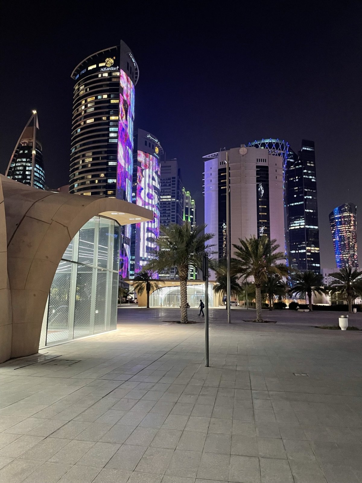 Na Dauhá jsou obdivuhodné mrakodrapy, téměř žádný není stejný. A co teprve večer. A ještě jedna celkem pochopitelná zvláštnost. Minimum lidí během dne. Všichni totiž jezdí autem. A co by kdo také pohledával venku mezi domy. Nikde žádné obchůdky. Jen věžáky a hotely. Za celou dobu jsem nenašla obchod, kde by měli pohlednice. A ještě jedna věc mě zaujala. Přijdete do restaurace, a jídelní a nápojový lístek dostanete jako QR kód na cedulce, kterou vám přinese číšník. Doporučuji navštívit vyhlídkovou restauraci JIWAN. Je v horním patře národního muzea. Je odtud krásný výhled. Mají výbornou baklavu i kapučíno. Káva stojí 20 QAR a baklava 30 QAR. Nahoru se jede výtahem, a místo v restauraci je na objednání. Ale odpoledne tam bylo volno.
