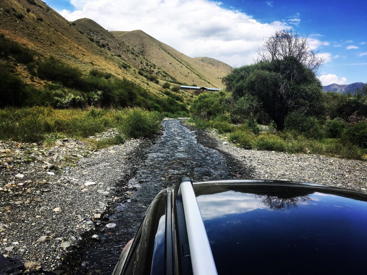 Od autopůjčovny jsme dostaly jasný istrukce – jezero Kaindy je bez problémů, ale na jezero Kolsai za žádnou cenu stímhle autíčkem nesmíme. Když tak koukáme na fotky, tak jsme rády, že uvidíme to jezero, které máme schválený . Sjíždíme zhlavní silnice, mapy ukazují cíl za deset kilometrů a my máme pocit, že se karta konečně obrací. Tenhle pocit pomíjí zhruba po jednom kilometru, tedy po deseti minutách. Vzpomínáme na naší ohromnou Toyotu v Kyrgystánu a ignorujeme ten fakt, že máme městský auto do garáže.