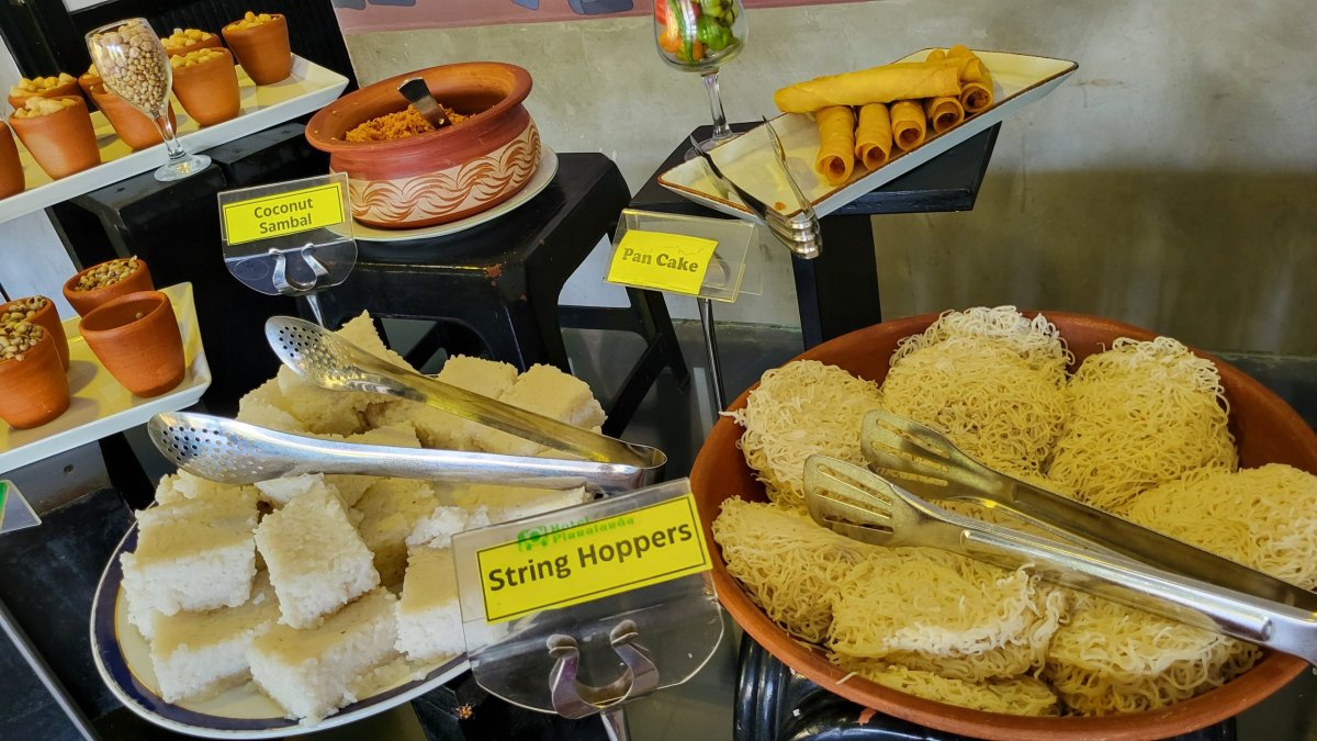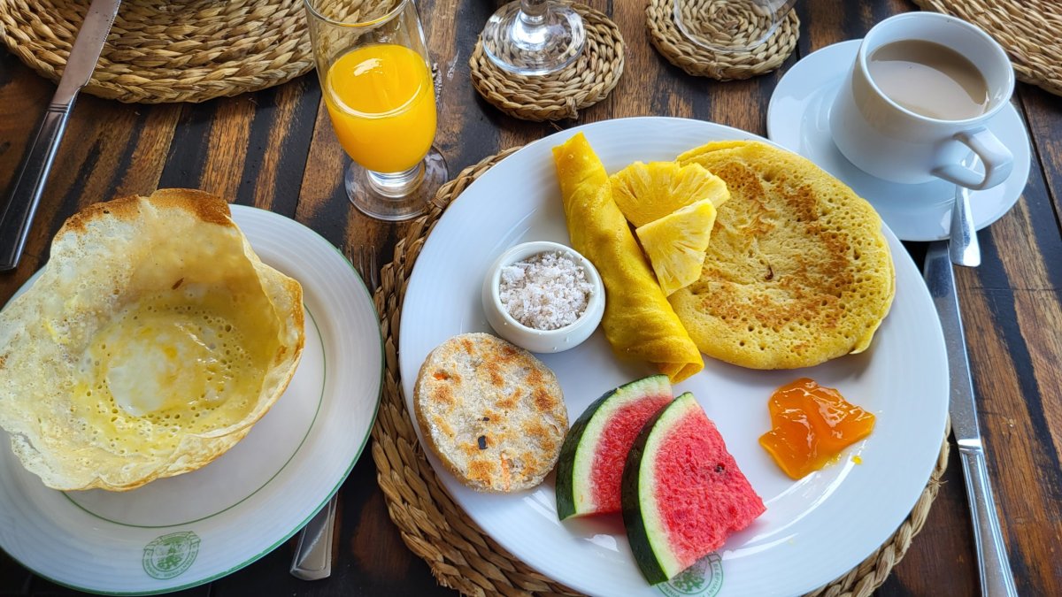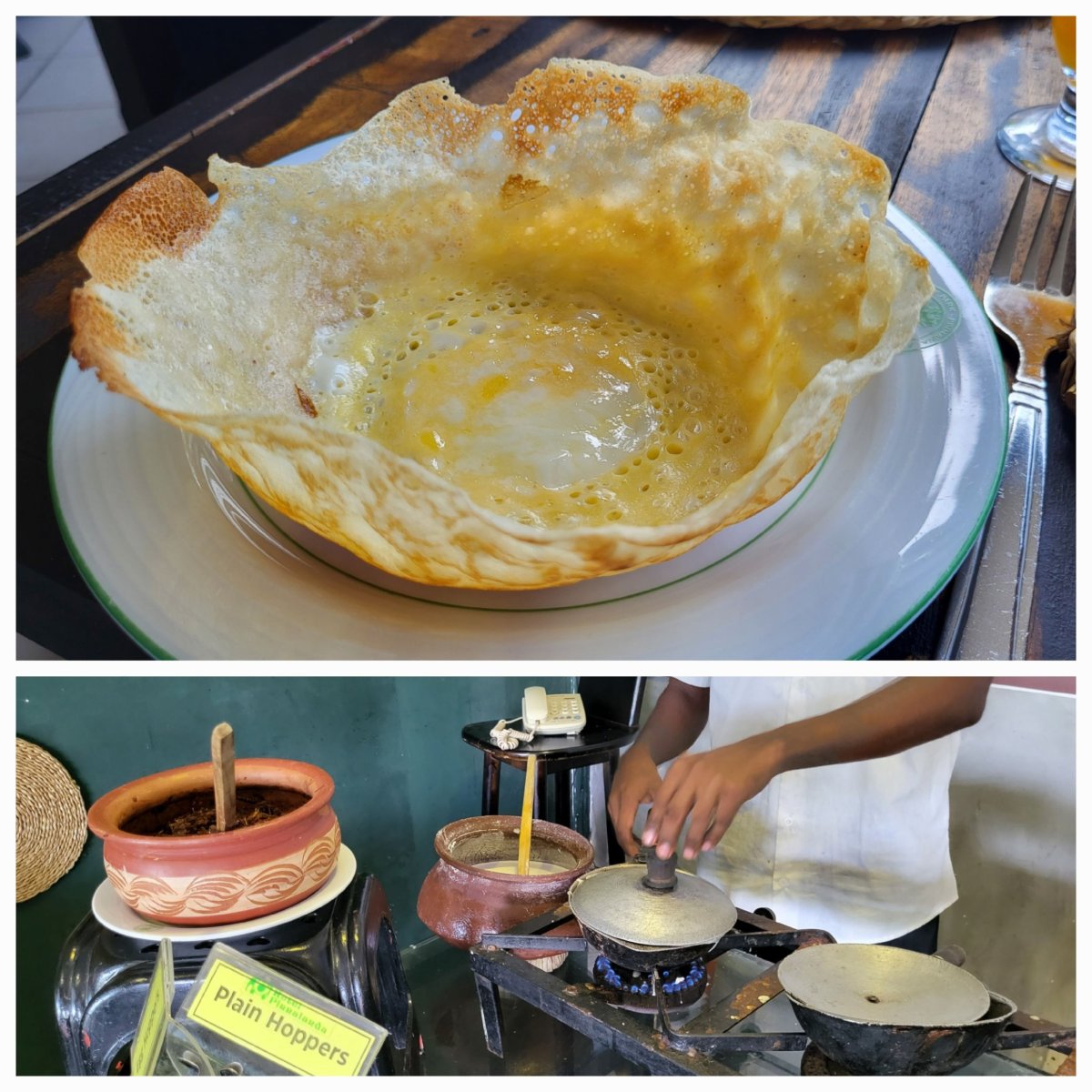 Ráno na terase je nádherné! K řece už přichází sloni a my míříme na snídani. Tolik nových chutí a takový výběr jsme nečekali. Ochutnáváme lehce pálivé dhall curry a chicken curry s rýží a nudlemi a kromě různých palačinek, koláčků a párků tu máme i "kokosový koutek" s plackami, trojhránky, kokosovou moučkou a kokosem s chilli papričkami (pol sambol). Zamilovala jsem si (asi i kvůli designu) srílanské "egg hopper" (v překladu "zásobník na vejce"). Je to křupavá palačinka z kokosovo-rýžového těsta (rýžová mouka + kokosové mléko) ve tvaru misky, ve které se nakonec usmaží vejce. Připravuje se ve speciální pánvi.