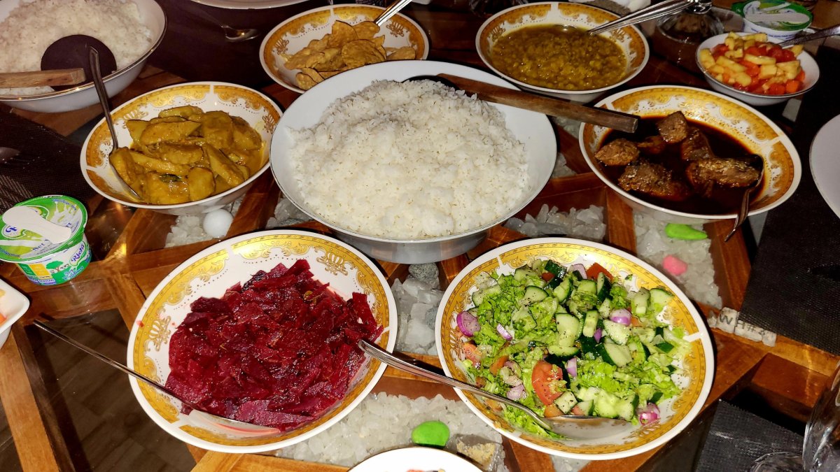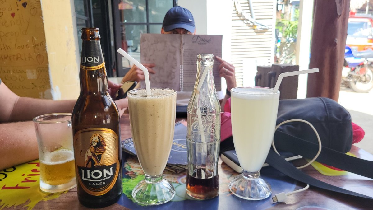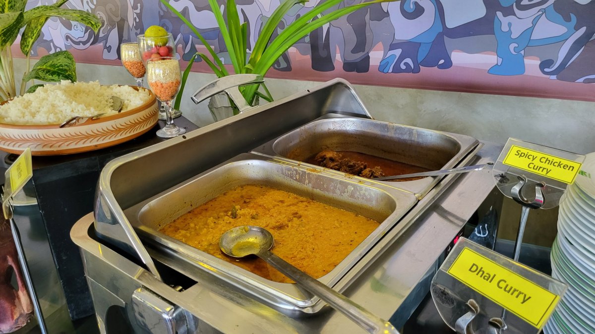 Večeře je výborná a překvapivě bufetová. Nejlepší je kuřecí curry a srílanské kottu a všeho je dost i na přidání. Srílančané alkohol téměř nepijí, ani se tu běžně neprodává, ale pro turisty se pivo vždycky najde. Moc levné není, stojí 50-75 Kč za 0,6 l. My 3 ho nemusíme, ale Robert ano :)