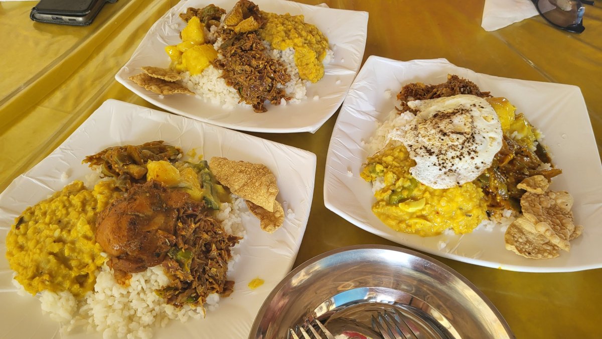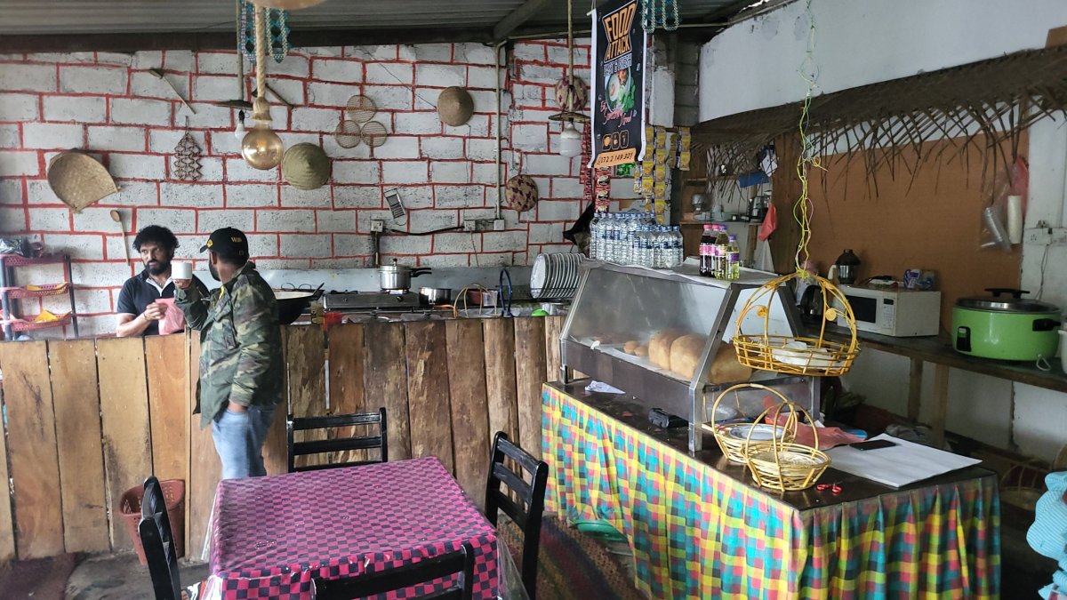 A dostáváme hlad. Každý den ráno se nehorázně nacpeme na snídani a do busu si k obědu kupujeme ve stáncích různé smažené, plněné a někdy i pálivé luštěninové nebo zeleninové taštičky, trojhránky nebo koblížky. A teď bychom rádi něco pořádného a teplého. Hledáme hospodu pro místní a najdeme jen malou dřevěnou boudu. Uvnitř to nevypadá moc lákavě, ale nesmrdí to tu a máme velký hlad. Jsou tu jen 2 stoly, u vedlejšího pán večeří samotnou hromadu rýže, samozřejmě rukou. Objednáváme si 4x kottu a doufáme, že dostaneme příbory. Kottu je srílanská specialita, mají ji téměř všude. Je to vlastně jídlo ze zbytků, tedy pokaždé jiné, ale vždy chutné. Většinou se jedná o: nasekané včerejší placky rotti, mrkev, cibule, vejce, curry, chilli, to vše smažené na pánvi. Ale není to žádná "hotovka", vše se tu dělá čerstvé, tak už za chvilinku slyšíme, jak kuchař (a majitel boudy) všechno krájí, seká, smaží a prohazuje na pánvi a přidává koření a krásně to všechno voní a za pár minut nám jeho manželka servíruje oběd jako v té nejlepší restauraci! Kottu je poprvé úhledně naaranžované do čtverce na 4 keramických, naprosto čistých čtvercových talířích, dostáváme i 4 stejné příbory, k tomu v košíčku misku s chilli a pak ještě jednu, máme velkou spotřebu. Nevěřícně na to koukáme, tohle jsme tu nečekali a oni to ví, usmívají se a jsou rádi, že nás překvapili. Ale, co je podstatné, takhle dobré kottu jsme na Srí Lance ještě nejedli! Jídlo i servis chválíme a oběma tím uděláme obrovskou radost! Nedávat na první dojem se při cestování hodně vyplácí. A vlastně i finančně :), porce stála 500 rupií = 38 Kč. Večer Ajithovi chválíme místní hospůdku a on je moc rád, vlastní ji jeho kamarád.