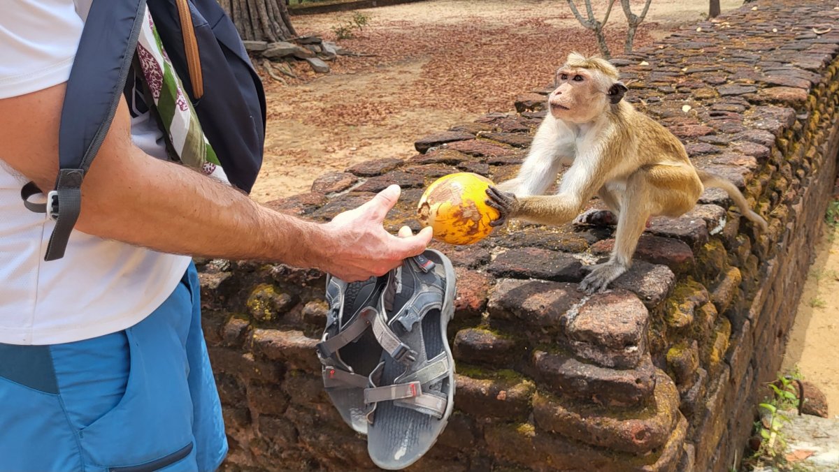 Koupili jsme si kokos, vypili vodu, ale dovnitř se dostat neumíme. A tak ořech předáváme překvapené opici, která ho během chvilky otevře a už se cpe: