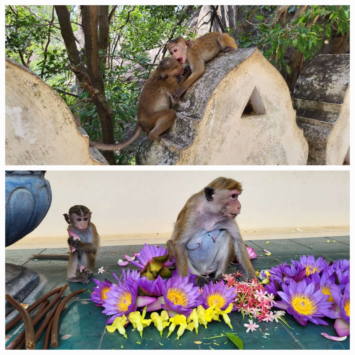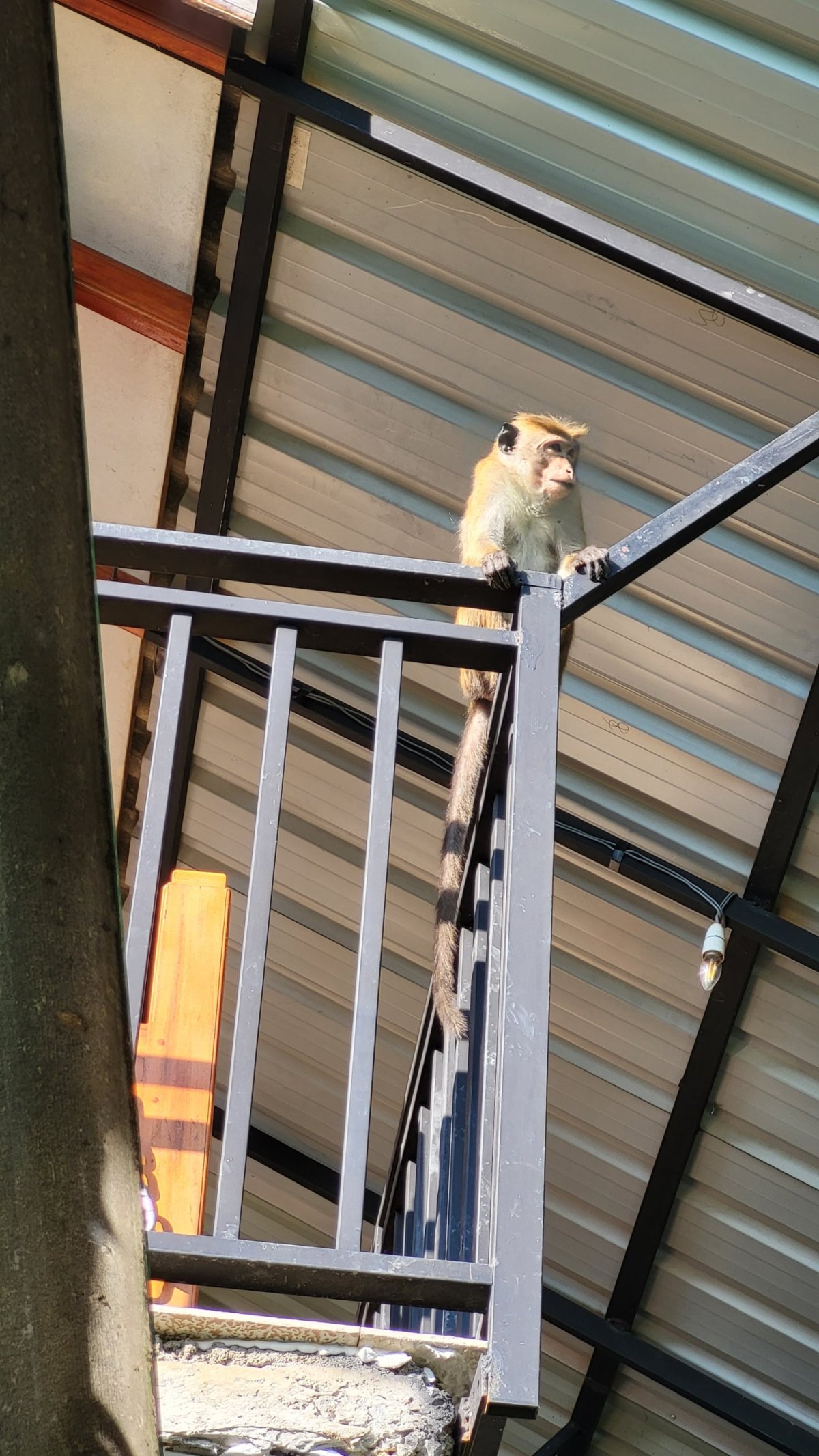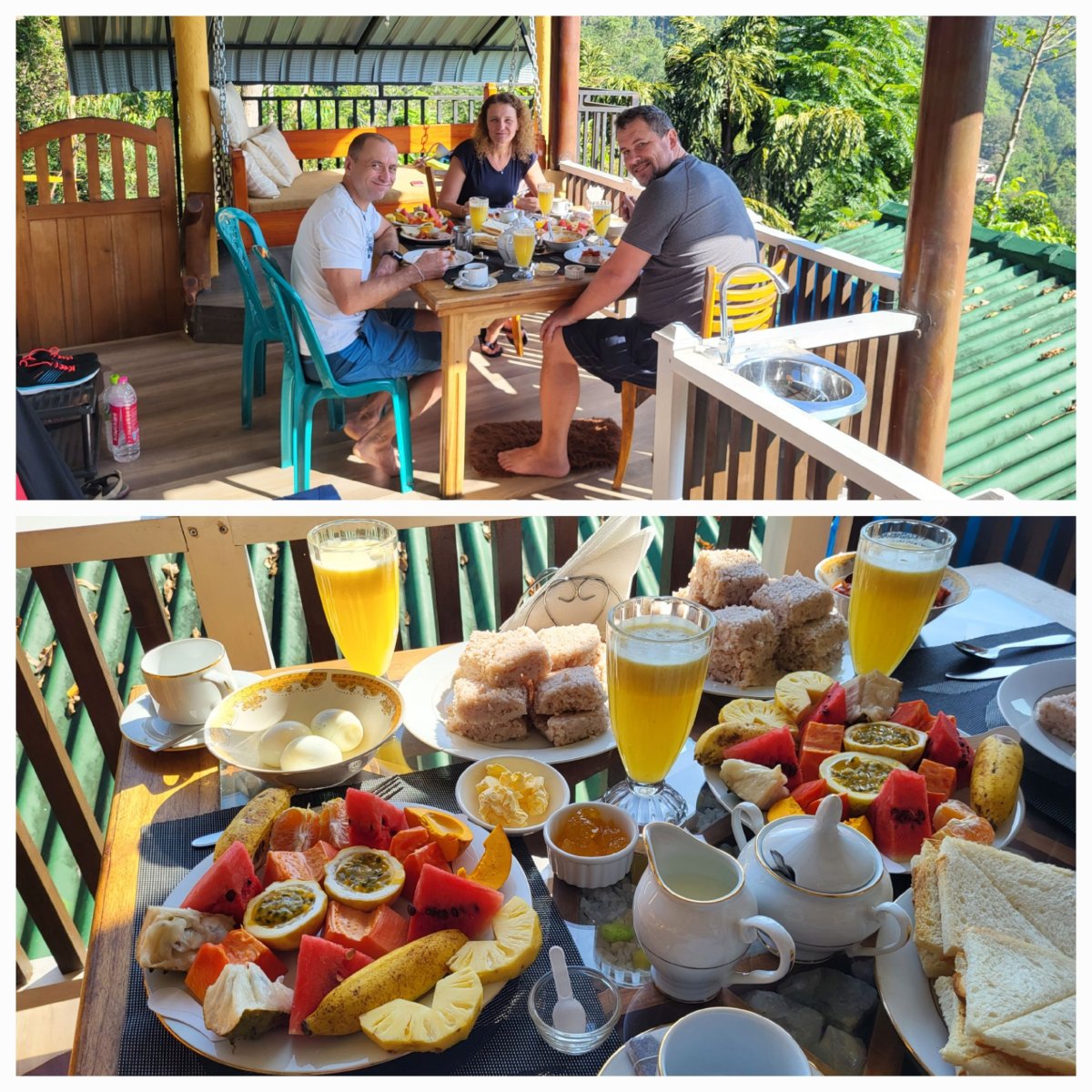 Ráno se probouzíme obklíčeni opicemi. Jsou na střeše, na terase a koukají na nás z okolních stromů. Asi tuší, co se bude dít. Jak říká Imantha, pořádná snídaně je důležitá :) A tuhle snídani a atmosféru těžko někdy někde nějaká překoná. Dokonale naservírované srílanské domácí dobroty: kokosové placky, palačinky s kokosovou náplní s chilli, vaječné omelety s chilli, pálivá zeleninová směs, spousta ovoce, které ani neznáme, papájový fresh juice, káva, čaj. Zíráme na to v němém úžasu, je škoda se do toho pustit. O každém druhu ovoce nám Imantha něco řekne a k tomu všemu ranní slunce a ten výhled! A Imantha se pořád usmívá nebo spíš chechtá, je fakt rád, že si jeho jídlo užíváme. A dokonce ukecal tuk-tukáře, že nás vezme všechny 4 jedním tuk-tukem na celodenní výlet! Ušetřili jsme 10000 rupií za druhý tuk-tuk :)