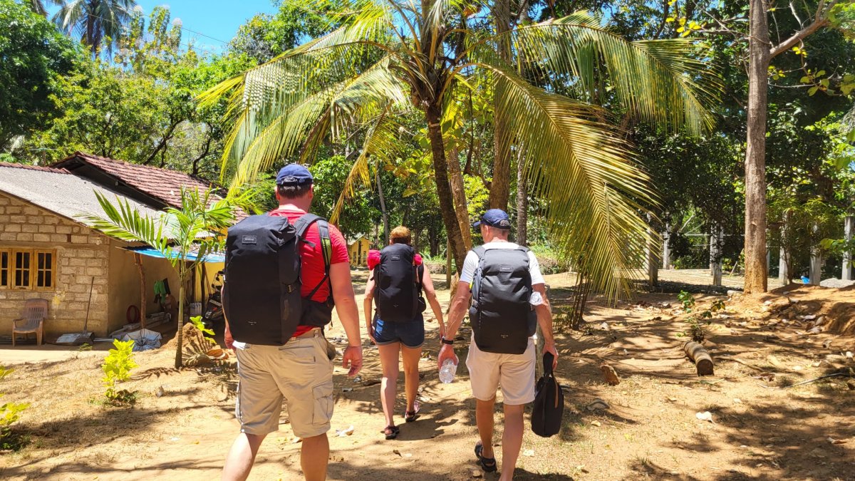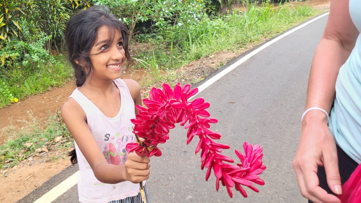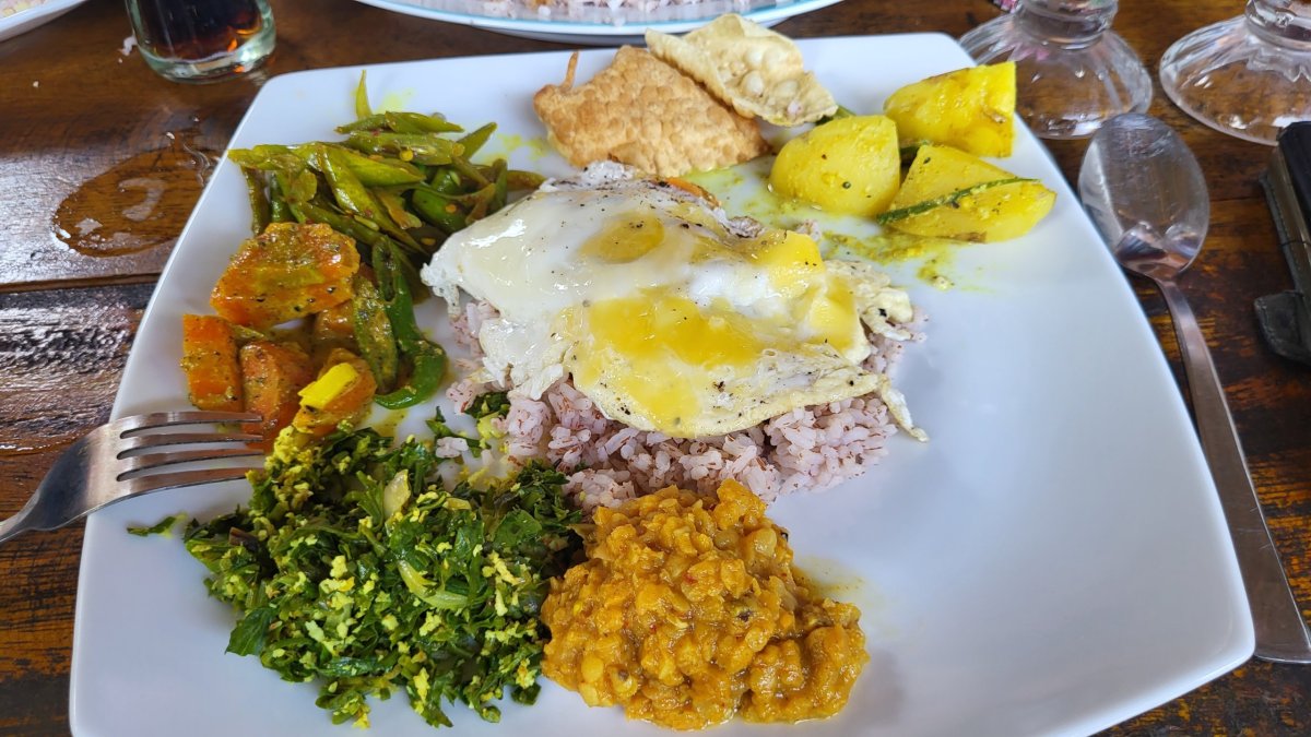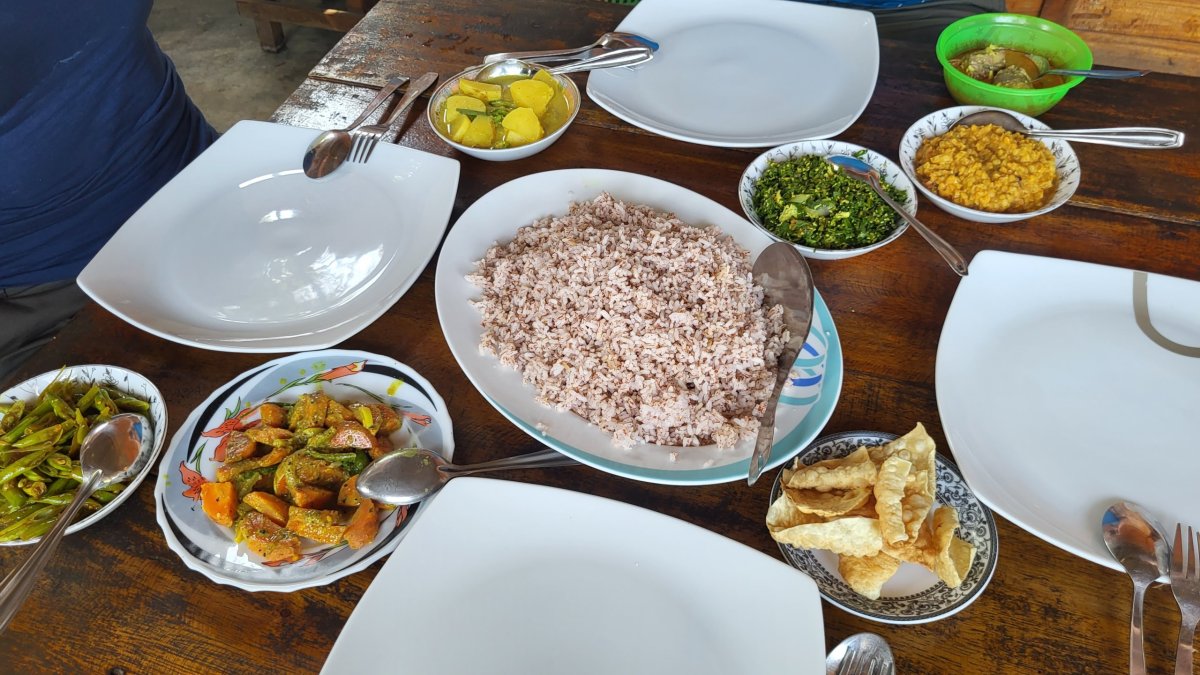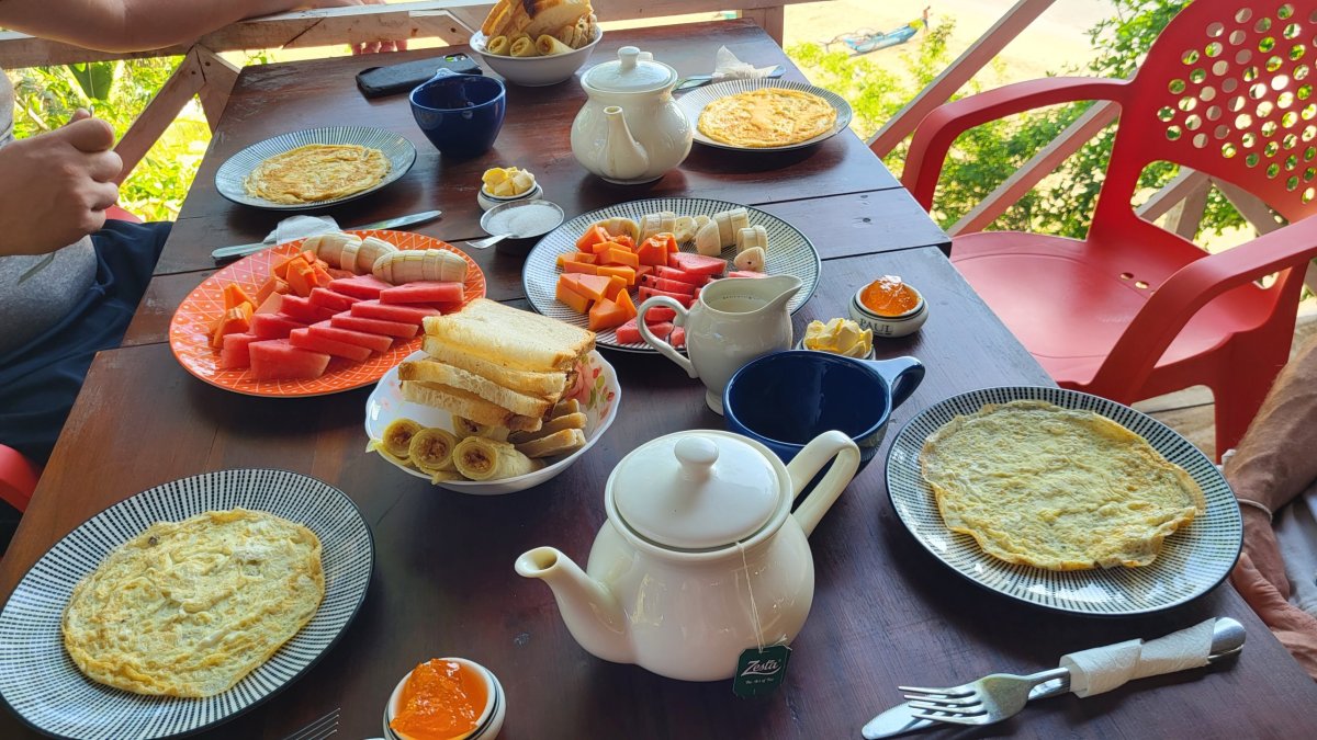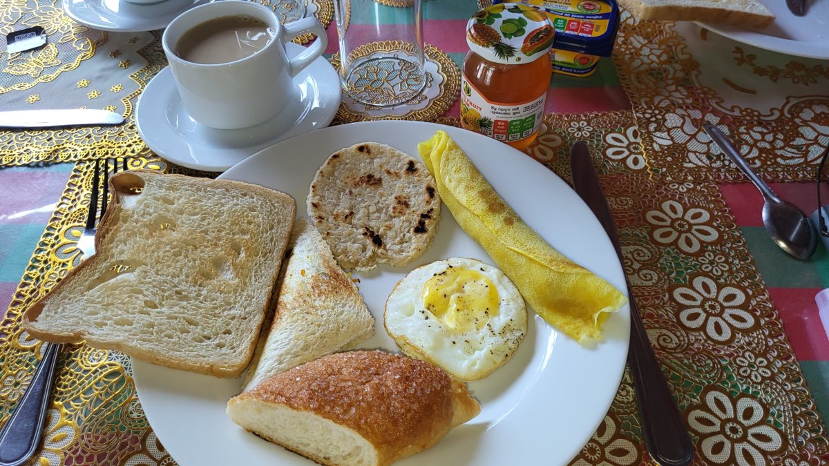 Na tomto místě jsme opravdu nečekali velikou snídani, ale Ajith s manželkou nám připravili plný stůl domácích dobrot: moje oblíbené plněné pálivé palačinky, kokosové placky, 4 vejce!, toasty, ovoce, džem, máslo!, kávu i čaj. Dnes si ale jídlo tolik jako jindy neužíváme. Myslíme na to, že Ajithova rodina bude mít dnes zase jen 2x rýži a ty veselé děti ze včerejší procházky ani to. Zbytky bychom si normálně vzali na cestu, ale tady poprvé hodně jídla necháváme. Víme, že nic z toho Ajith nevyhodí.