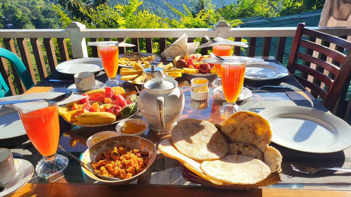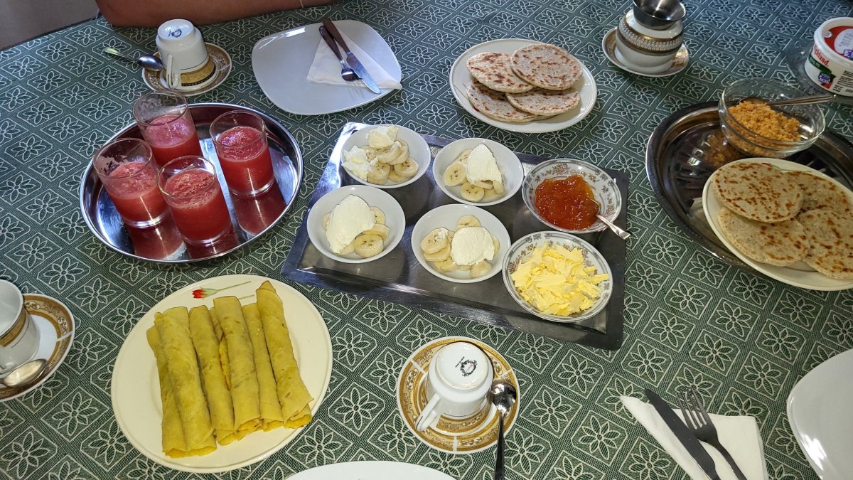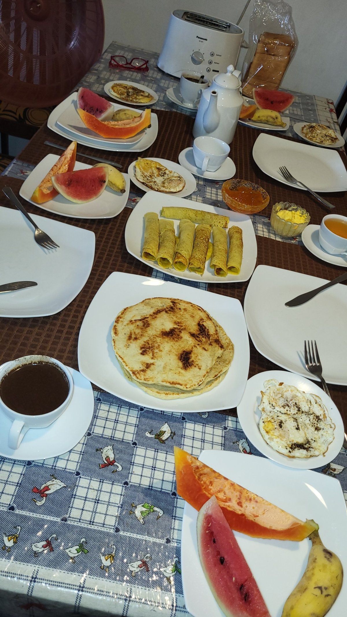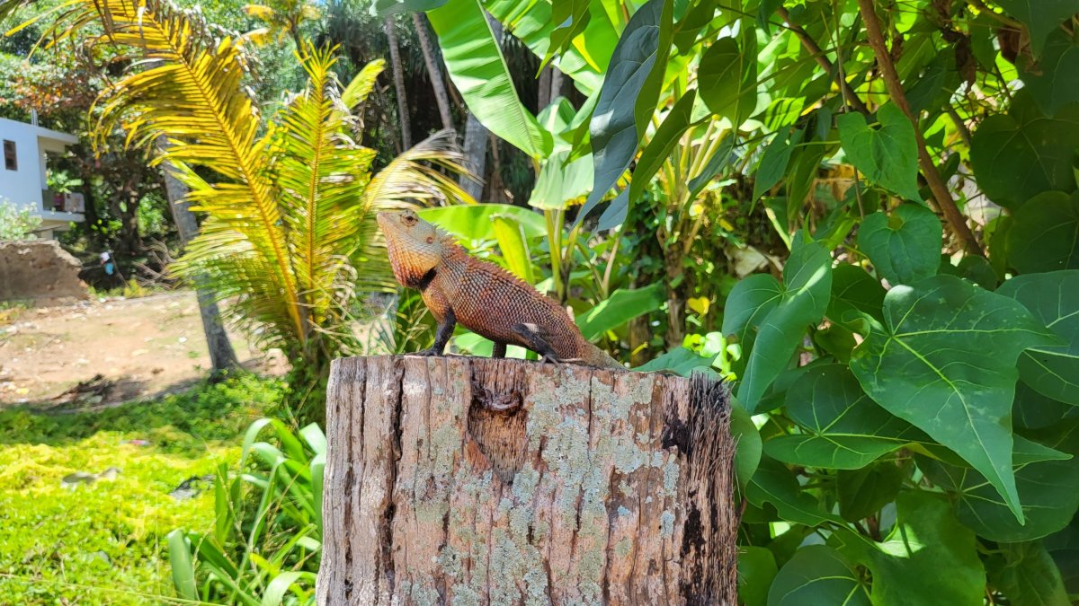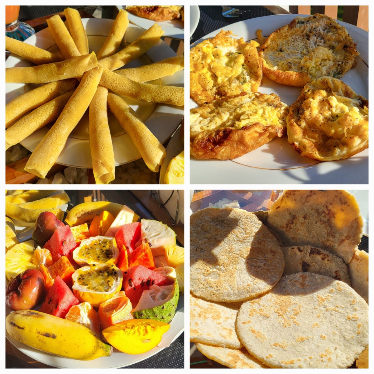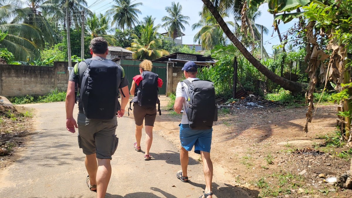 Na tomto místě jsme opravdu nečekali velikou snídani, ale Ajith s manželkou nám připravili plný stůl domácích dobrot: moje oblíbené plněné pálivé palačinky, kokosové placky, 4 vejce!, toasty, ovoce, džem, máslo!, kávu i čaj. Dnes si ale jídlo tolik jako jindy neužíváme. Myslíme na to, že Ajithova rodina bude mít dnes zase jen 2x rýži a ty veselé děti ze včerejší procházky ani to. Zbytky bychom si normálně vzali na cestu, ale tady poprvé hodně jídla necháváme. Víme, že nic z toho Ajith nevyhodí.