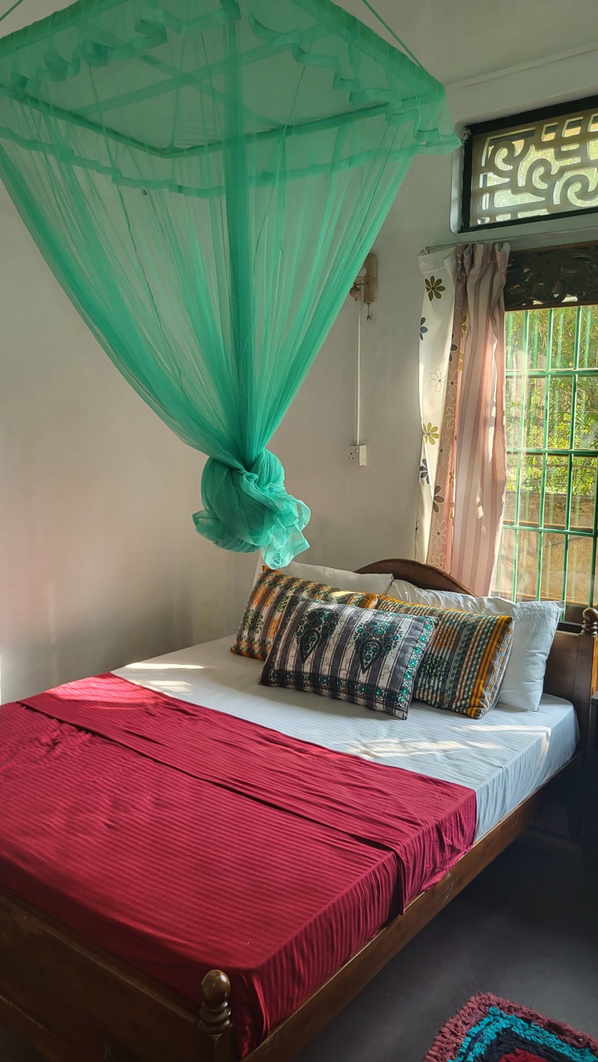 V Kandy bydlíme zase mimo centrum v tradičním srílanském domě u starší, moc hodné paní. Celý její krásný dům máme k dispozici. Voňavé povlečení, veliká koupelna, 100% čisto, cejlonský čaj s kardamonem, ale nejvíc jsem nadšená z terasy! Já jsem na terasy/balkony/lodžie ulítlá, vlastně podle nich často vybírám celé ubytování, no a tahle terasa se mi opravdu povedla :) Plynule navazuje na obývák a je ve stínu pod střechou, tak se využívá celoročně. Zase úplně jiný styl ubytování a zase je tu moc příjemně a ani ten bazén nám nechybí. Za celý dům se 2 ložnicemi a snídaní platíme ve čtyřech jen 1056 Kč.