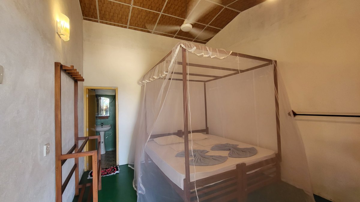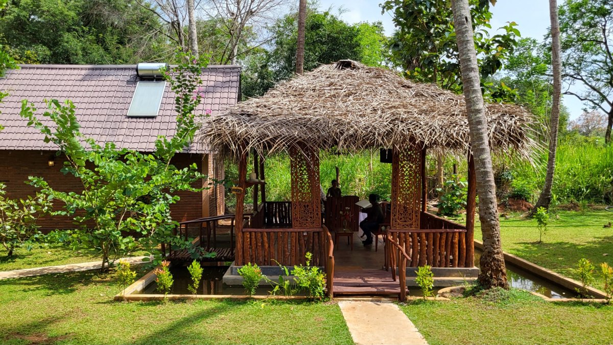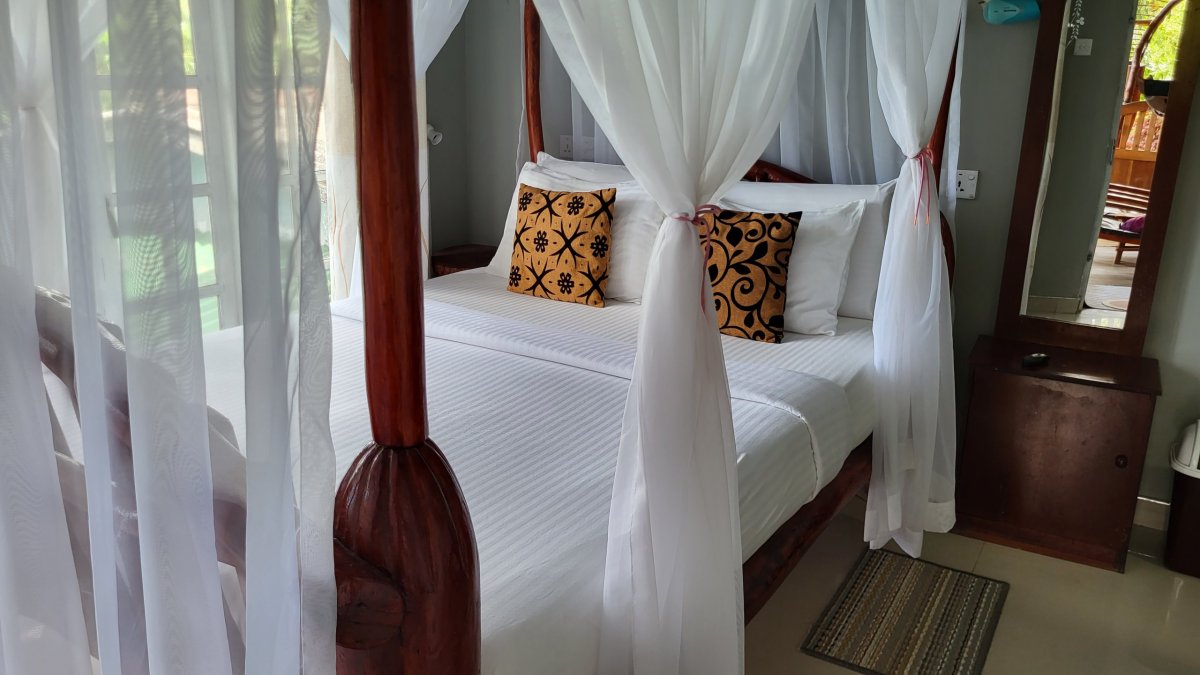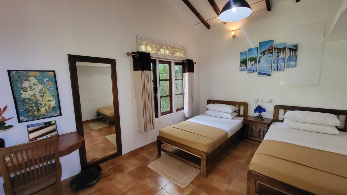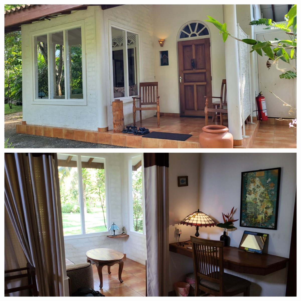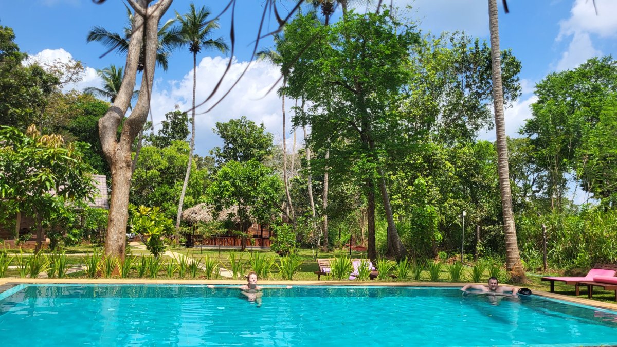 Kenath nám ukazuje naše 2 krásné a perfektně uklizené chatky s úžasnými verandami a krásnými detaily uvnitř. Bazén je na Srí Lance nutnost, ale tady je voda až moc teplá. Před večeří si bereme místní kola (zdarma) a jedeme se projet po okolí, rozdáváme poslední úsměvy i bonbóny. Poslední večeře je taky jiná než ty předchozí a poprvé dostáváme i zmrzlinu. Ráno nás Kenath odveze na letiště a 14. den letíme přes Istanbul domů.