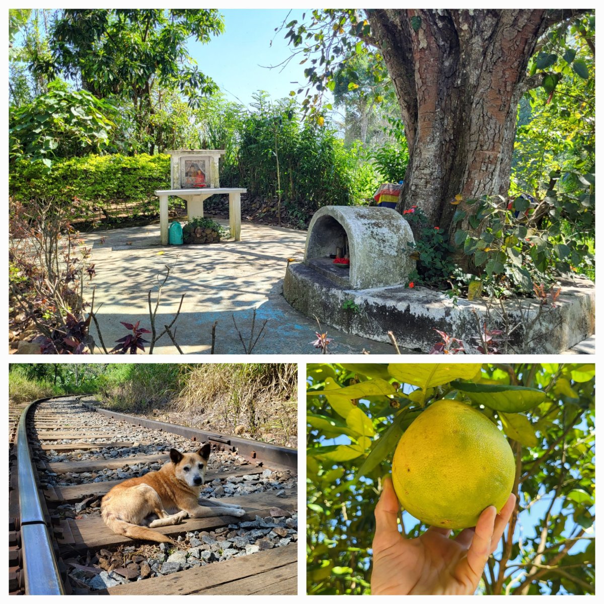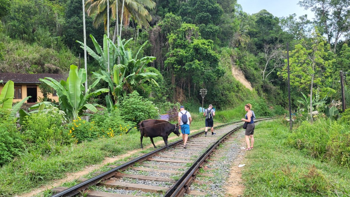 Imantha nám na dolní terasu donese kávu a čaj (srílanské kafe se ale moc pít nedá), sušenky a banány a pak už vyrážíme na procházku. Jdeme pěšky 4 km po kolejích do centra Elly. Potkáváme místní, turisty, psy a krávy, všichni si tudy zkracují cestu. Kolem trati je několik nealko barů (asi ve 2 mají i pivo), malých a levných restaurací (i tady podávají rice&curry), přírodních modliteben a výhledy do krajiny jsou famózní!