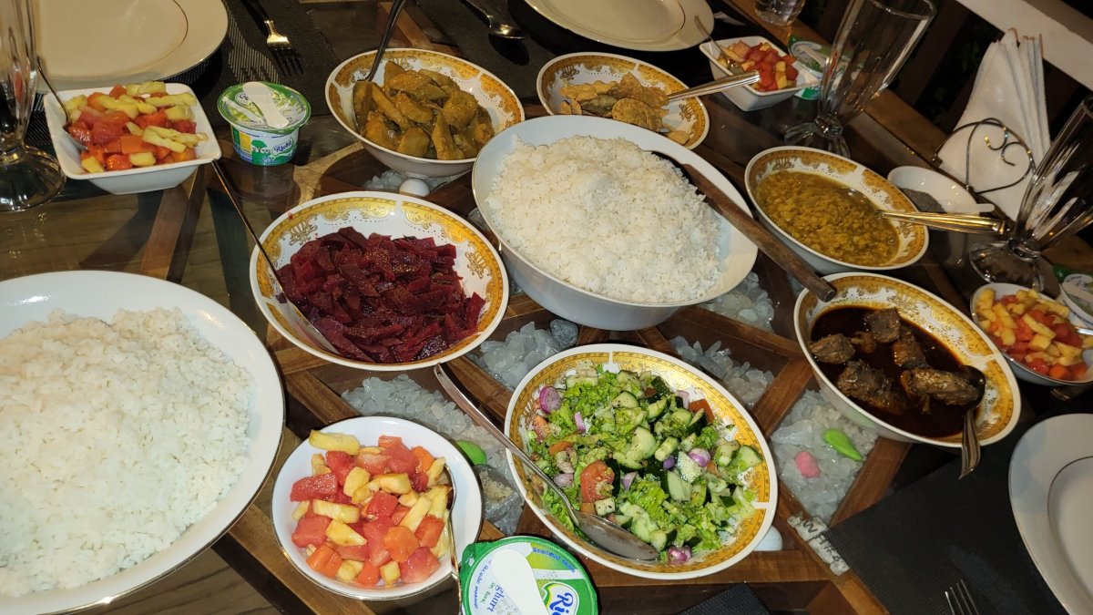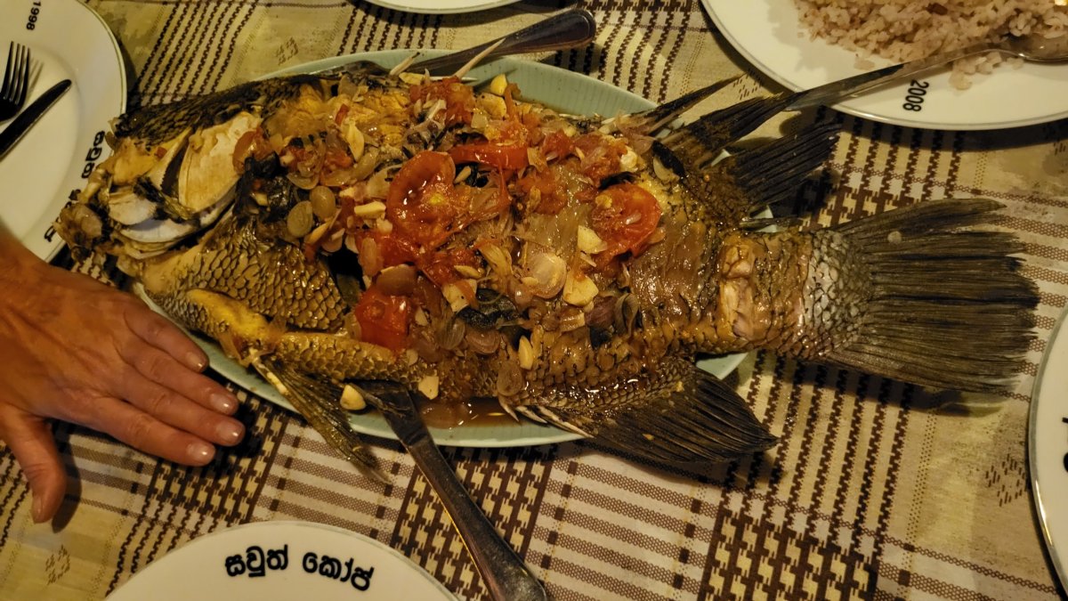 A "doma" nás čeká velké překvapení! Když si jinde koupíme polopenzi, většinou ji odfláknou, už je zaplacená, tak proč se s ní párat. Imantha to dělá jinak - dovedl polopenzi k dokonalosti :) Teprve tady ochutnáváme pravé, vynikající, voňavé, slovy nepopsatelné srílanské fish&curry. A protože jsme chtěli spicy, je všechno více či méně ostré. A protože máme velký hlad, dostáváme druhou mísu rýže (a další misku chilli). A taky jogurty, kdyby to na nás bylo moc ostré. To, co vypadá jako brambory, jsou curry banány (pálivé). To, co vypadá jako červená řepa, je červená řepa, ale výborná, protože je dobře dochucená. Ovocný salát je z papáji, melounu a ananasu. Vařila nám celá Imanthova rodina. Zatím nejlepší večeře na Srí Lance!