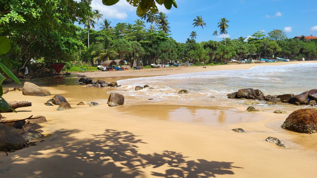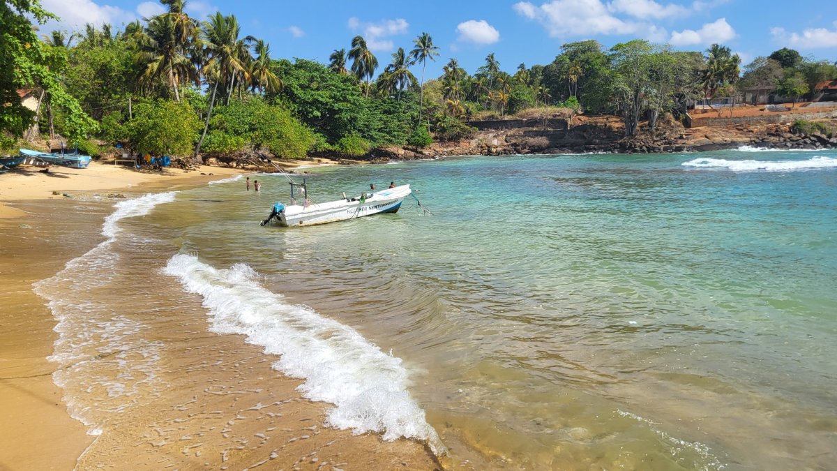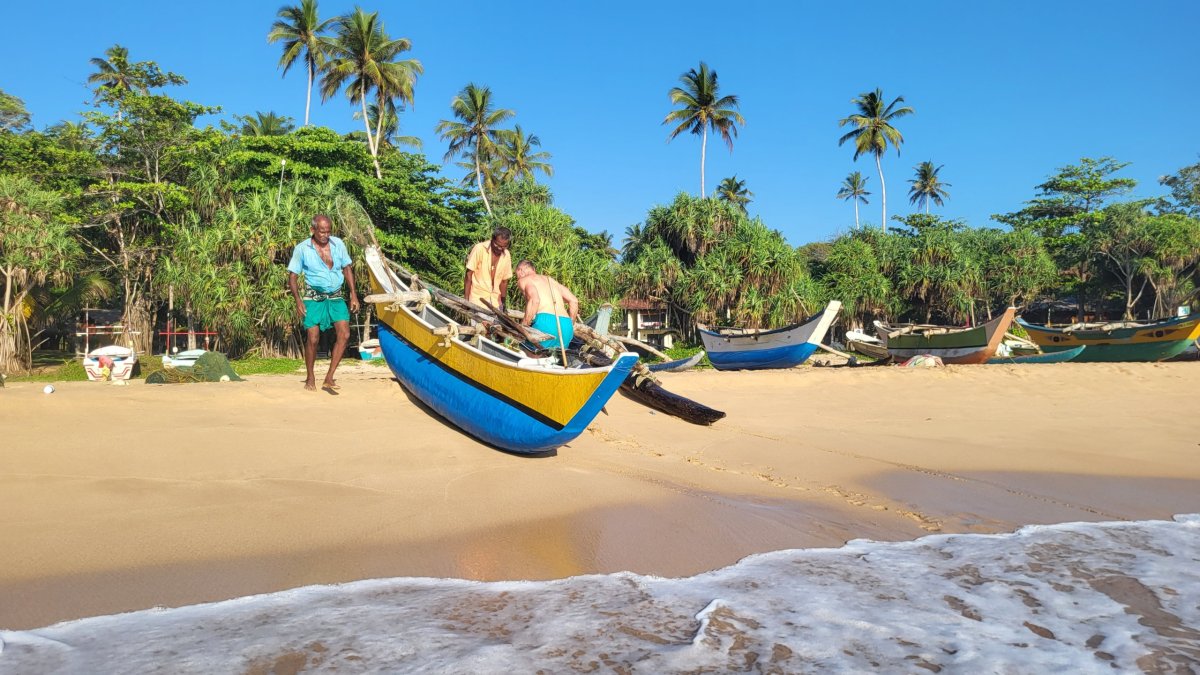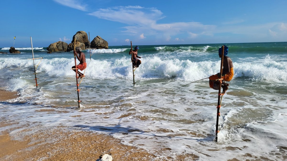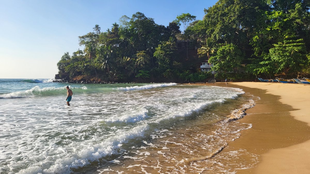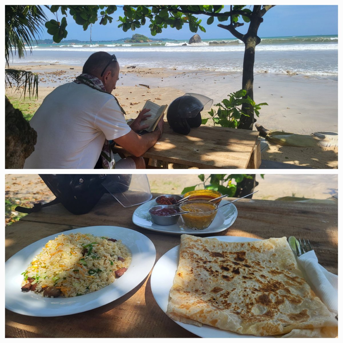 Zastavujeme se v rybářské vesnici Weligama a všude kolem nás jsou vidět i cítit ryby: čerstvé, sušené, i na talíři. Za pár korun si dáváme místní fresh juice a ani neřeším, z jaké je vody. Na pláži objevujeme malý dřevěný stánek a dáváme si vynikající rotti s chobotnicí, cibulí a sýrem! A jedeme se koupat! Vybírám Polhena Beach, jednu z nejhezčích pláží ostrova. Je neděle, na pláži je spousta místních rodin a všichni se pořád smějí. Ženy na Srí Lance nenosí plavky, koupou se oblečené.