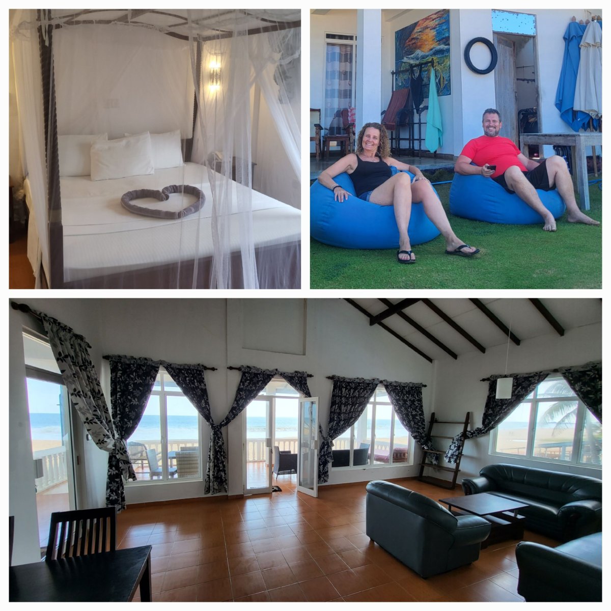 Autobus nám zastavuje přímo před ubytováním č.9 u pláže Hikkaduwa. Tady budeme bydlet další 2 noci v domě přímo na pláži. Je tu prostorný obývák, veliká kuchyň (kterou nepoužijeme), 3 ložnice, nová koupelna a hlavně: obrovská terasa s výhledem na Indický oceán a spoustou míst k sezení, já okamžitě zabírám postel. Stačí sejít 22 schodů a jsme na pláži...