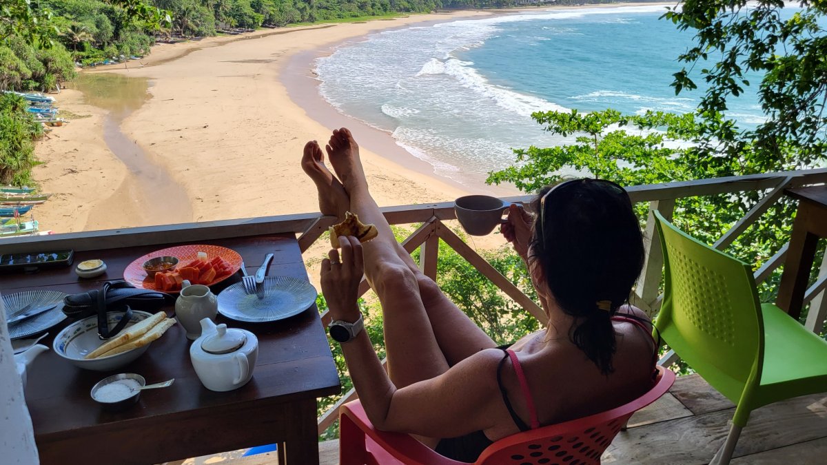 Snídaně v Talalle je podobná i veliká jako jinde, tady navíc s výhledem a velikou konví kafe a čaje (asi tady dočasně přejdu na čaj :) ). A čeká nás nejhezčí den na Srí Lance, protože...