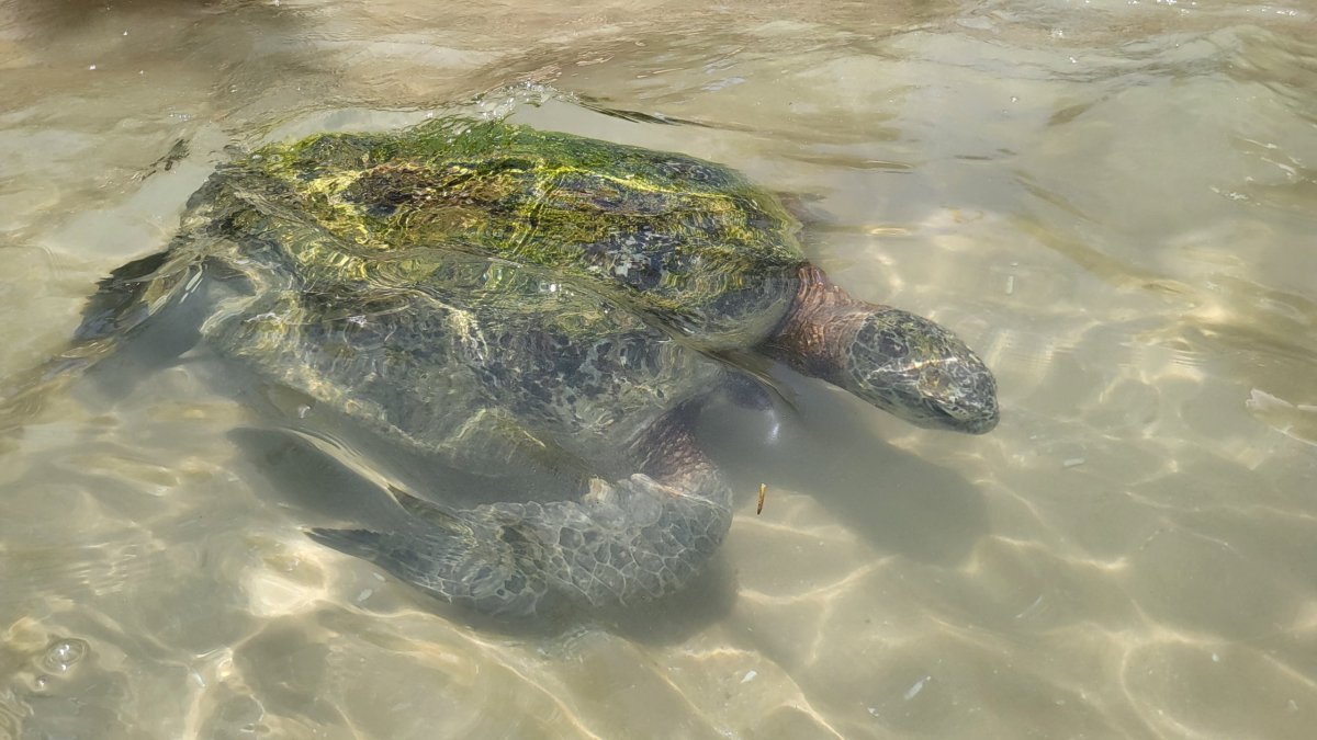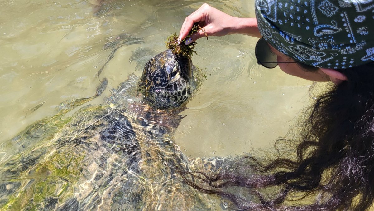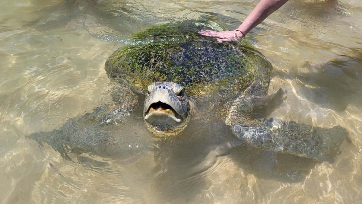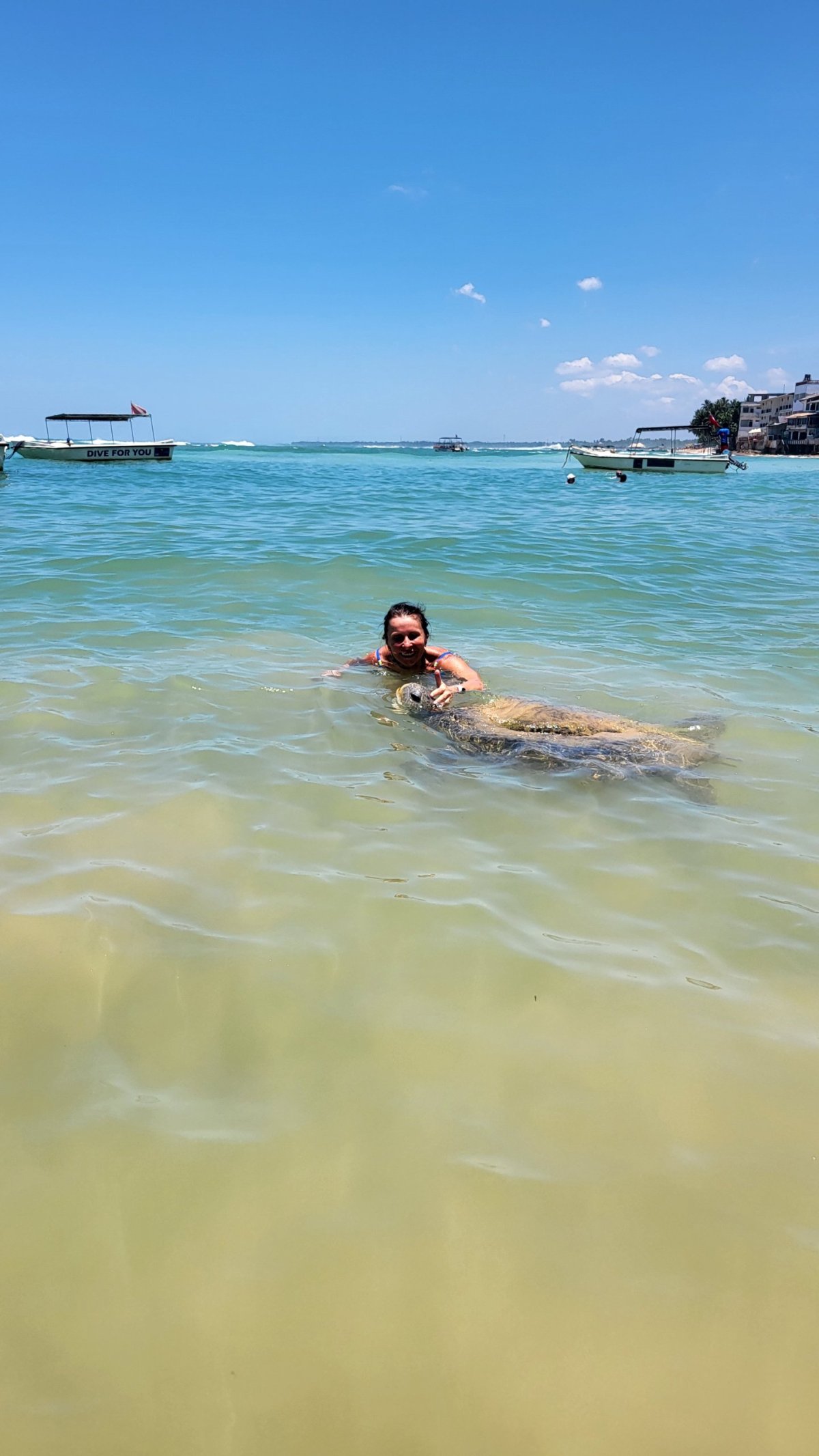 Po nepovedené snídani se jdeme projít na Turtle Beach. Luky plave, nikde ani želvička, jak se dalo podle názvu pláže očekávat, já hlídám doklady a peníze a pak se vyměníme, protože tady můžu plavat i já! :) Vrhám se do oceánu (vody po kolena) a najednou se vedle mě vynoří obrovská mořská želva! Jako vážně obrovská! A má spoustu zoubků! A za chvíli už je jich v zátoce 6! Někdo ječí, pár lidí z vody vybíhá, jiní naopak do vody běží, aby želvy viděli. Kareta obrovská měří až 1,5 m, váží až 300 kg a živí se hlavně mořskými řasami. A najednou se na pláži objevují prodavači s pytlíky mořských řas :) A želvy papají a nechají se krmit z ruky a hladit po krunýři :) Ani tady se ale očividně nejedná o trápení želv. Želvy připlují do zátoky zcela dobrovolně, kdy chtějí, na jak dlouho chtějí a stejně tak i zmizí. A já krmení nemám a stejně za mnou plavou i do hloubky! Myslím, že je to odměna za tu zachráněnou želvu :)