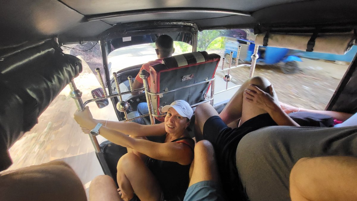 Pod Sigiriyi je to odtud jen 5 km, jsme rozhodnuti jít pěšky a nahoře počkat na západ slunce. Cestou ale zastavujeme u každé krávy a rostliny, volají na nás místní děti a s jednou holčičkou měníme bonbóny za její květinu. Nakonec si musíme vzít tuk-tuk, abychom stihli vstup (do 17 hod.). Místní tuk-tuky jsou prý pouze pro 2 a nechtějí nás brát všechny 4, ale tomuhle tuk-tukáři je to jedno a za pár korun nás veze všechny 4 až pod skálu. Nevím, jakou nosnost má tuk-tuk, ale my 4 máme určitě přes 330 kg :)