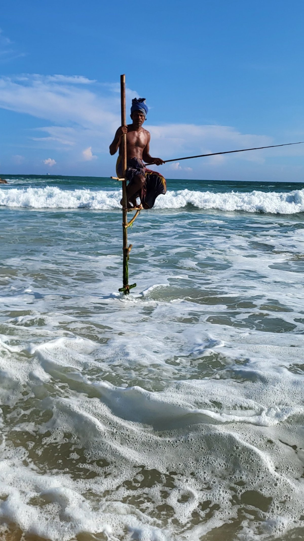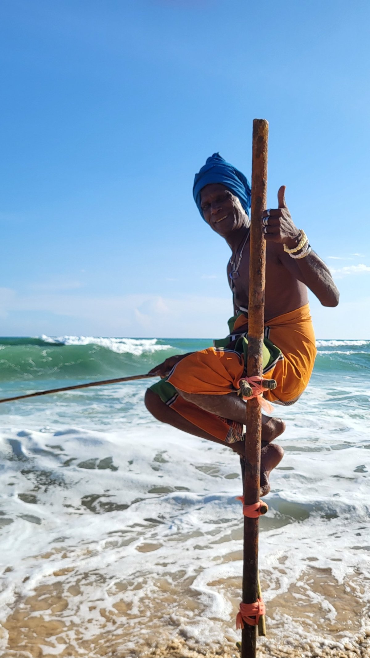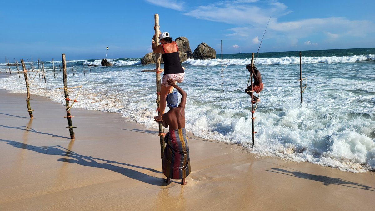 Rybáři na kůlech! I kvůli nim jsem chtěla tak dlouho na Srí Lanku. Rybářské kůly se dodnes dědí z otce na syna a nachází se jen v 1 oblasti ostrova. Dříve takto rybáři chytali malé rybky blízko břehu, ty měly ale hodně kostí a byly vhodné spíš na polévku. Dnes už tradiční rybáře na kůlech neživí ulovené rybky, ale turisté, kterým za pár rupií pózují a některým dovolí na kůl i vylézt. Ale aspoň se díky nim nezapomene na zdejší tradiční způsob lovu ryb. Chci na kůl vylézt sama, není to nic těžkého, a rybář si zase chce sáhnout na můj zadek, no nakonec jsme spokojeni oba :) Ještě mi podává udičku a už "chytám" :) Sezení není vůbec pohodlné a takhle dřív rybáři museli vydržet hodiny než ulovili oběd.
