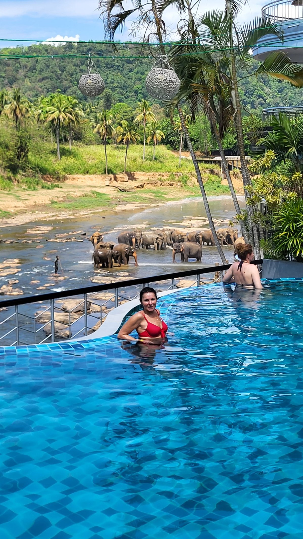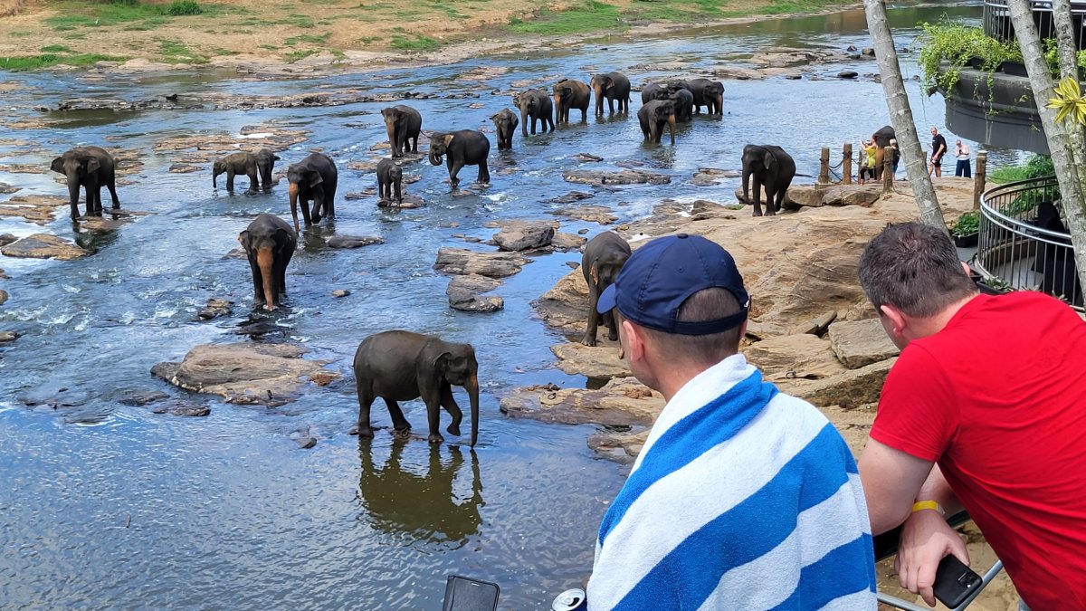Během dopoledne (až do checkoutu) se nám před očima vystřídá několik sloních stád. Pozorujeme je z bazénu, z restaurace, z teras pokojů i z ulice. Jedno stádo přejde celou řeku a 2 hodiny se krmí na druhém břehu. Ostatní si užívají koupel v řece i sprchování, 4 mláďata spolu dovádí i pod vodou, jen po utrápených slonech ani vidu.